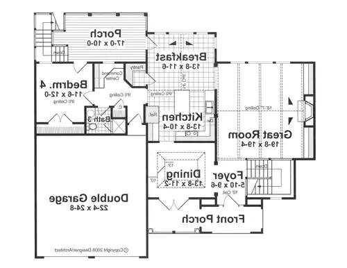 The foyer provides a vista into this spectacular truss ceiling great room, the focal point of this hillside design. A main floor bedroom and the breakfast nook share access to the deck providing the house accessibility to outside.