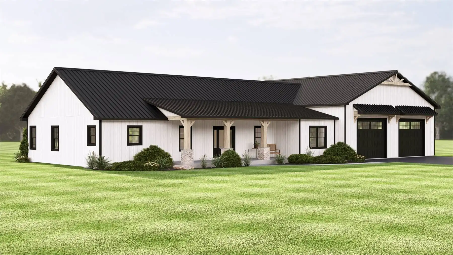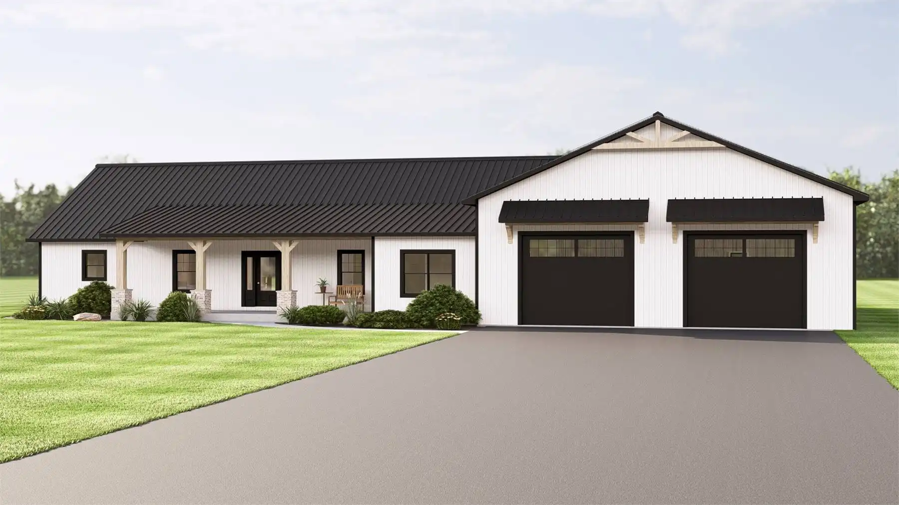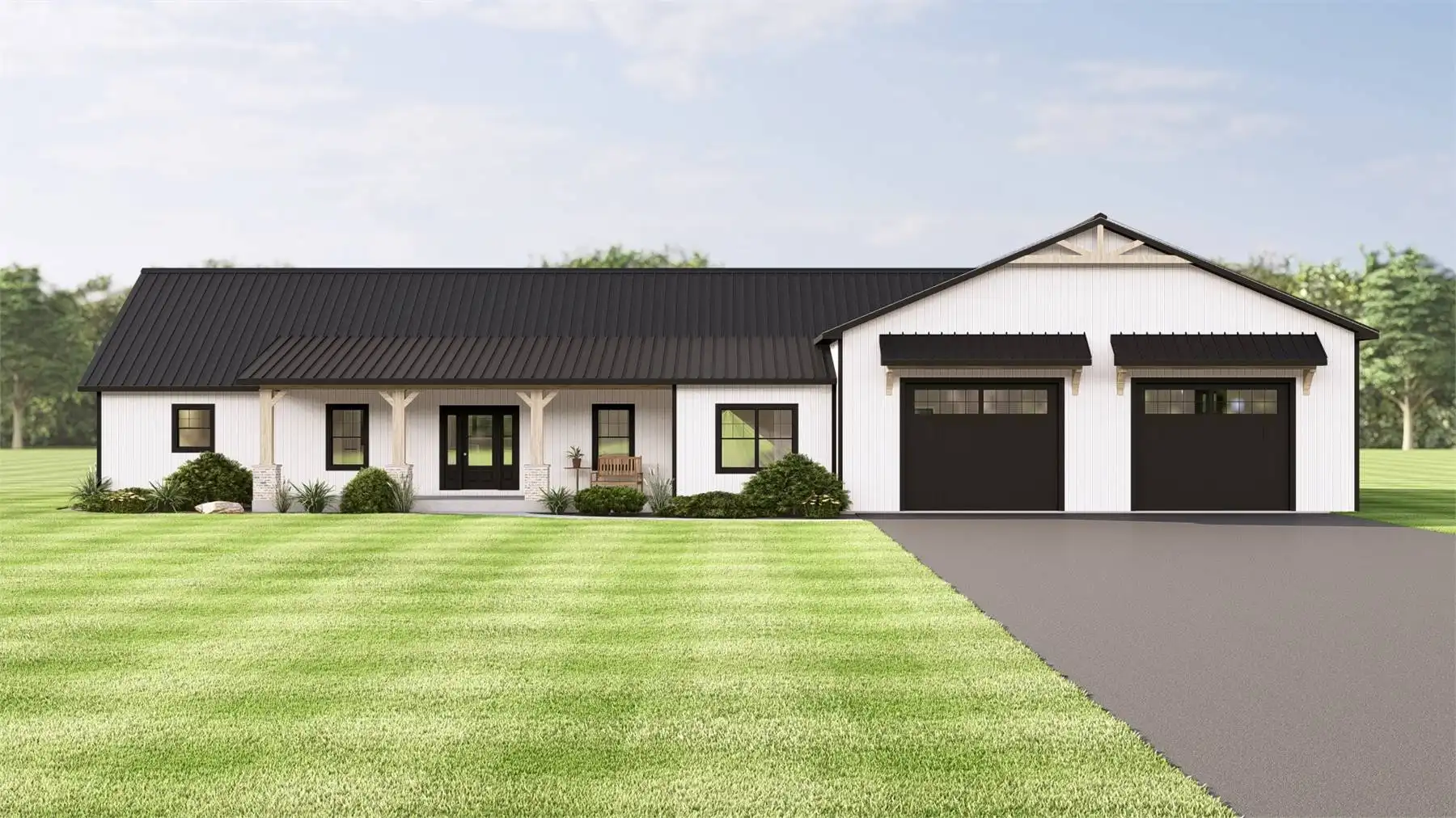 House Plan 11832 presents a refined contemporary barndominium designed for modern lifestyles. The open-concept main floor is highlighted by cathedral ceilings that create a bright, expansive feel throughout the living and dining areas. A spacious kitchen with an island and walk-in pantry supports both everyday routines and entertaining needs. The primary suite is located on the main level and includes a walk-in closet along with a bathroom featuring a separate tub and shower. Two additional bedrooms are thoughtfully placed in a split-bedroom configuration for enhanced privacy. A den, mudroom, and first-floor laundry add versatility and organization to the layout. Finished with a covered front porch, this home offers a balanced blend of modern style and practical living.