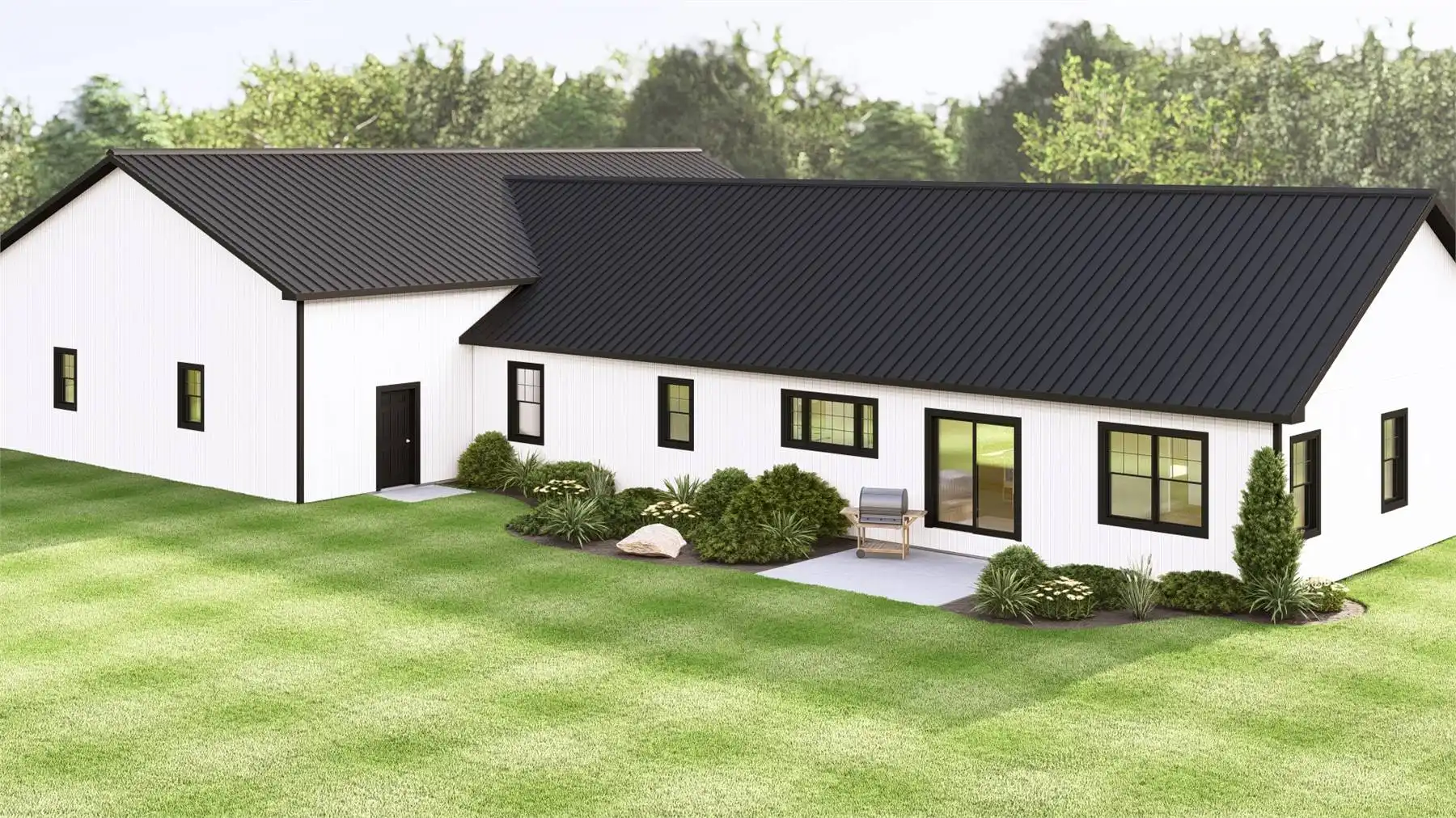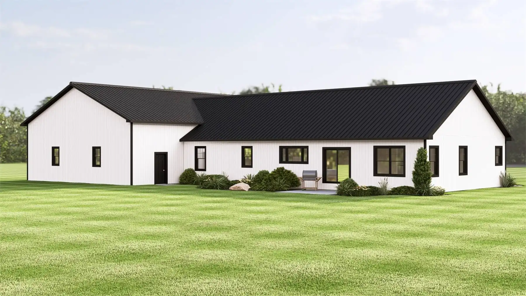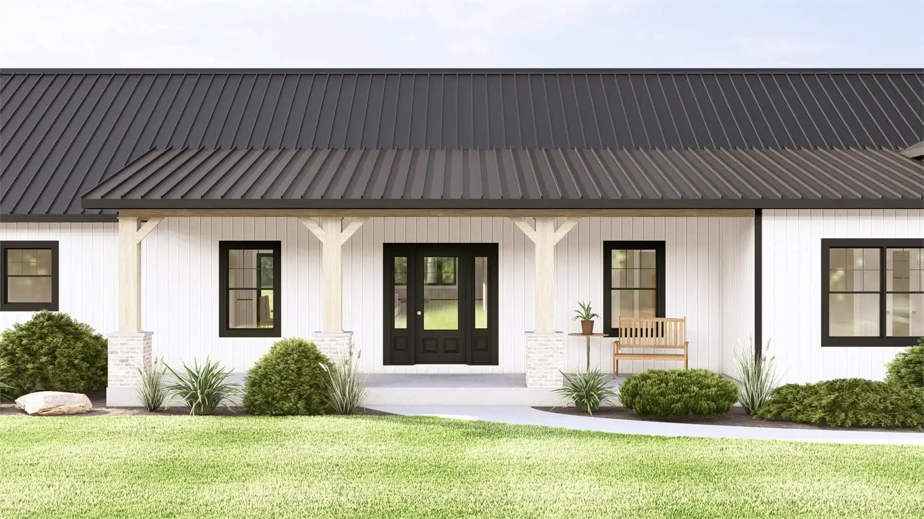 House Plan 11832 presents a refined contemporary barndominium designed for modern lifestyles. The open-concept main floor is highlighted by cathedral ceilings that create a bright, expansive feel throughout the living and dining areas. A spacious kitchen with an island and walk-in pantry supports both everyday routines and entertaining needs. The primary suite is located on the main level and includes a walk-in closet along with a bathroom featuring a separate tub and shower. Two additional bedrooms are thoughtfully placed in a split-bedroom configuration for enhanced privacy. A den, mudroom, and first-floor laundry add versatility and organization to the layout. Finished with a covered front porch, this home offers a balanced blend of modern style and practical living.