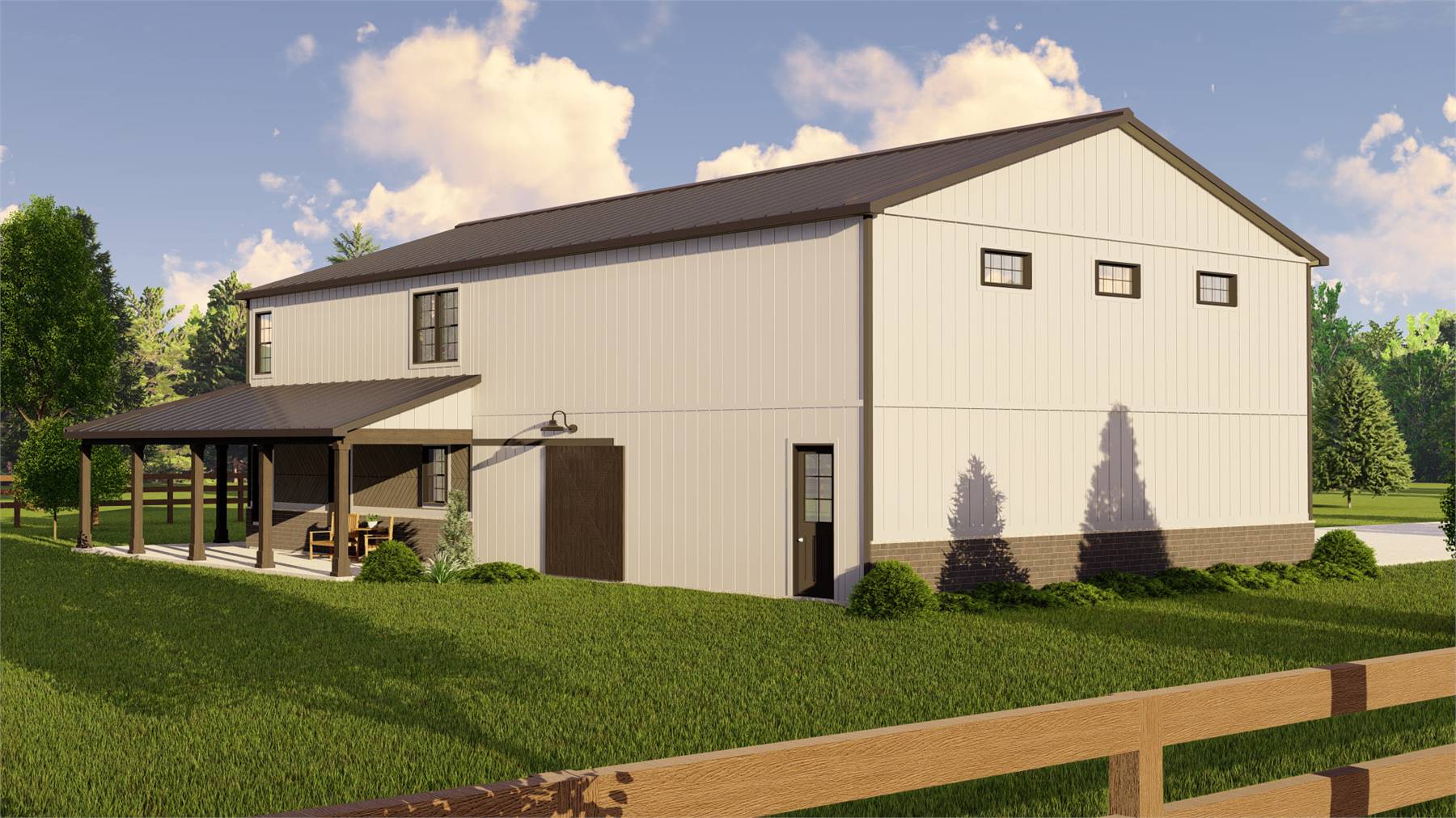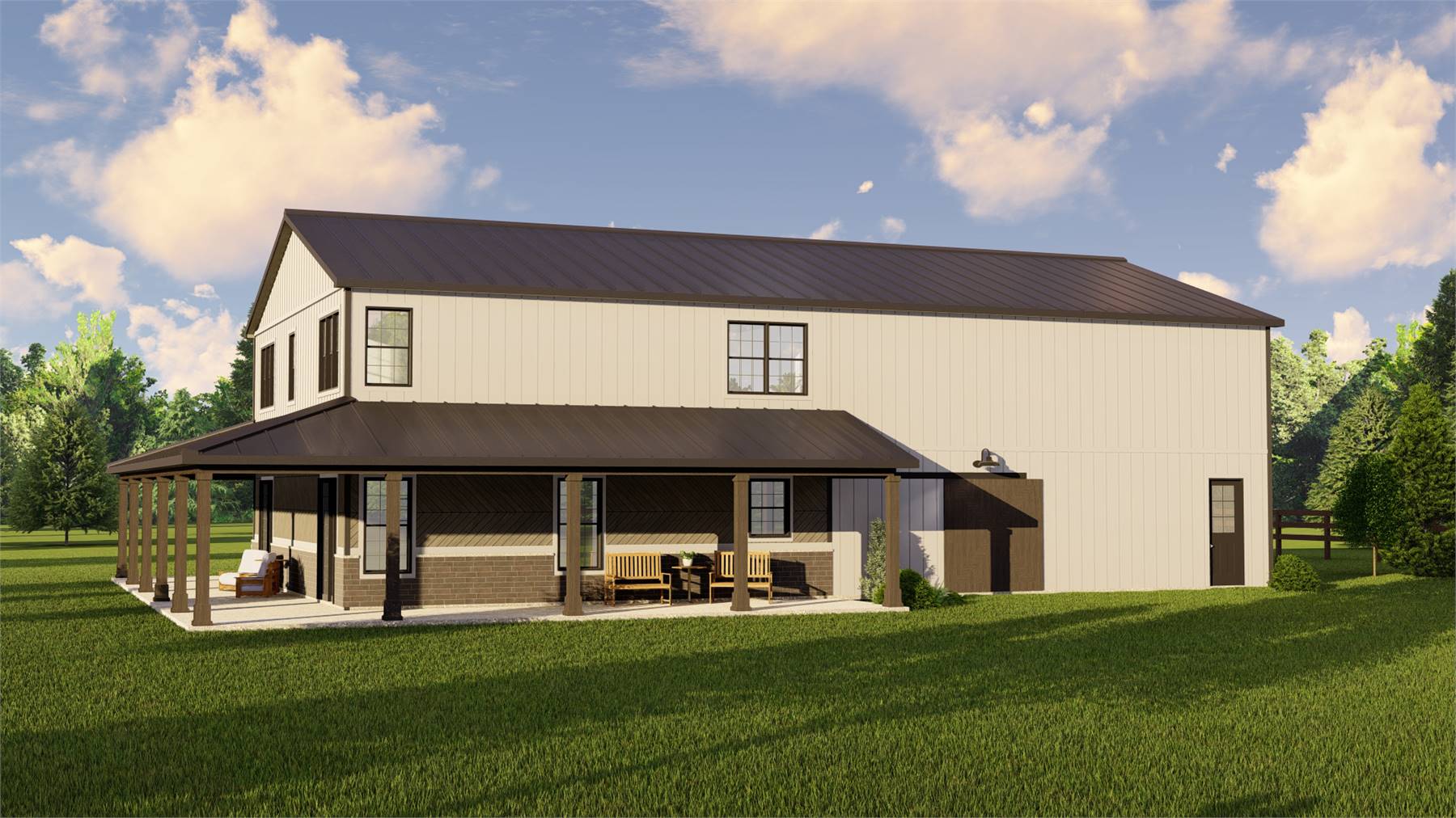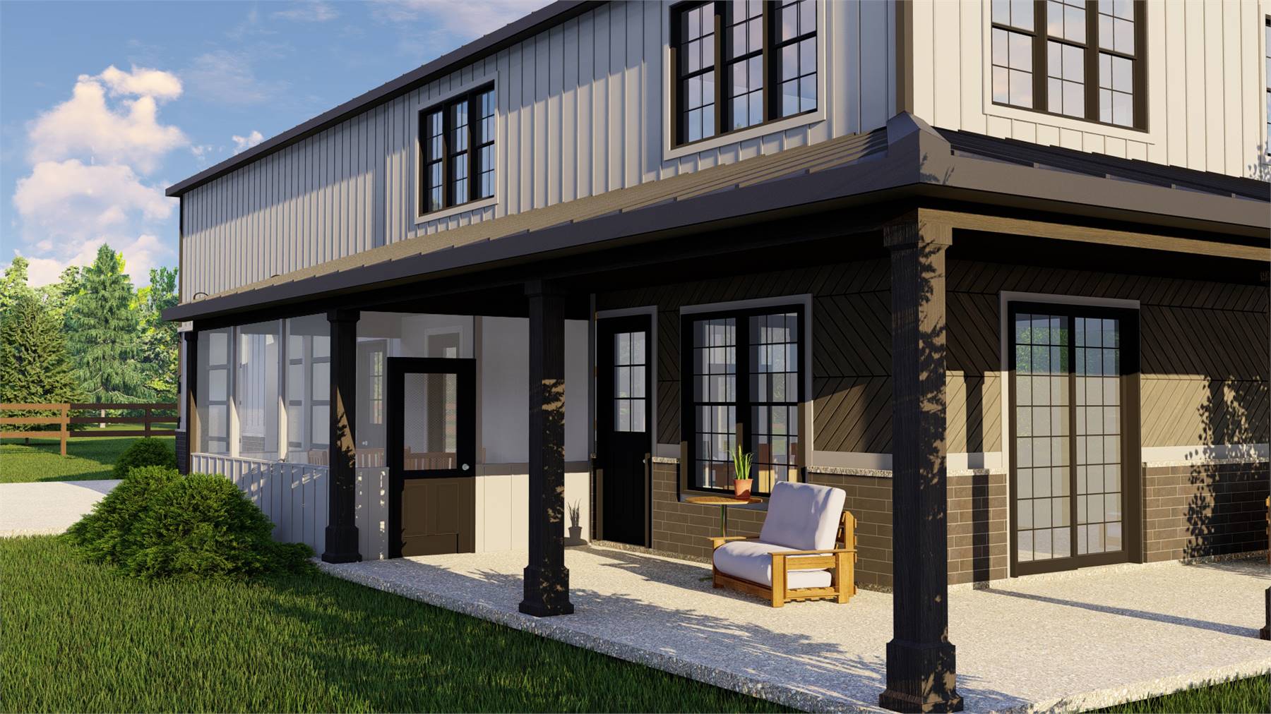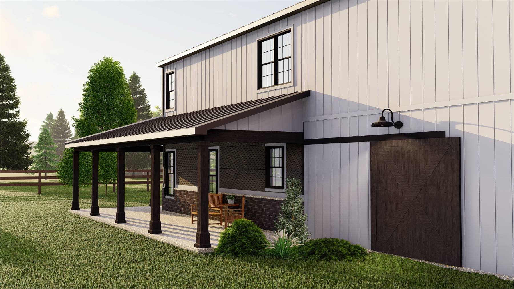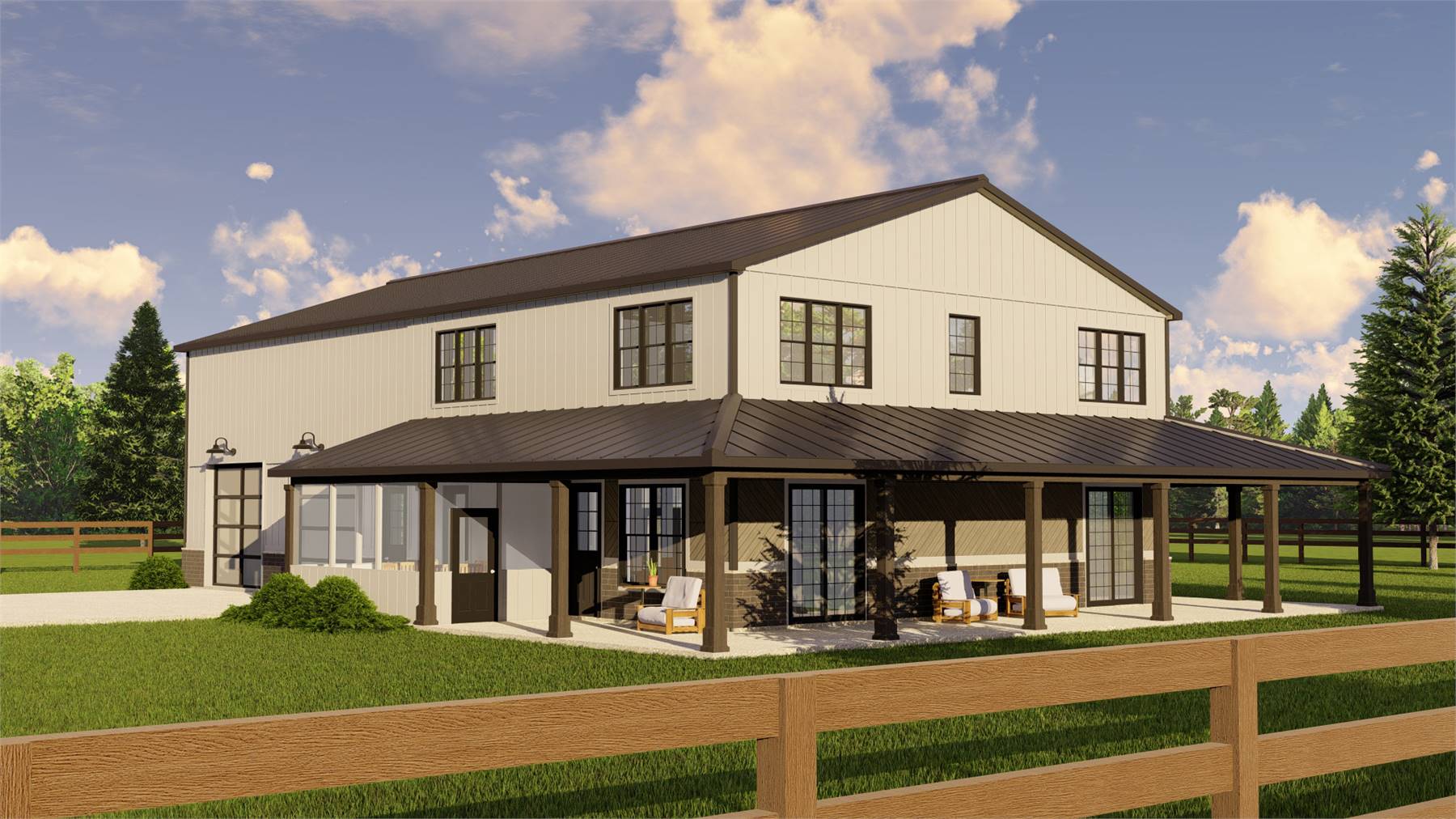 House Plan 11864 delivers a flexible barndominium layout with 2,311 square feet of heated living space spread across two levels. The open-concept main floor centers around a vaulted great room that enhances natural light and creates a spacious feel throughout the living area. The kitchen includes an island, pantry, and adjacent dining space, making it ideal for entertaining or casual meals. A main-level primary suite provides privacy and convenience, complete with a walk-in closet and a well-appointed bathroom. Upstairs, two additional bedrooms share access to a full bath, while a loft and dedicated home office add valuable flex space. Multiple outdoor living areas—including covered and screened porches—extend the home’s usable space and connection to the outdoors. With its oversized, side-entry garage and barndominium styling, this plan is well suited for homeowners seeking storage, flexibility, and modern country character.