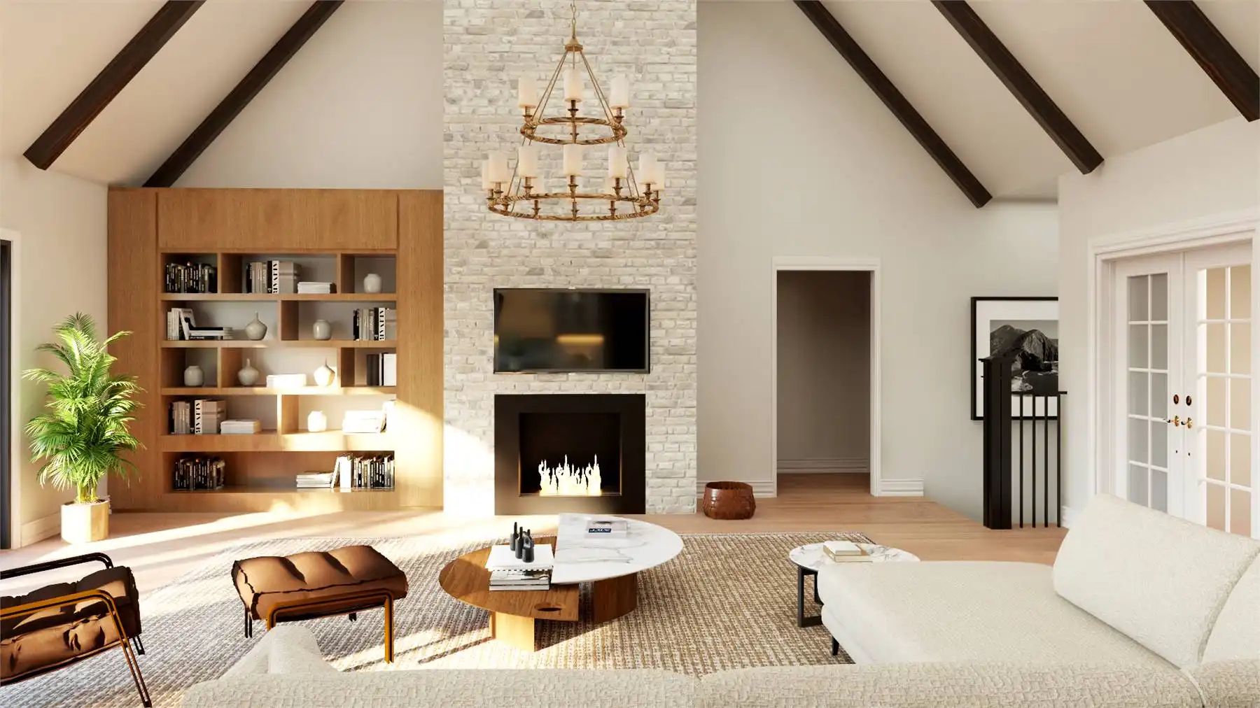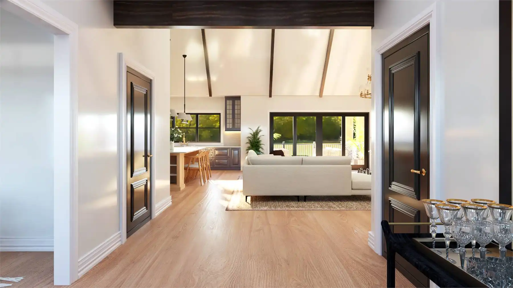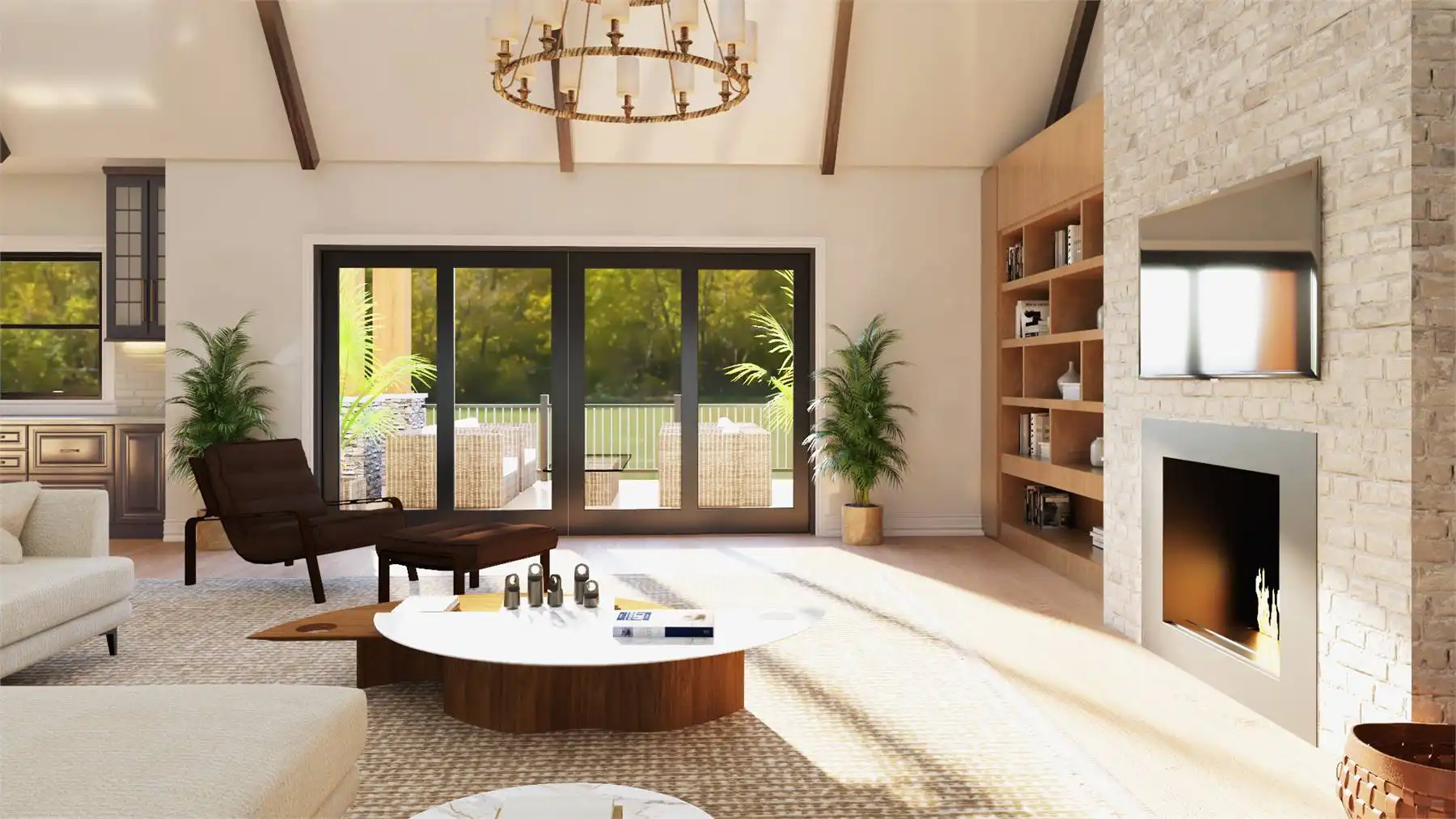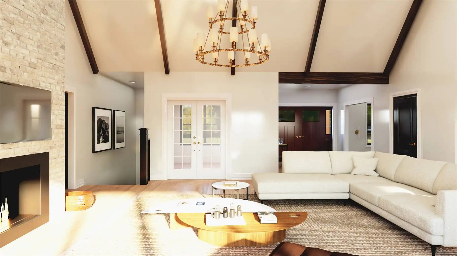 With 3,086 square feet of heated living space, this home delivers generous room sizes and a well-balanced layout designed for modern family living. The family room and great room provide multiple gathering spaces, anchored by a fireplace and enhanced by vaulted ceilings. The kitchen blends function and style with an island, L-shaped counters, butler’s pantry, and walk-in pantry that make hosting and meal prep effortless. A private home office and exercise room add flexibility for work, wellness, and hobbies. The primary bedroom on the main level offers a peaceful retreat with a walk-in closet and a well-appointed bath featuring double vanities and a separate tub and shower. Additional bedrooms are split from the primary suite to maintain privacy throughout the home. Covered porches and an outdoor living area, along with a deck, complete the design with welcoming spaces for enjoying time outdoors.