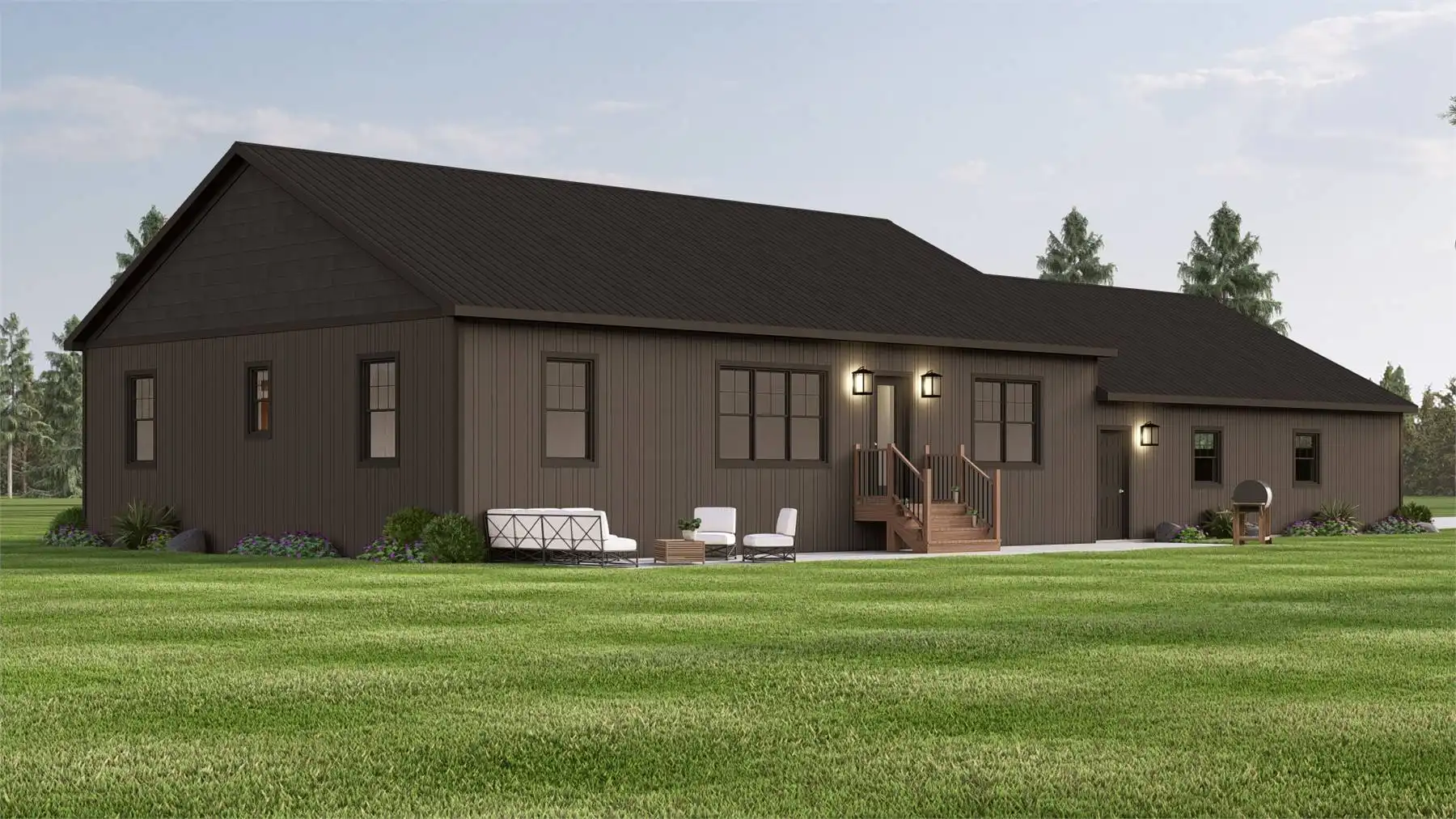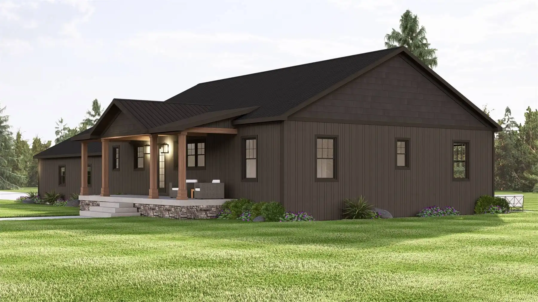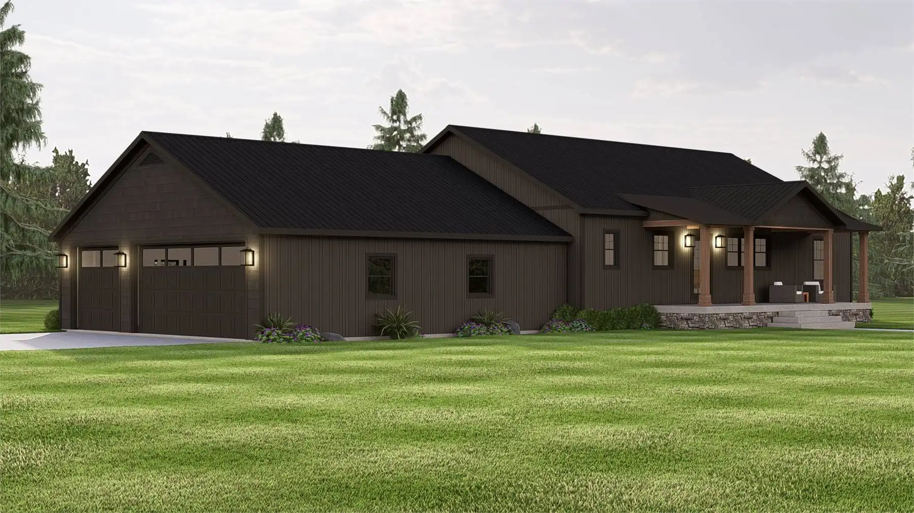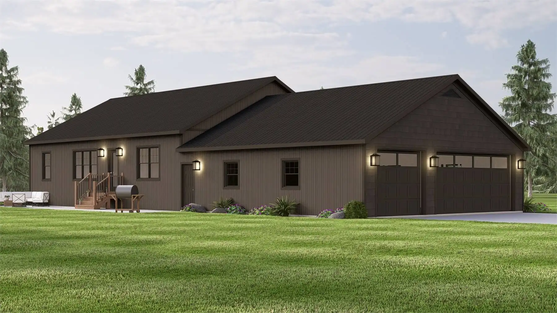House Plan 11897 pairs rustic country style with a smart ranch layout and room to expand below. The open main level makes daily life easy, with a great room that flows into an L-shaped kitchen and dining space. A split bedroom arrangement keeps the primary suite quiet and private, featuring a walk-in closet and a bathroom with dual vanities plus a separate tub and shower. Two secondary bedrooms share a full bath on the opposite side—great for kids, guests, or a home office setup. A mudroom entry and main-level laundry help keep everything organized, and the nearby half bath is perfect for visitors. Outdoor living is built in, thanks to a covered front porch and an extra-large rear patio for entertaining. The attached side-entry 3-car garage adds serious storage and work space. When you’re ready, the unfinished lower level offers a blank canvas for future rooms, recreation, or storage.