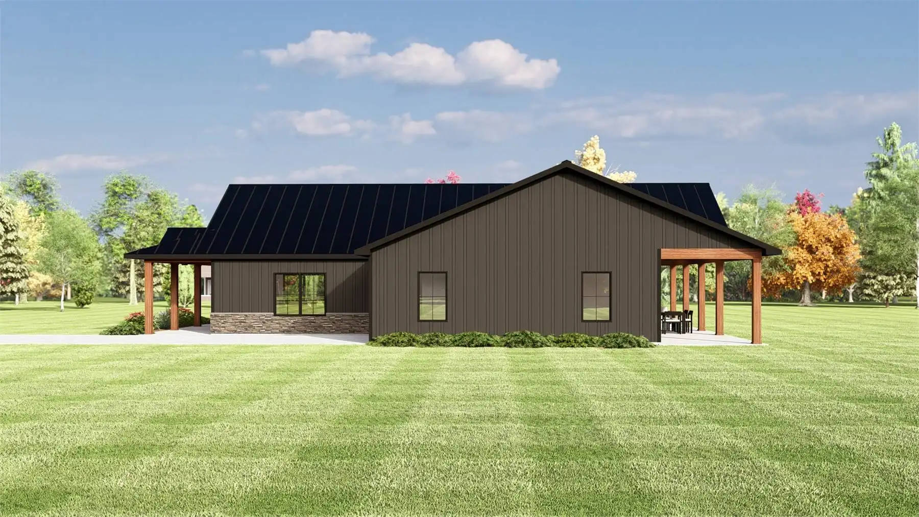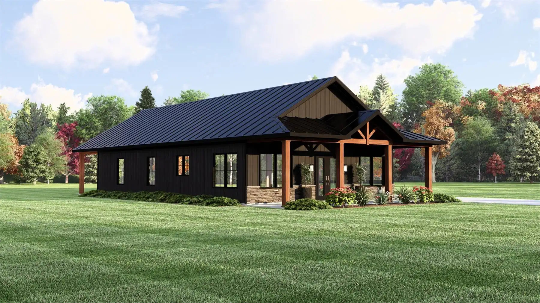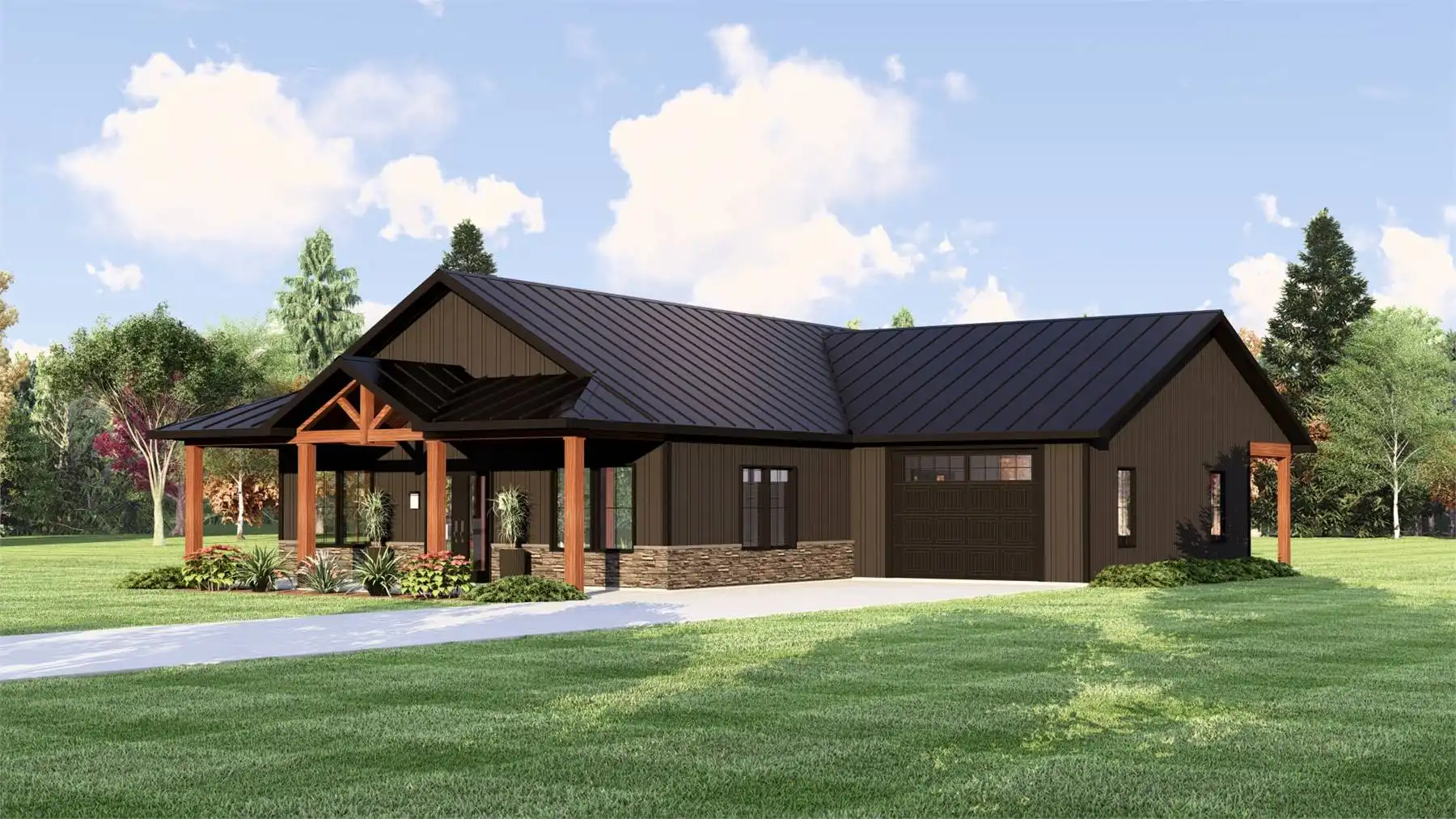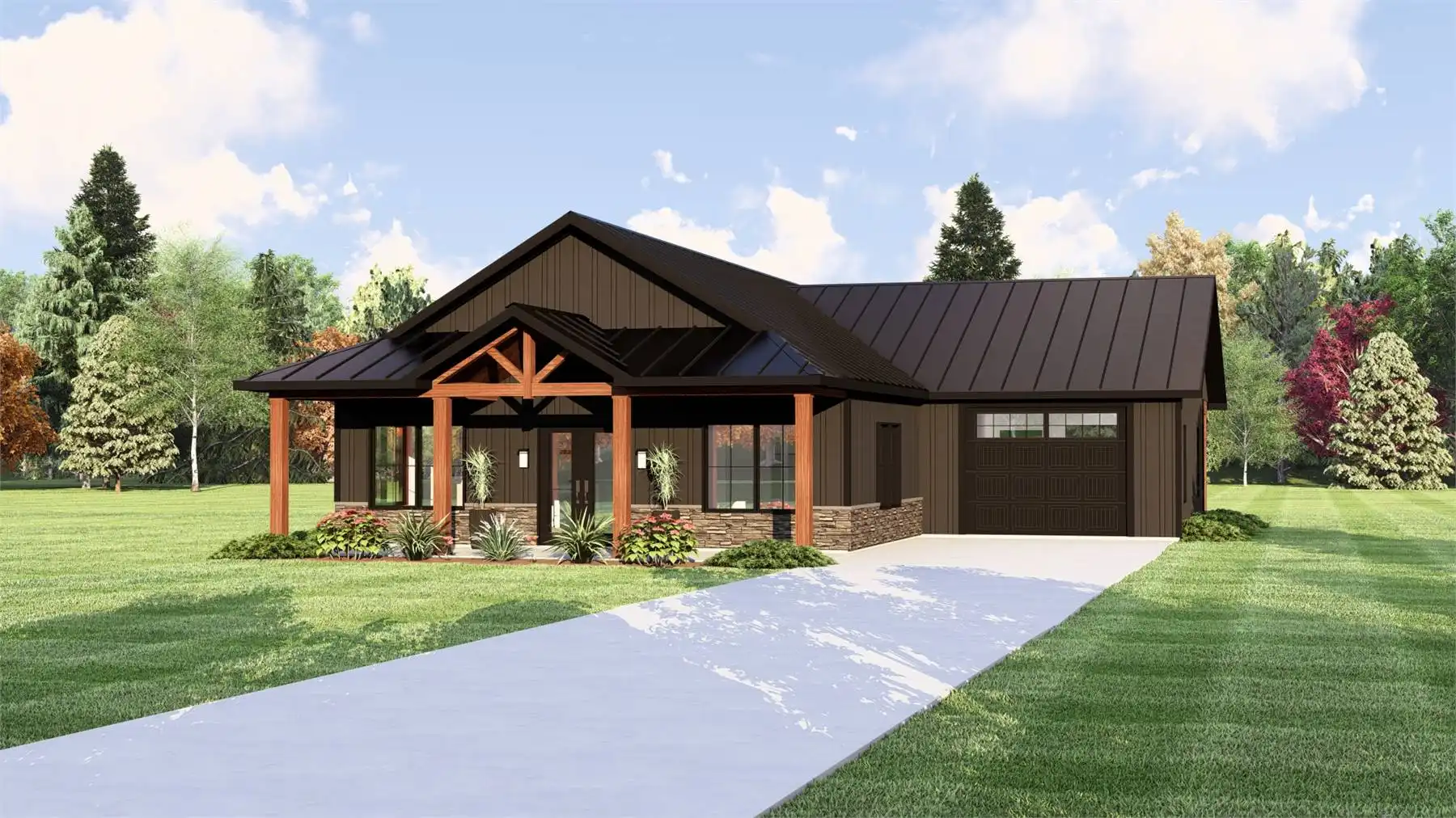 House Plan 11899 is a thoughtfully designed ranch home offering 1,440 square feet of comfortable, easy living, making it an ideal choice for retirement, downsizing, empty nesters, or a first home. The open floor plan seamlessly connects the living room, dining area, and L-shaped kitchen, creating a bright and welcoming space highlighted by a sloped ceiling that adds warmth and dimension. Located at the rear of the home for added privacy, the primary bedroom features a spacious ensuite with dual sinks, a separate soaking tub and shower, and a large walk-in closet. A one car garage provides everyday convenience, while the expansive covered rear porch spans the full width of the home, extending the living space outdoors and offering a relaxing spot to enjoy every season.