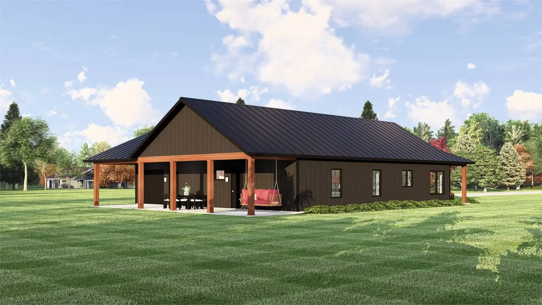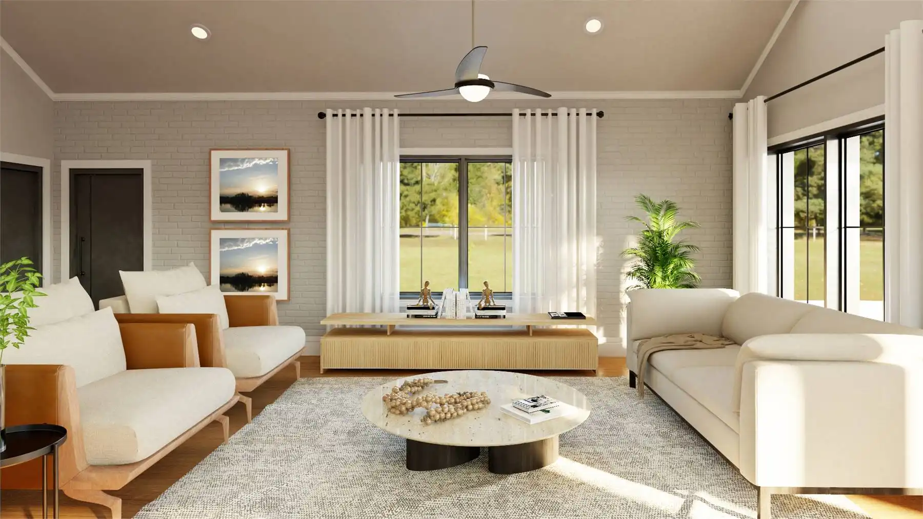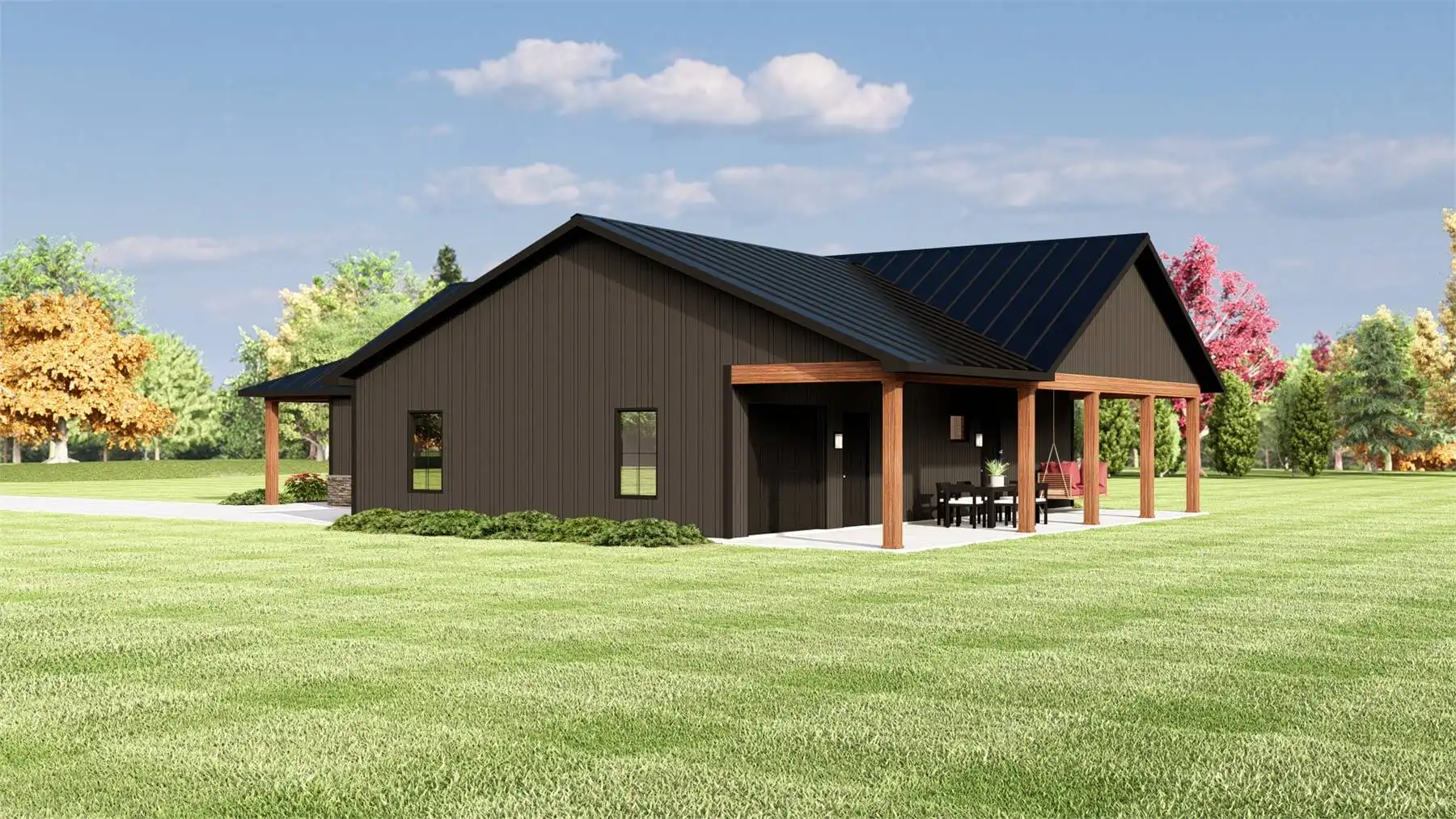 House Plan 11899 is a thoughtfully designed ranch home offering 1,440 square feet of comfortable, easy living, making it an ideal choice for retirement, downsizing, empty nesters, or a first home. The open floor plan seamlessly connects the living room, dining area, and L-shaped kitchen, creating a bright and welcoming space highlighted by a sloped ceiling that adds warmth and dimension. Located at the rear of the home for added privacy, the primary bedroom features a spacious ensuite with dual sinks, a separate soaking tub and shower, and a large walk-in closet. A one car garage provides everyday convenience, while the expansive covered rear porch spans the full width of the home, extending the living space outdoors and offering a relaxing spot to enjoy every season.