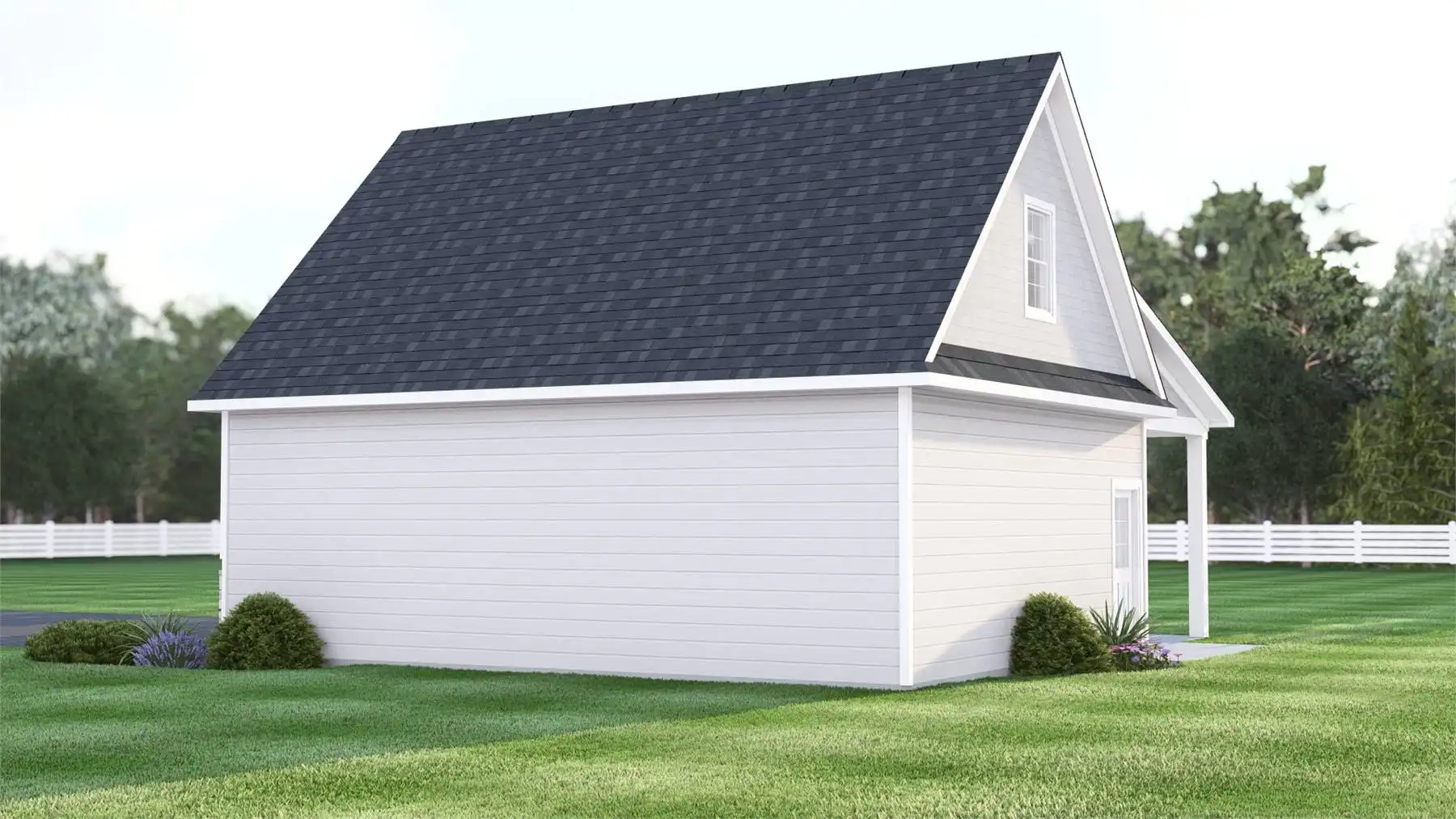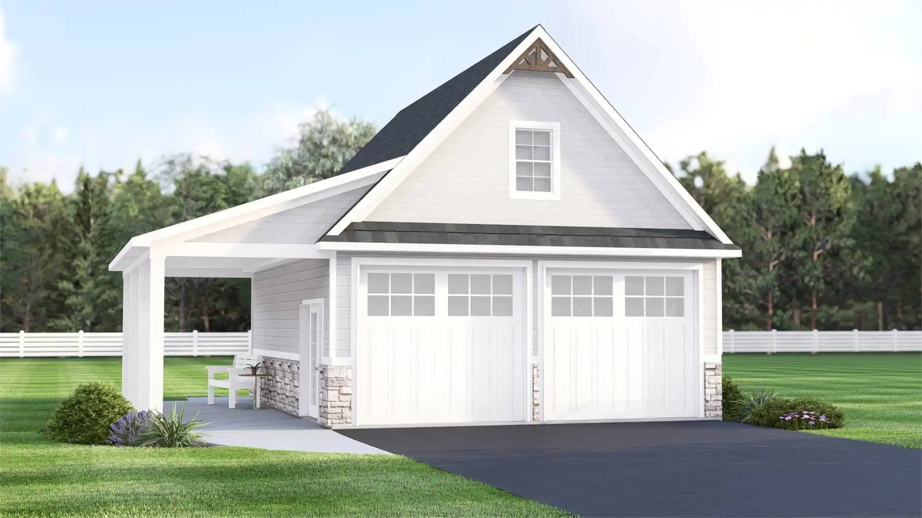 This 1,363 square foot (including porches) cottage-style garage plan is an ideal solution for homeowners in need of extra storage and flexible utility space. The exterior features two garage doors for easy vehicle access, along with two service doors that enhance functionality and convenience. A covered porch adds charm while providing sheltered entry.