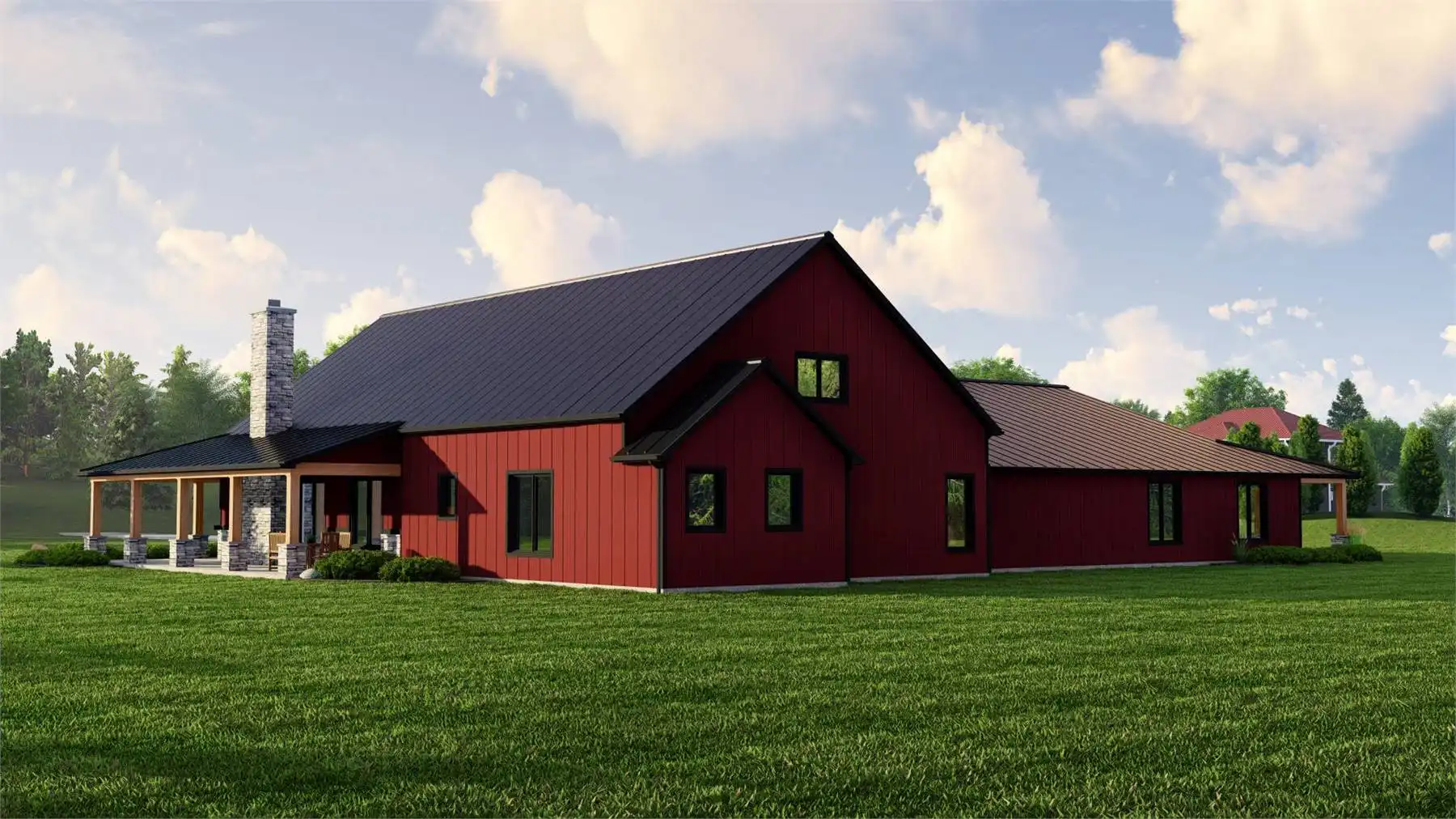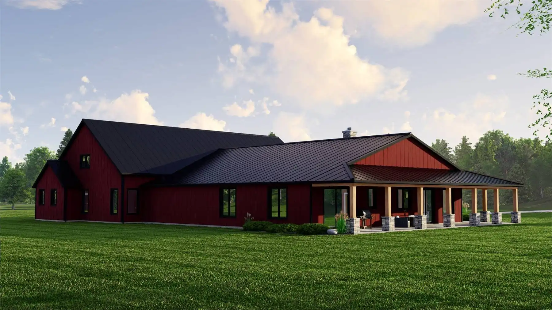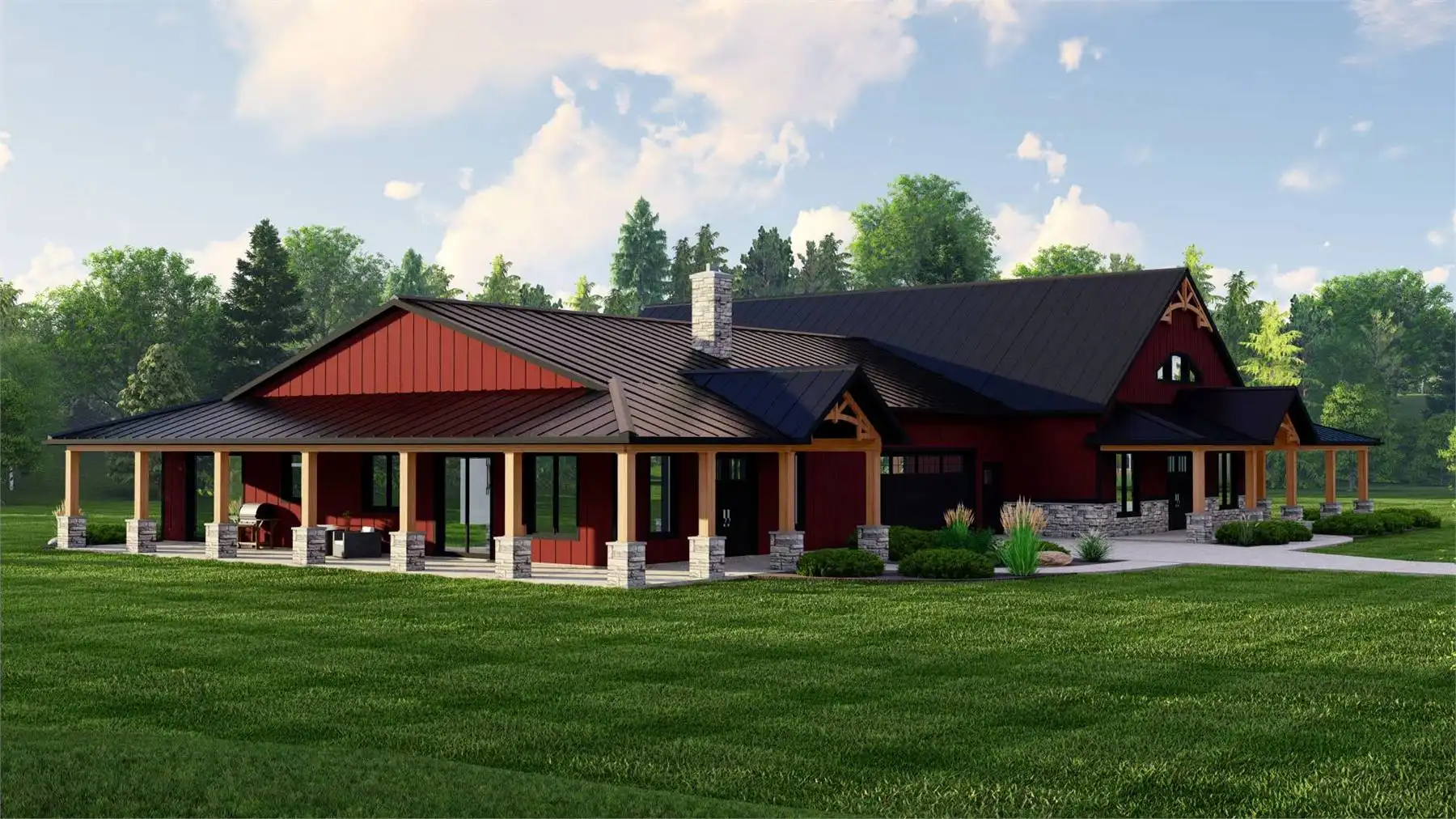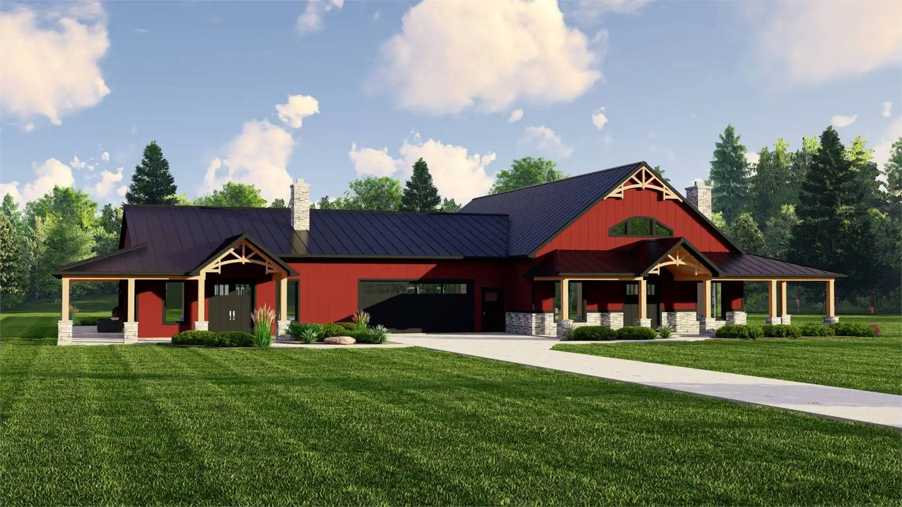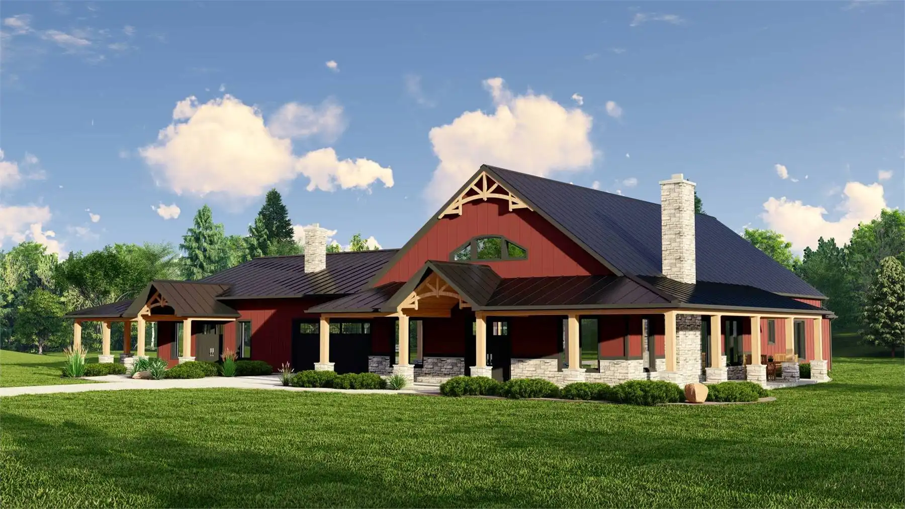House Plan 11914 delivers a bold barndominium layout designed for flexibility, privacy, and real-world functionality. At the heart of the plan sits a large central garage, acting as a connector between two distinct living zones rather than a shared living room. One side of the home features a spacious open-concept great room with cathedral ceilings, a large kitchen with island and pantry, and nearby dining space—perfect for gatherings and everyday living. The opposite wing functions as a self-contained living area with its own kitchen, great room, bedroom, and bathroom, making it ideal for extended family, guests, or rental potential. Multiple primary suites, a dedicated home office, mudroom, and ample storage add to the home’s versatility. With generous covered porches and outdoor living areas, this design offers a modern, flexible solution for multi-family or multi-generational households.