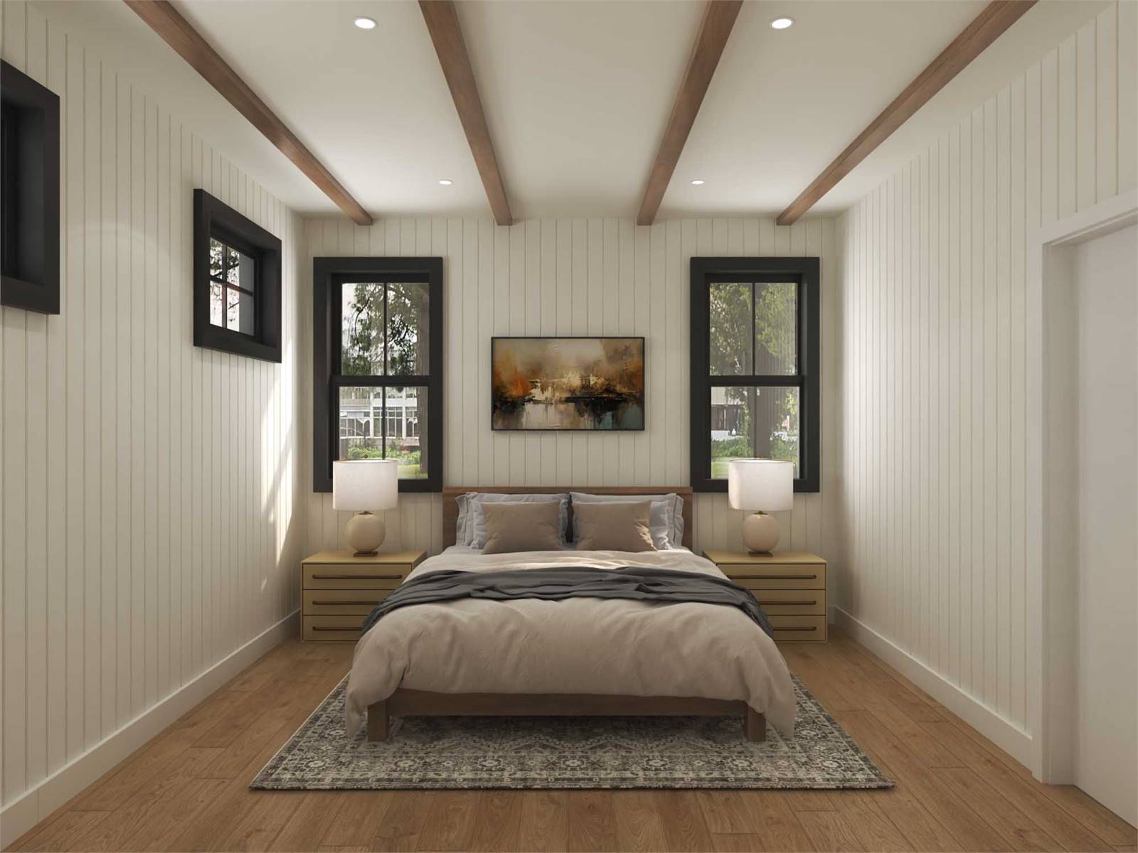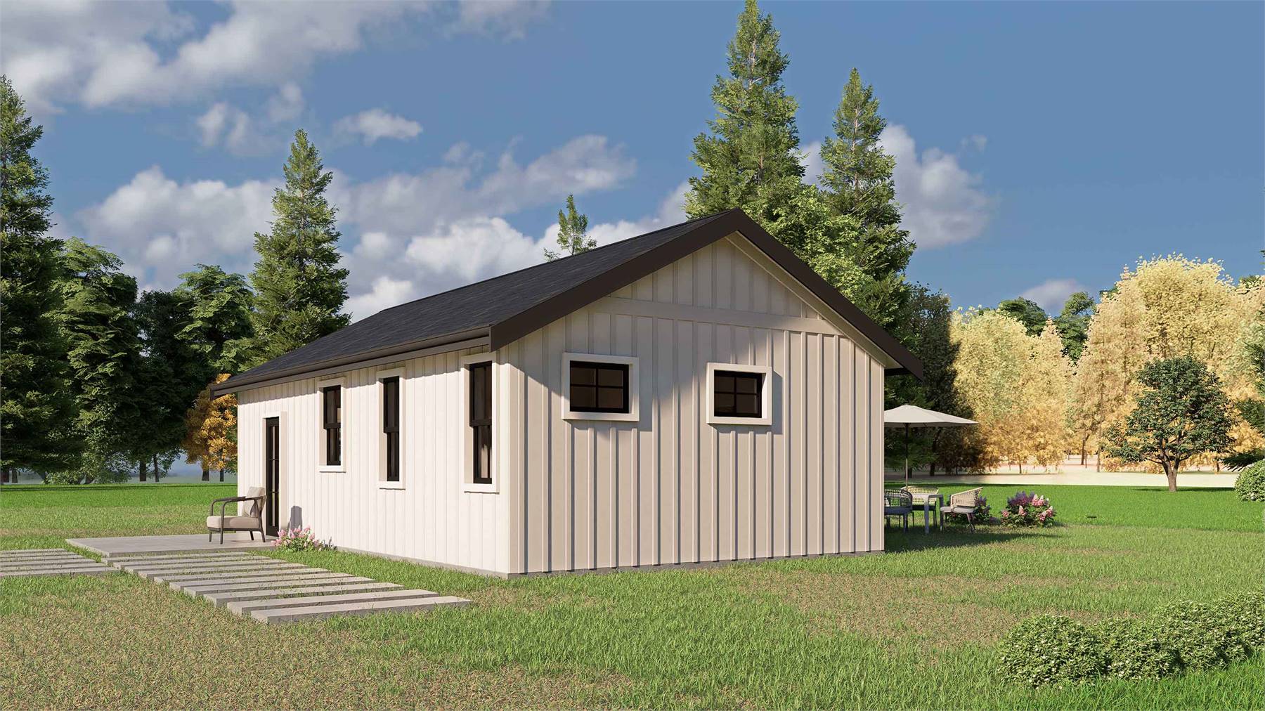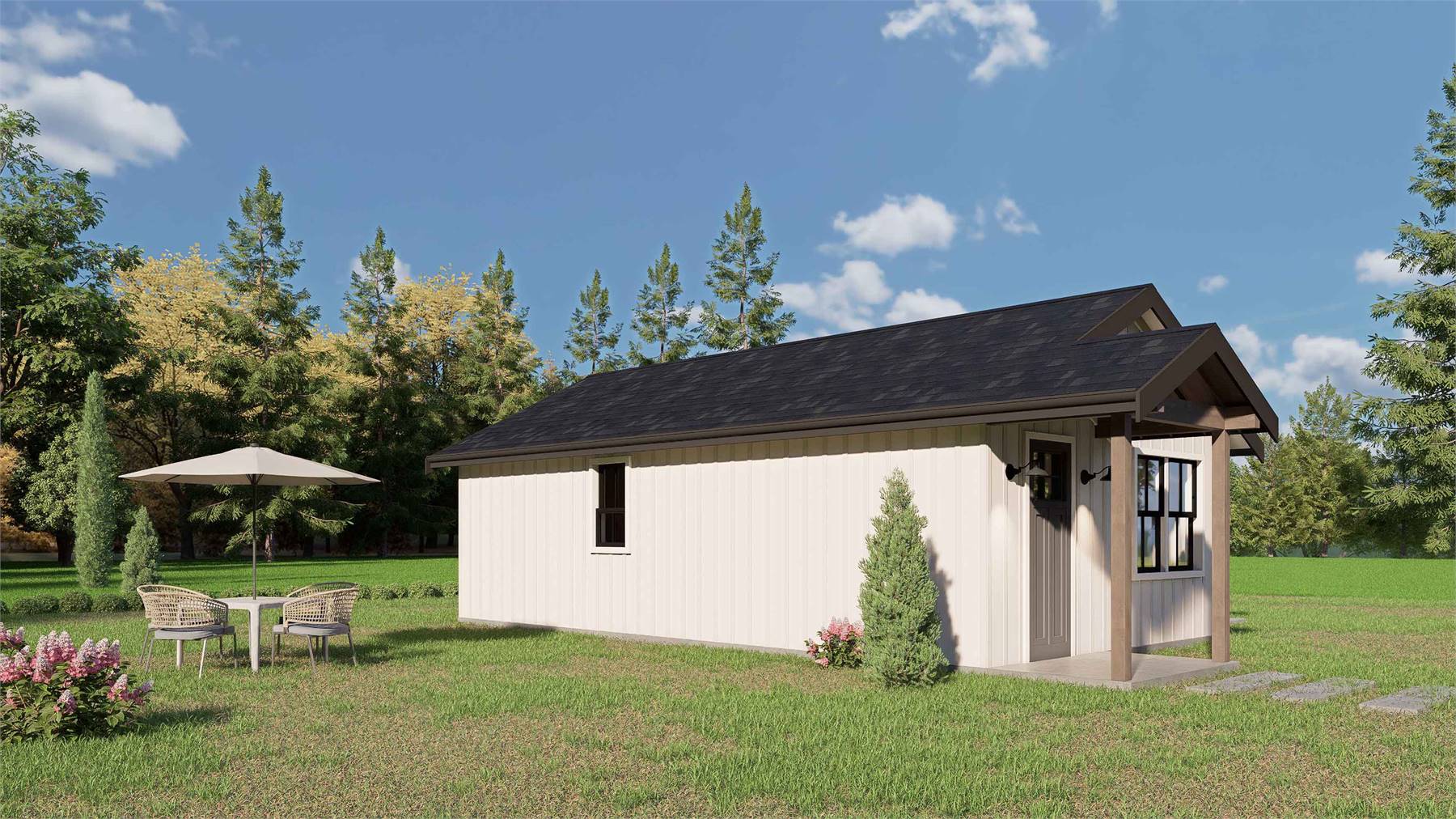House Plan 9950 delivers classic farmhouse character with a modern edge, highlighted by board and batten siding, a ribbed metal roof, and a welcoming shed dormer. At the center of the home, an open concept layout brings together the lodge room, kitchen, and dining area, creating a warm and inviting space for daily life. A striking fireplace defines the lodge room, while sliding doors lead out to a vaulted covered porch, extending the living space outdoors. The primary suite is tucked away on one side of the home for added privacy and includes a four fixture bathroom and a walk in closet with natural light. Two additional bedrooms are aligned near the double garage and share a full bathroom, offering a practical and family friendly arrangement. The finished lower level adds 1,042 square feet of versatile space, featuring a social room with a wet bar, room for games or gatherings, and two more bedrooms. An unfinished lawn and garden center provides valuable storage and workspace, rounding out a design that balances comfort, function, and farmhouse appeal.