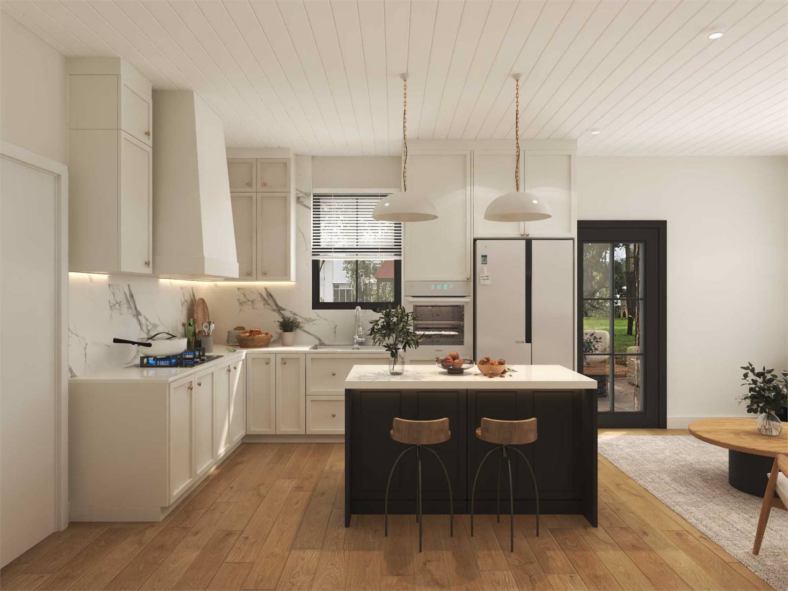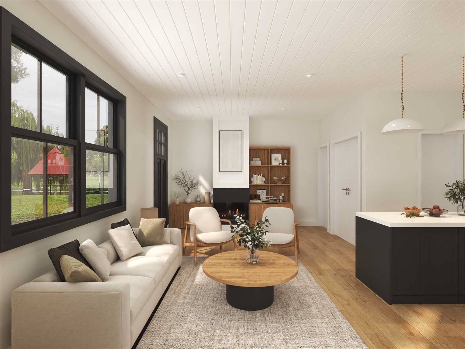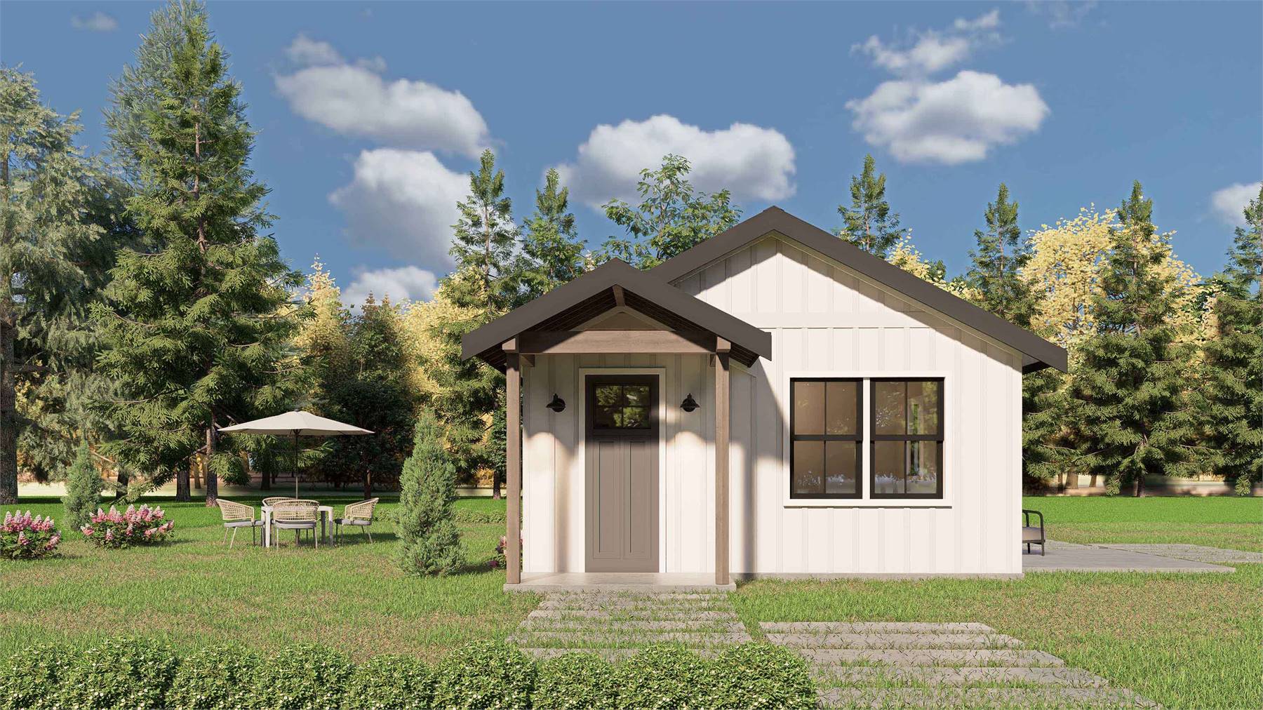 House Plan 9950 delivers classic farmhouse character with a modern edge, highlighted by board and batten siding, a ribbed metal roof, and a welcoming shed dormer. At the center of the home, an open concept layout brings together the lodge room, kitchen, and dining area, creating a warm and inviting space for daily life. A striking fireplace defines the lodge room, while sliding doors lead out to a vaulted covered porch, extending the living space outdoors. The primary suite is tucked away on one side of the home for added privacy and includes a four fixture bathroom and a walk in closet with natural light. Two additional bedrooms are aligned near the double garage and share a full bathroom, offering a practical and family friendly arrangement. The finished lower level adds 1,042 square feet of versatile space, featuring a social room with a wet bar, room for games or gatherings, and two more bedrooms. An unfinished lawn and garden center provides valuable storage and workspace, rounding out a design that balances comfort, function, and farmhouse appeal.