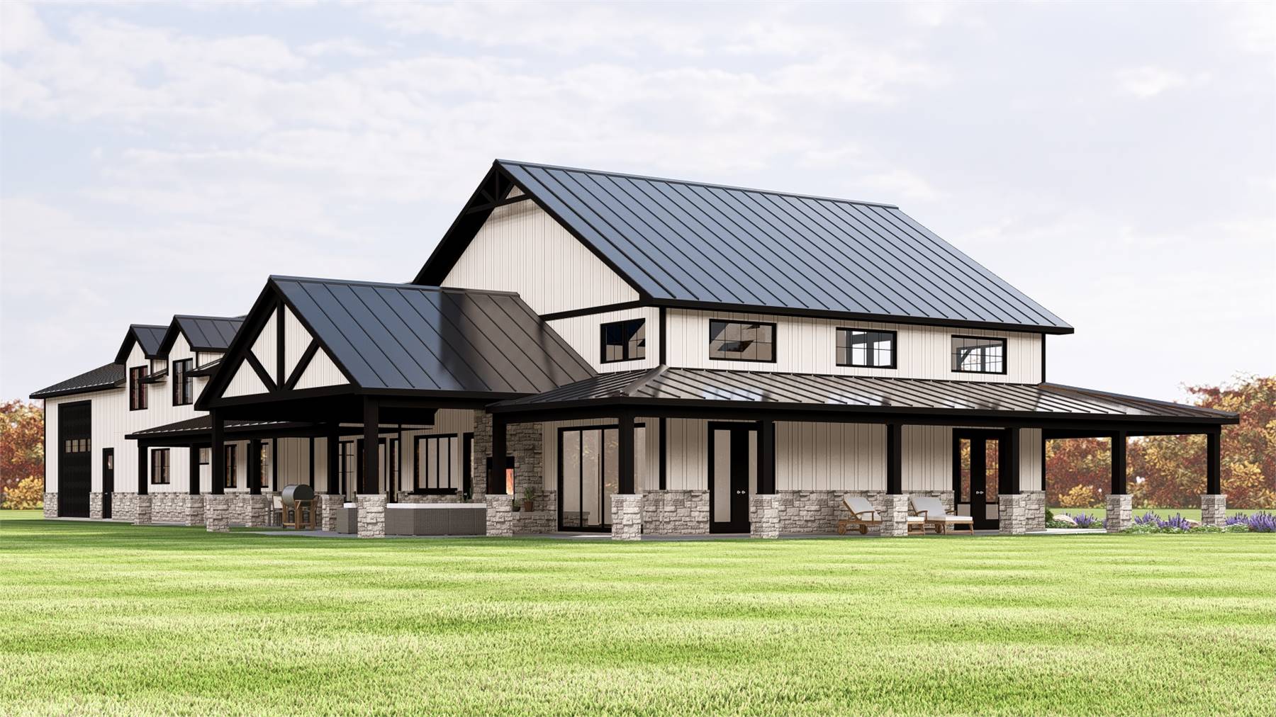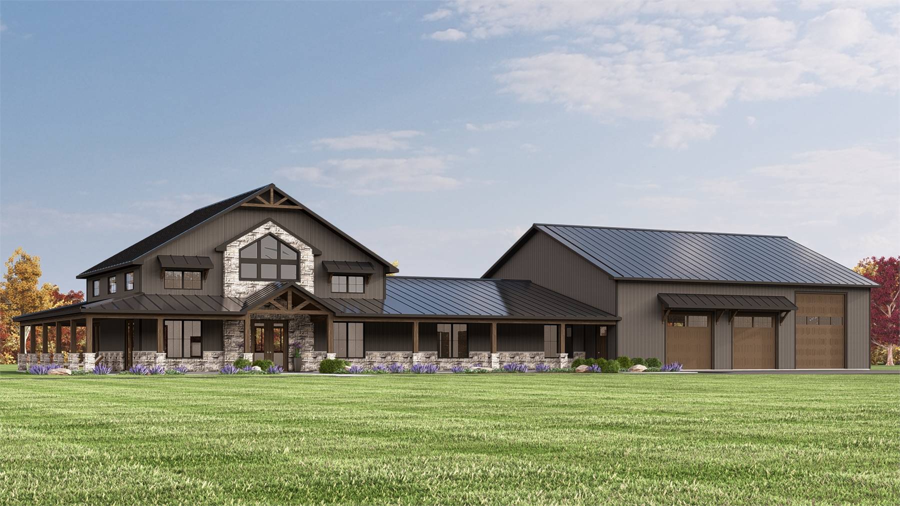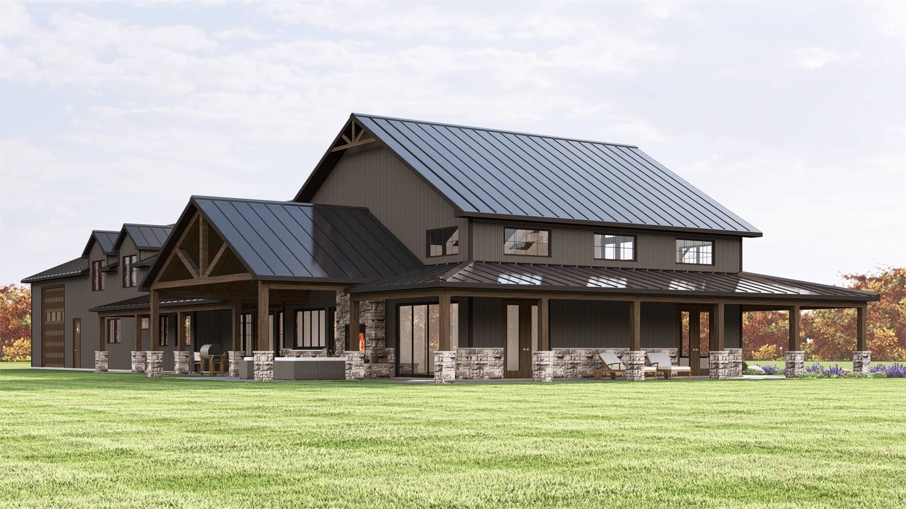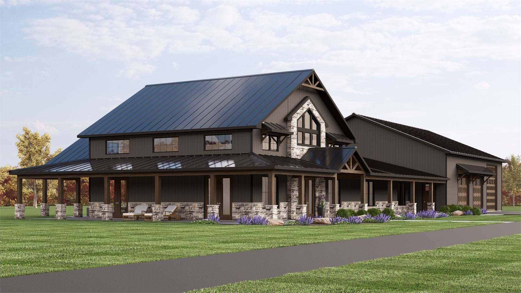 House Plan 11967 delivers a thoughtfully designed barndominium that balances bold architecture with everyday livability. The open floor plan centers around a vaulted great room that flows seamlessly into the kitchen and dining areas, creating an inviting space for both entertaining and daily life. The kitchen is well equipped with an island, walk-in pantry, and generous prep space for smooth functionality.