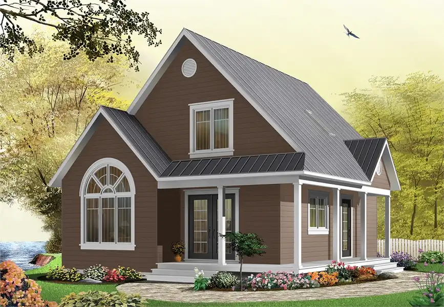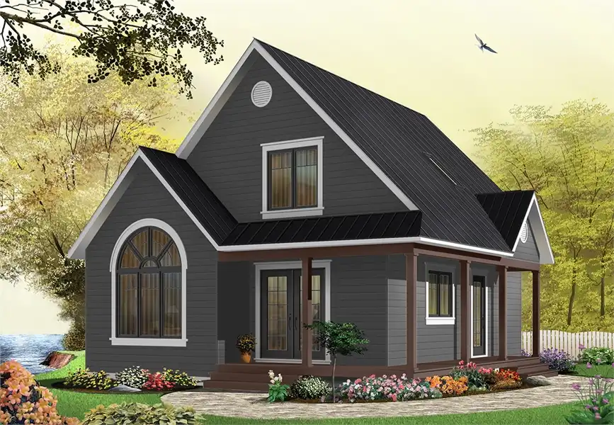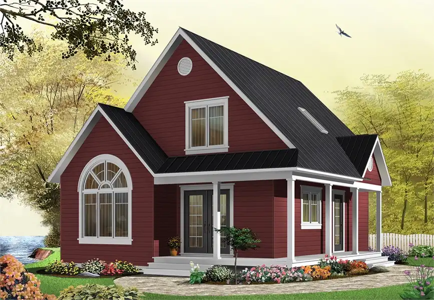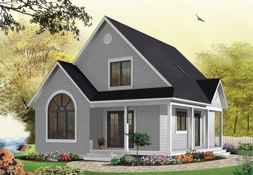This farmhouse style plan so popular. Pictured in just a few of the many exterior varieties that it can come in, this 1,226 square foot home can be modified in countless ways to make it a unique expression of you. Two bedrooms and 2 bathrooms can be found amongst the 2 stories of this home, making it a wonderful option for a new family. And the reduced footprint of the layout allows this home to be built on virtually any lot size. A wraparound covered front porch adorns the front of the home as you move inside. Two separate entryways are also featured here, one in to the foyer by the master bed and bath, and one in to the dining room and spacious kitchen. A large family room ties this space together and is great for bringing everyone together. The second floor of this home provides a secondary bedroom and full bathroom, as well as another family room that looks down on the one below. This clever use of space ensures that this home is intimate yet also private, allowing for maximum enjoyment no matter the setting.