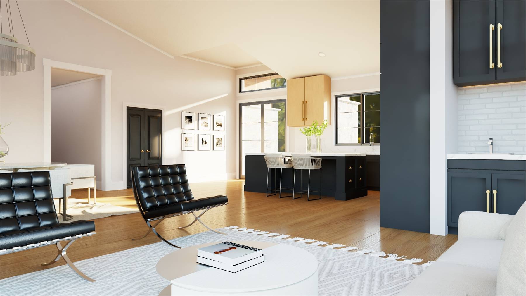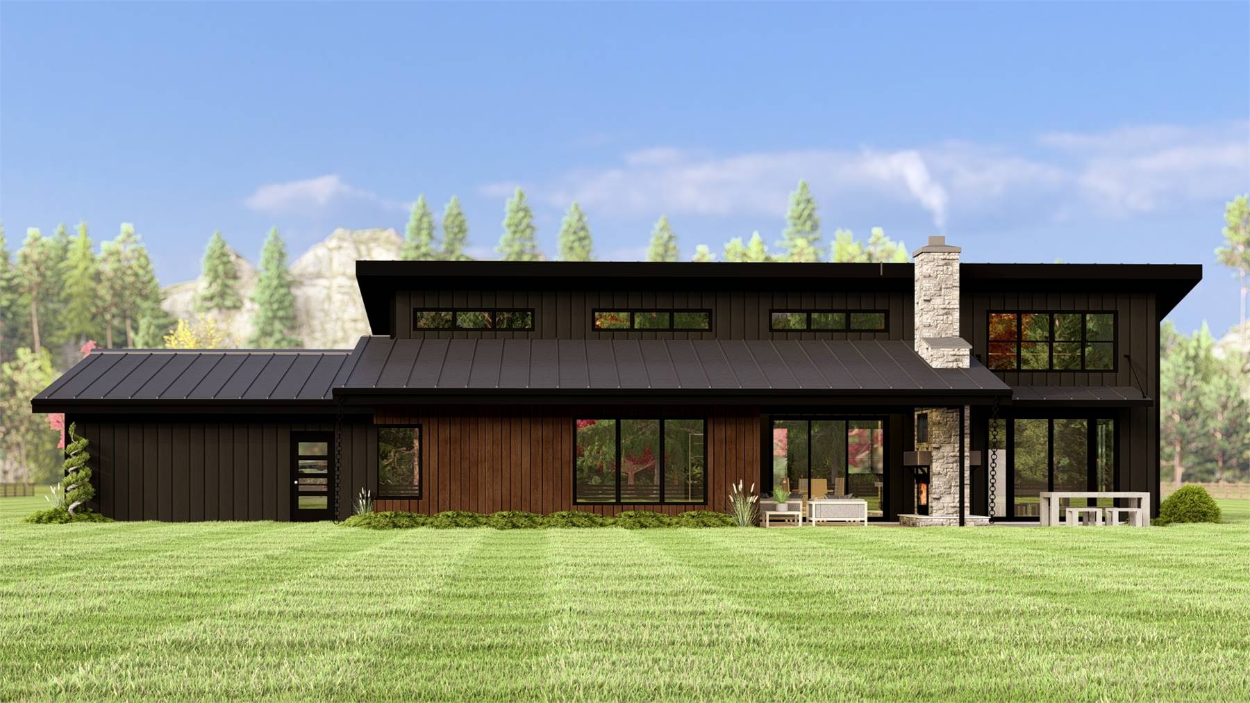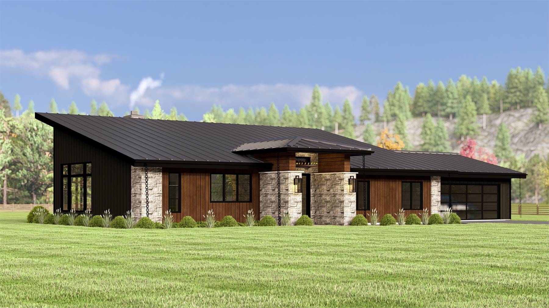 House Plan 11975 delivers modern mountain-inspired design with 2,342 square feet of open living space, three bedrooms, two and a half bathrooms, and an attached 744 square feet two-car garage. The front porch leads into a dramatic foyer with a sloped ceiling that opens into an expansive great room, dining area, and a chef-inspired kitchen featuring a nine-foot island and walk-in butler’s pantry. The main-level primary suite offers a luxurious escape with a spa-style bath, separate tub and tile shower, and a walk-in closet with direct access to the laundry room for everyday ease. Two secondary bedrooms share a full bath and are thoughtfully placed for privacy. A functional mudroom with built-in lockers connects the garage to the home’s interior and sits near a convenient half bath. Outdoor living is enhanced by a spacious covered porch with a fireplace and an adjoining patio that expands the home’s entertaining potential.