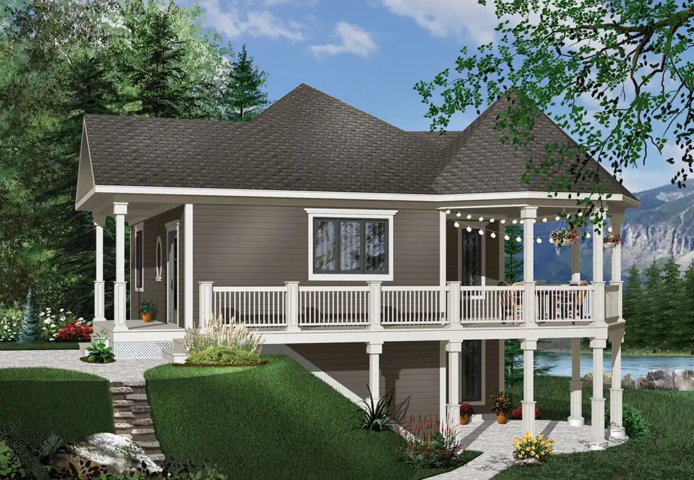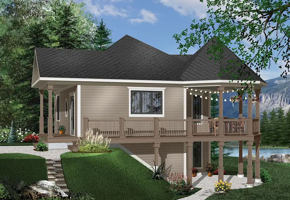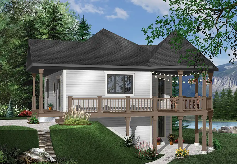An attractive gazebo anchors the wraparound deck on this charming one-story cottage. An optional walk-out basement lets you choose the overall square footage of the home. On the main floor, the open kitchen boasts a useful island with snack bar. A pleasant dining area offers sliding glass doors to the gazebo. The great room provides outdoor views. You'll appreciate the convenience of a main-floor master suite. The optional basement hosts two secondary bedrooms, a full bath and a family room.