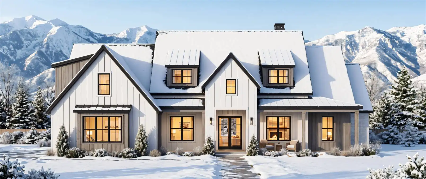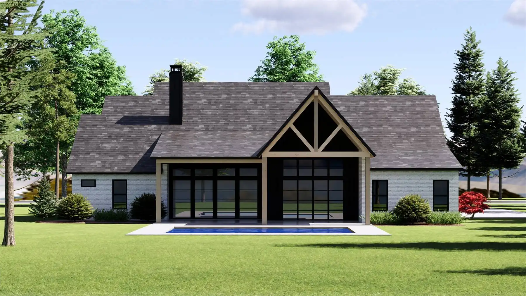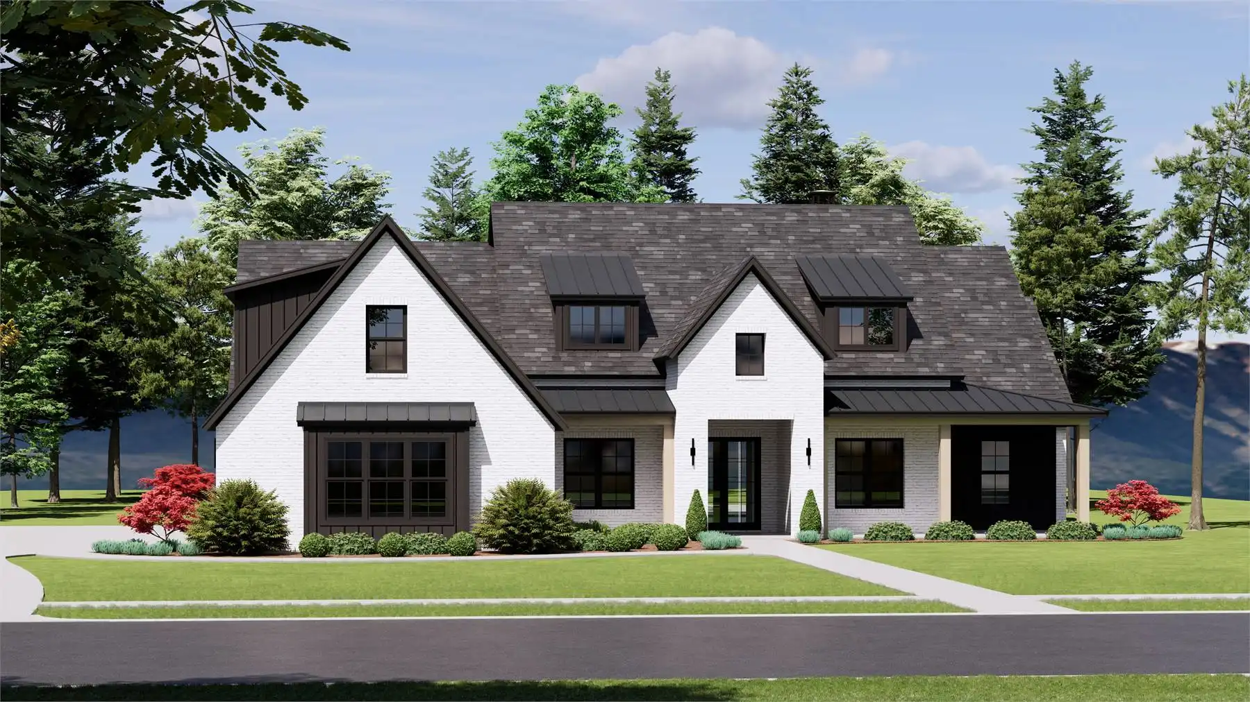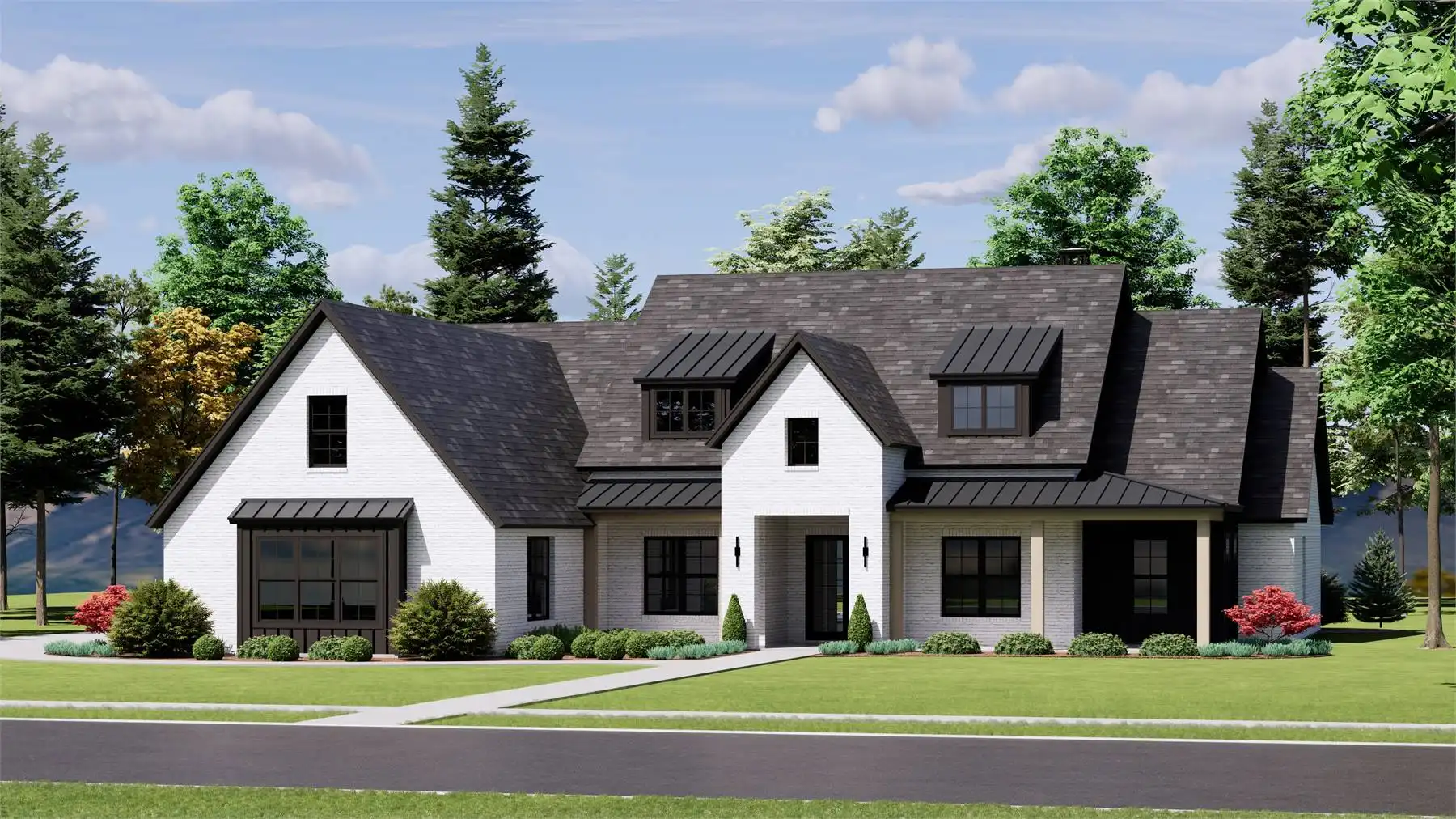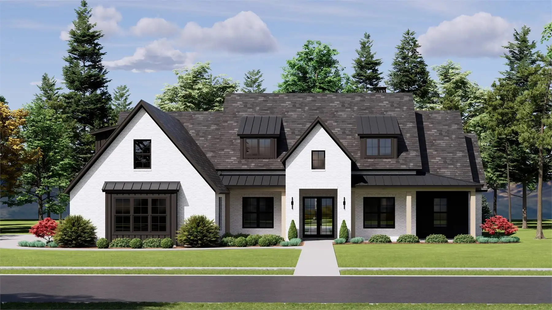 House Plan 12013 is a stunning modern farmhouse designed for both luxury and livability with 3,255 square feet, four bedrooms, and a front two-car garage. A wide covered porch welcomes you into a spacious foyer, anchored by a private office or flex room for work or quiet retreat. The central living area showcases a light-filled family room with twelve foot ceilings and a fireplace, opening to an impressive L-shaped kitchen with double islands, an oversized walk-in pantry, and seamless access to the mudroom for everyday functionality. The dining space leads directly to a generous outdoor living area, ideal for hosting and unwinding. Three secondary bedrooms with full baths line the left wing, while the right wing features the expansive primary suite with a spa-inspired bath and a massive walk-in closet that connects directly to the laundry room.