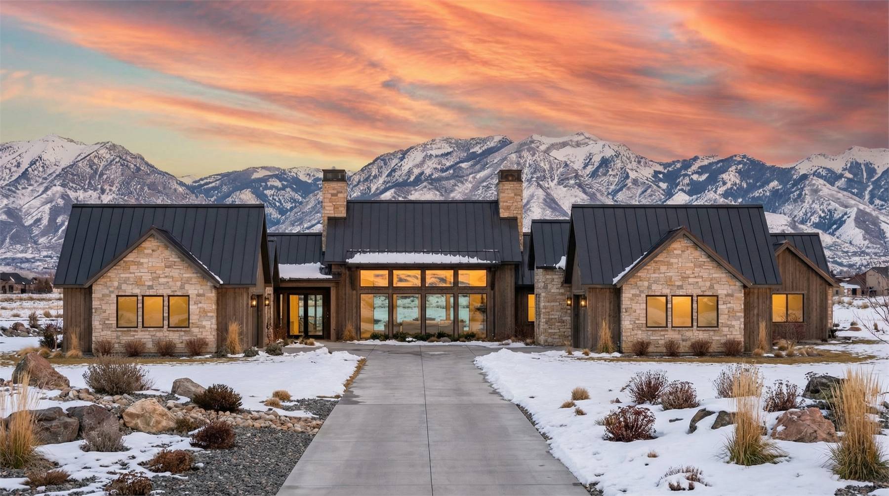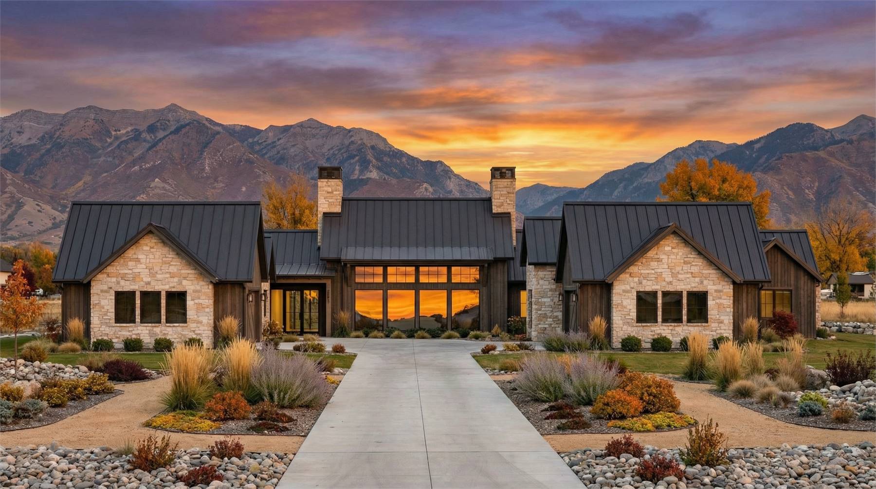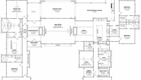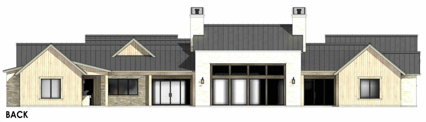 House Plan 12014 offers a refined one story modern design built around a serene courtyard and a split 4 car garage, with two garage bays on each side for a balanced and functional layout. Guests step from the welcoming front porch into a grand entry hall that flows into a vaulted great room highlighted by two double-sided fireplaces, creating striking focal points on both sides of the space. The open floor plan includes an expansive outdoor living area, a formal dining room, and a showstopping L-shaped kitchen with a generous central island, oversized pantry, and a dedicated bar room. The right wing provides a family entrance tucked away from the main living areas, a large utility room, and a private office, along with a game room with a half bath and two secondary bedrooms with full baths. The left wing is reserved for the luxurious primary suite with vaulted ceilings and a spa-style ensuite, plus a fourth bedroom with a private bathroom.
