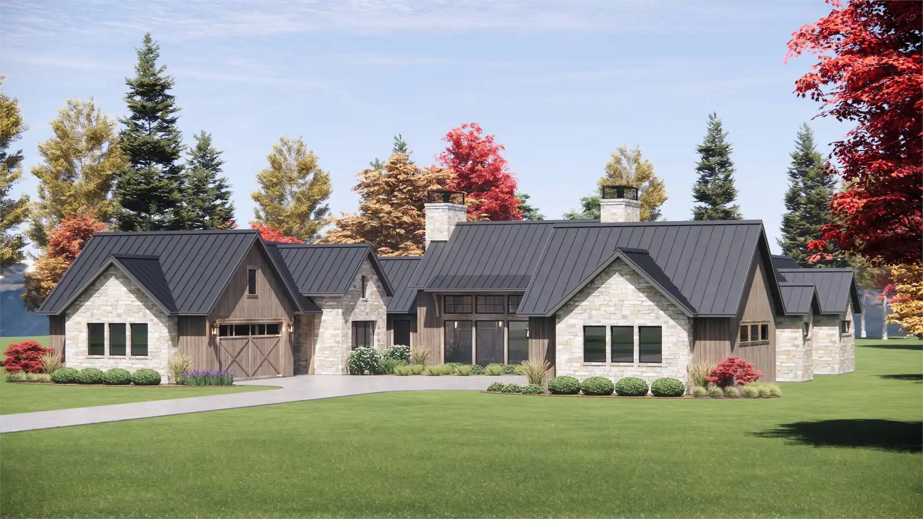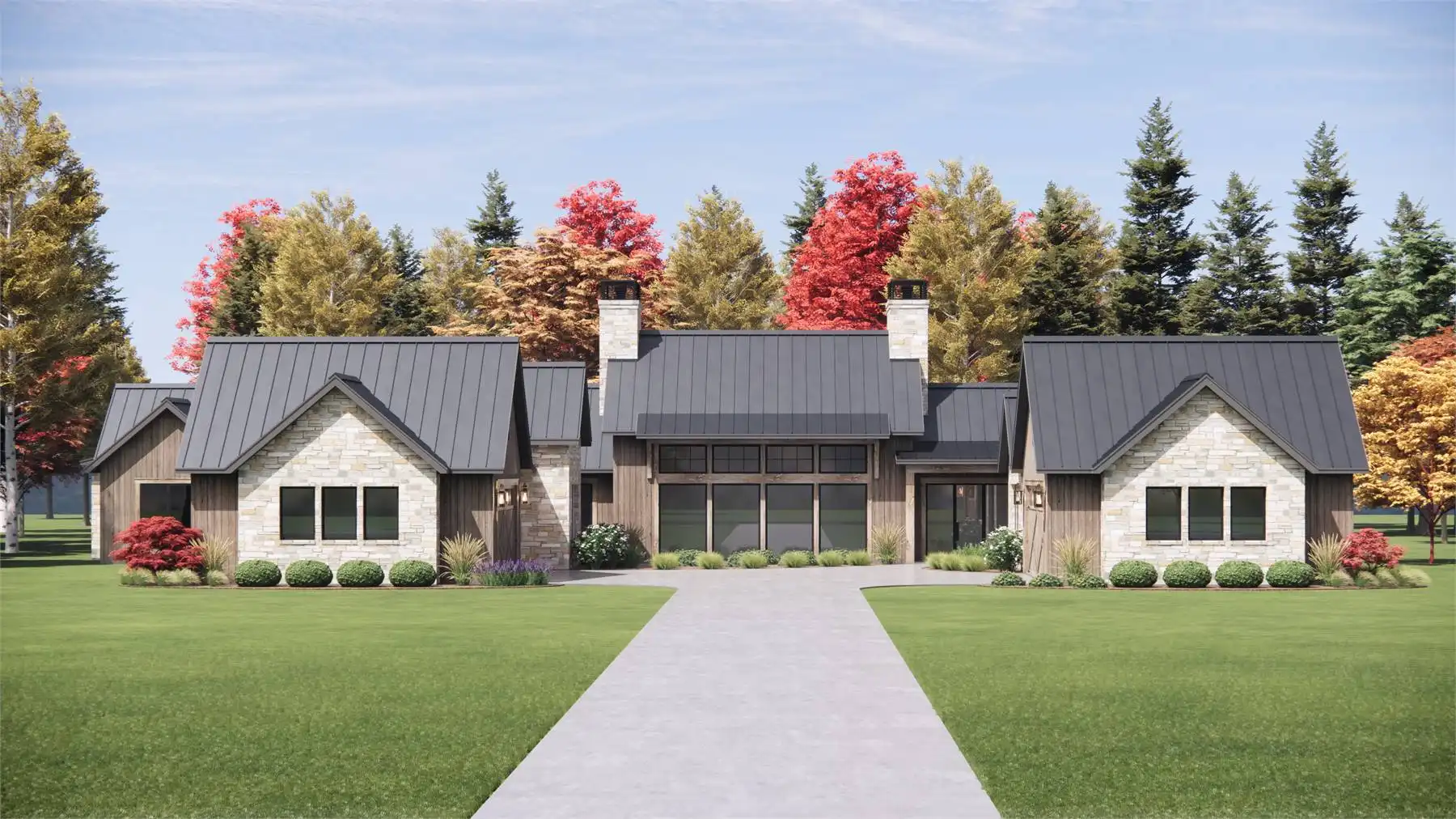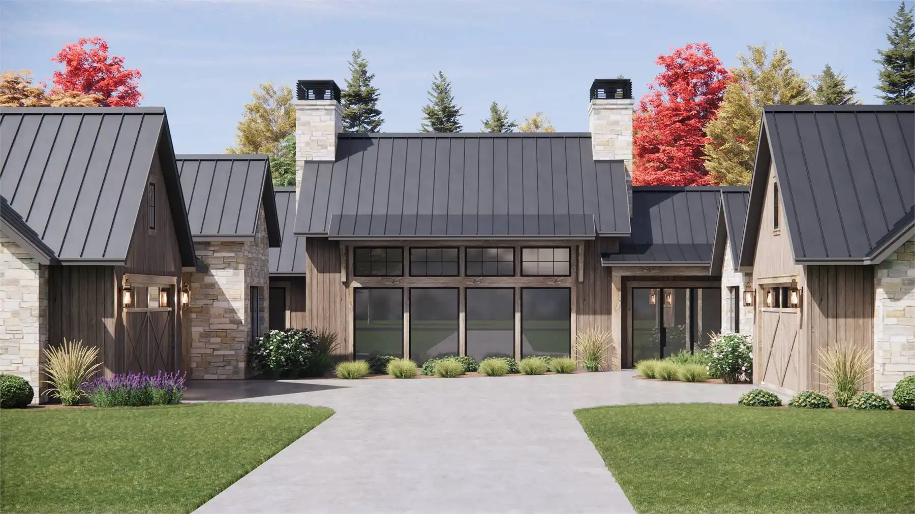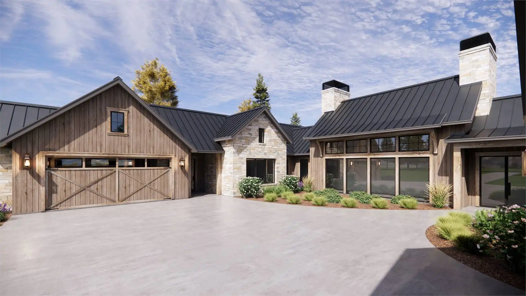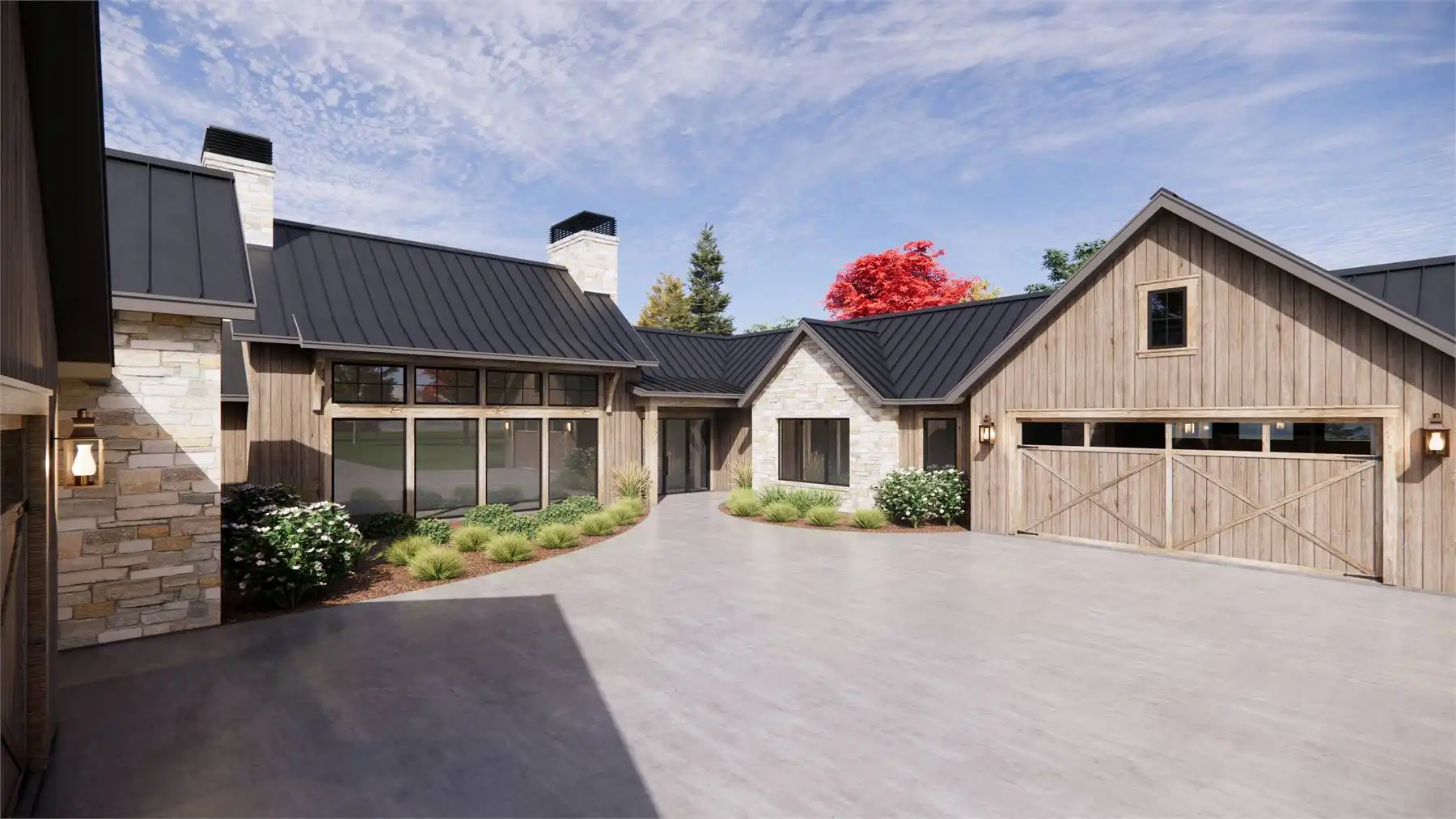House Plan 12014 offers a refined one story modern design built around a serene courtyard and a split 4 car garage, with two garage bays on each side for a balanced and functional layout. Guests step from the welcoming front porch into a grand entry hall that flows into a vaulted great room highlighted by two double-sided fireplaces, creating striking focal points on both sides of the space. The open floor plan includes an expansive outdoor living area, a formal dining room, and a showstopping L-shaped kitchen with a generous central island, oversized pantry, and a dedicated bar room. The right wing provides a family entrance tucked away from the main living areas, a large utility room, and a private office, along with a game room with a half bath and two secondary bedrooms with full baths. The left wing is reserved for the luxurious primary suite with vaulted ceilings and a spa-style ensuite, plus a fourth bedroom with a private bathroom.
