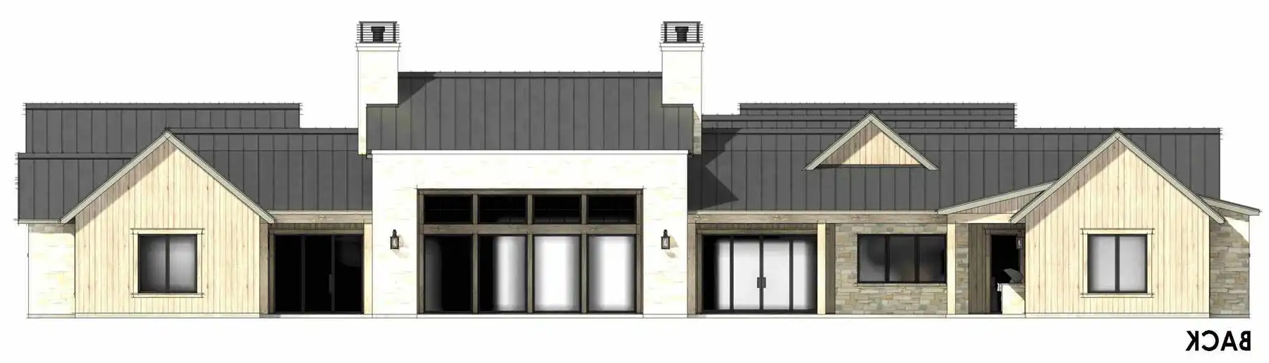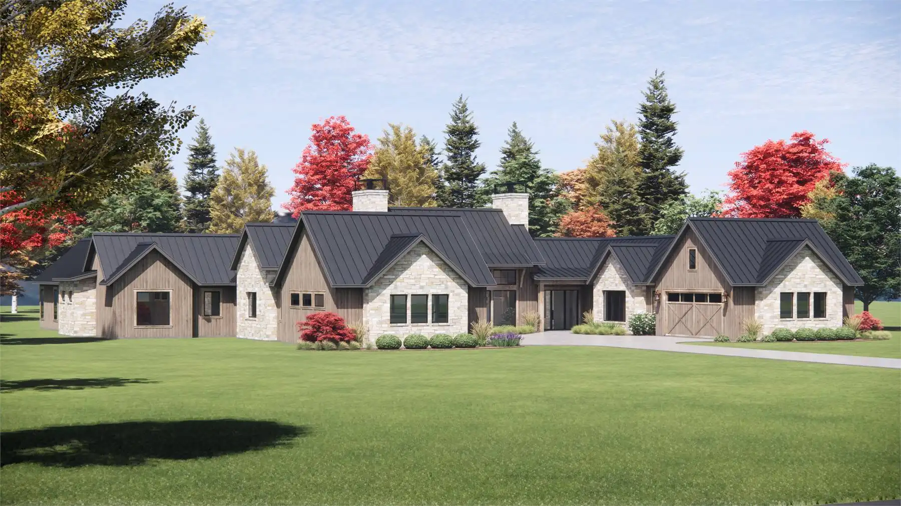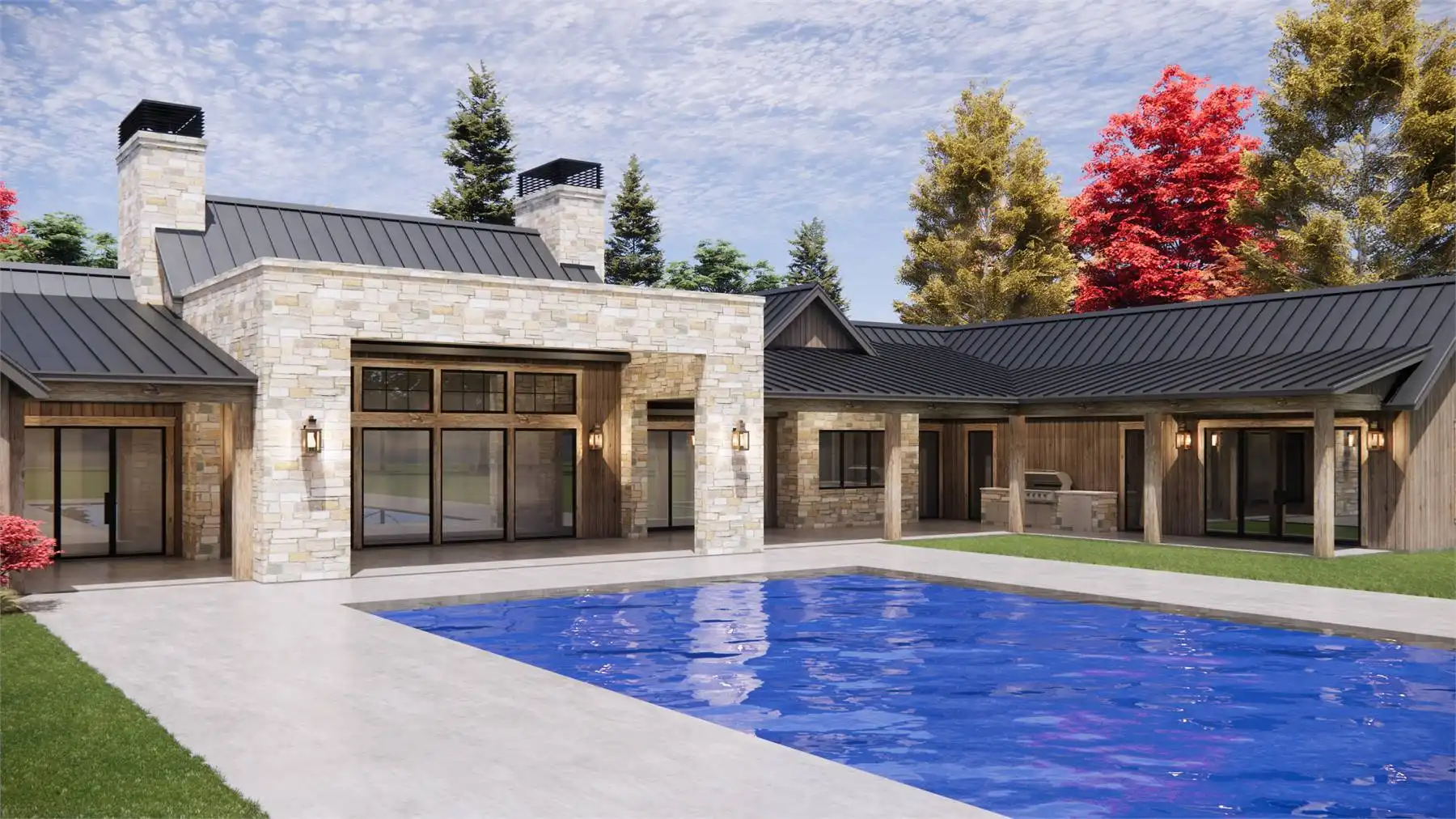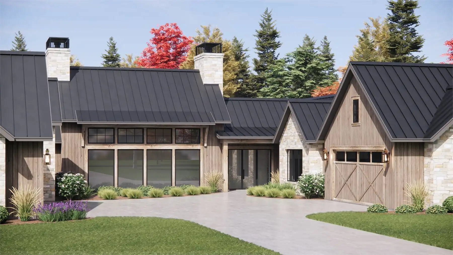 House Plan 12014 offers a refined one story modern design built around a serene courtyard and a split 4 car garage, with two garage bays on each side for a balanced and functional layout. Guests step from the welcoming front porch into a grand entry hall that flows into a vaulted great room highlighted by two double-sided fireplaces, creating striking focal points on both sides of the space. The open floor plan includes an expansive outdoor living area, a formal dining room, and a showstopping L-shaped kitchen with a generous central island, oversized pantry, and a dedicated bar room. The right wing provides a family entrance tucked away from the main living areas, a large utility room, and a private office, along with a game room with a half bath and two secondary bedrooms with full baths. The left wing is reserved for the luxurious primary suite with vaulted ceilings and a spa-style ensuite, plus a fourth bedroom with a private bathroom.