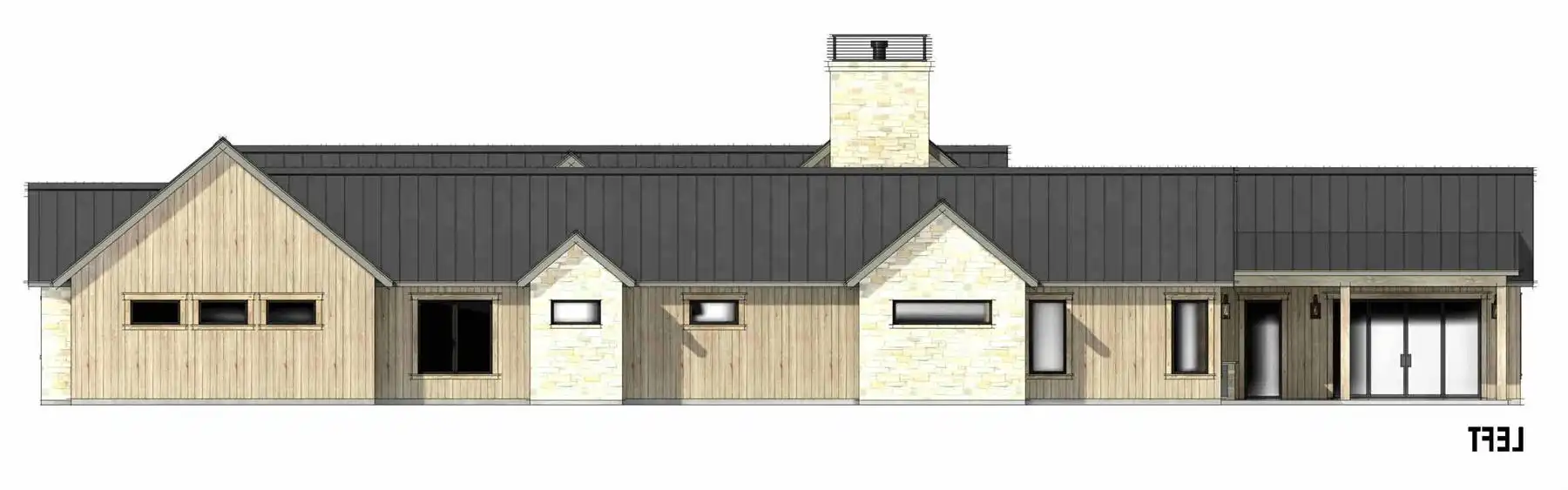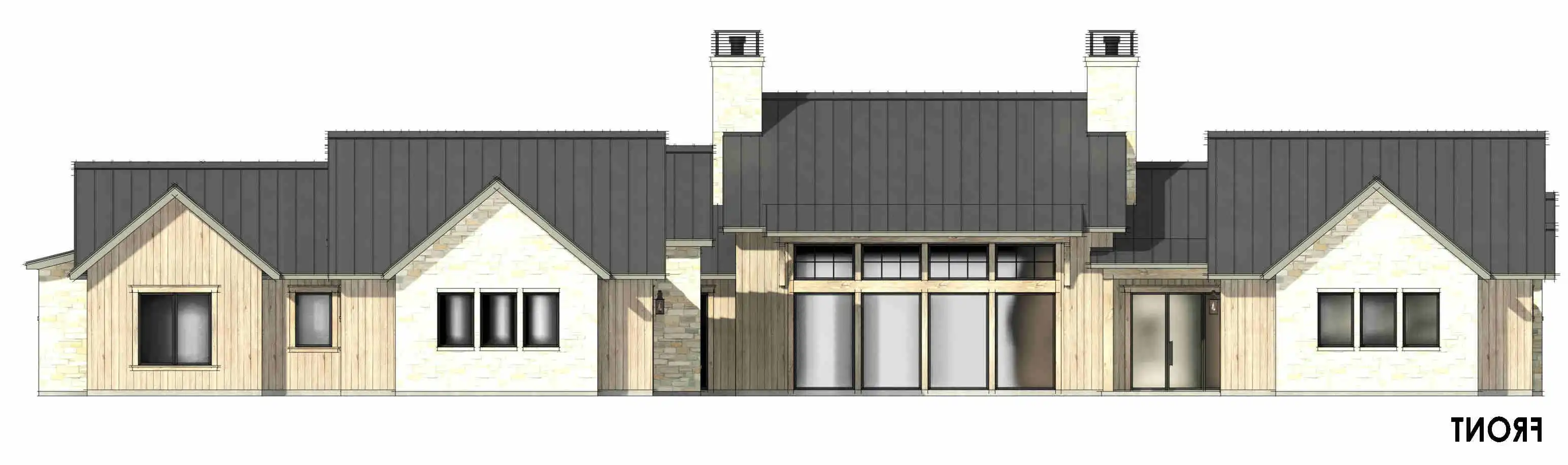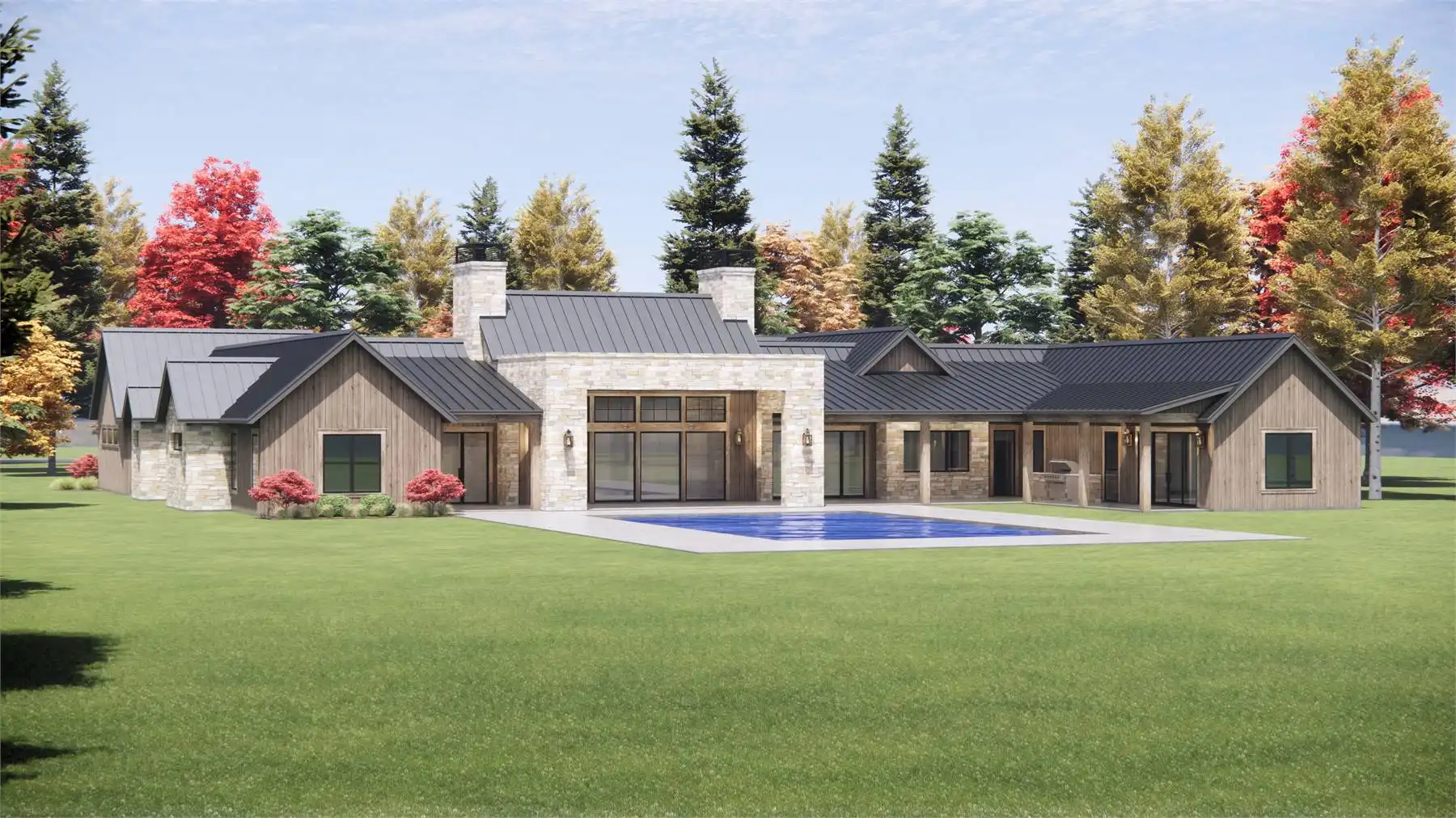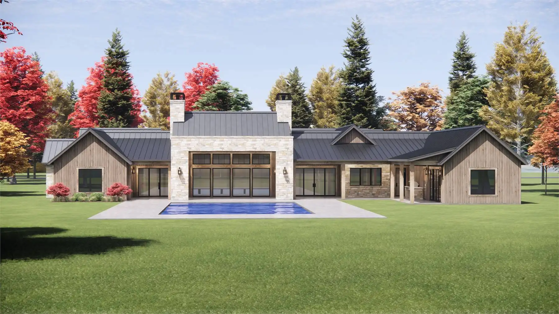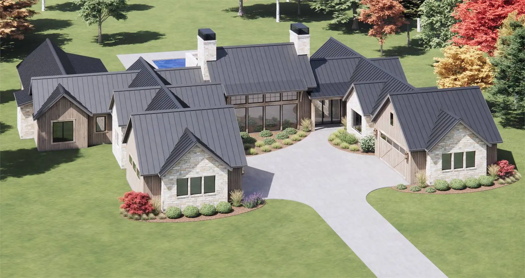 House Plan 12014 offers a refined one story modern design built around a serene courtyard and a split 4 car garage, with two garage bays on each side for a balanced and functional layout. Guests step from the welcoming front porch into a grand entry hall that flows into a vaulted great room highlighted by two double-sided fireplaces, creating striking focal points on both sides of the space. The open floor plan includes an expansive outdoor living area, a formal dining room, and a showstopping L-shaped kitchen with a generous central island, oversized pantry, and a dedicated bar room. The right wing provides a family entrance tucked away from the main living areas, a large utility room, and a private office, along with a game room with a half bath and two secondary bedrooms with full baths. The left wing is reserved for the luxurious primary suite with vaulted ceilings and a spa-style ensuite, plus a fourth bedroom with a private bathroom.
