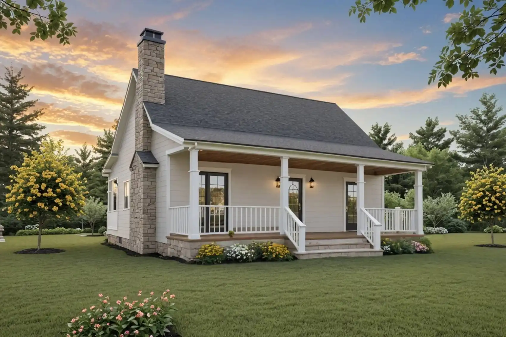 With 800 heated square feet, this home blends simplicity and comfort in a layout tailored for easy living. The U-shaped kitchen offers a peninsula eating bar that connects smoothly to the open living area, making it ideal for relaxed meals and daily routines. The family-friendly layout places the primary bedroom on the main floor, complete with its own walk-in closet. A second bedroom adds space for children, guests, or multi-purpose use. The living area centers around a warm fireplace, giving the home a cozy and inviting feel. Front and rear porches offer peaceful outdoor spaces that expand how you enjoy the home throughout the seasons. With its smart use of space and welcoming atmosphere, this plan creates a charming environment perfect for comfortable everyday life.