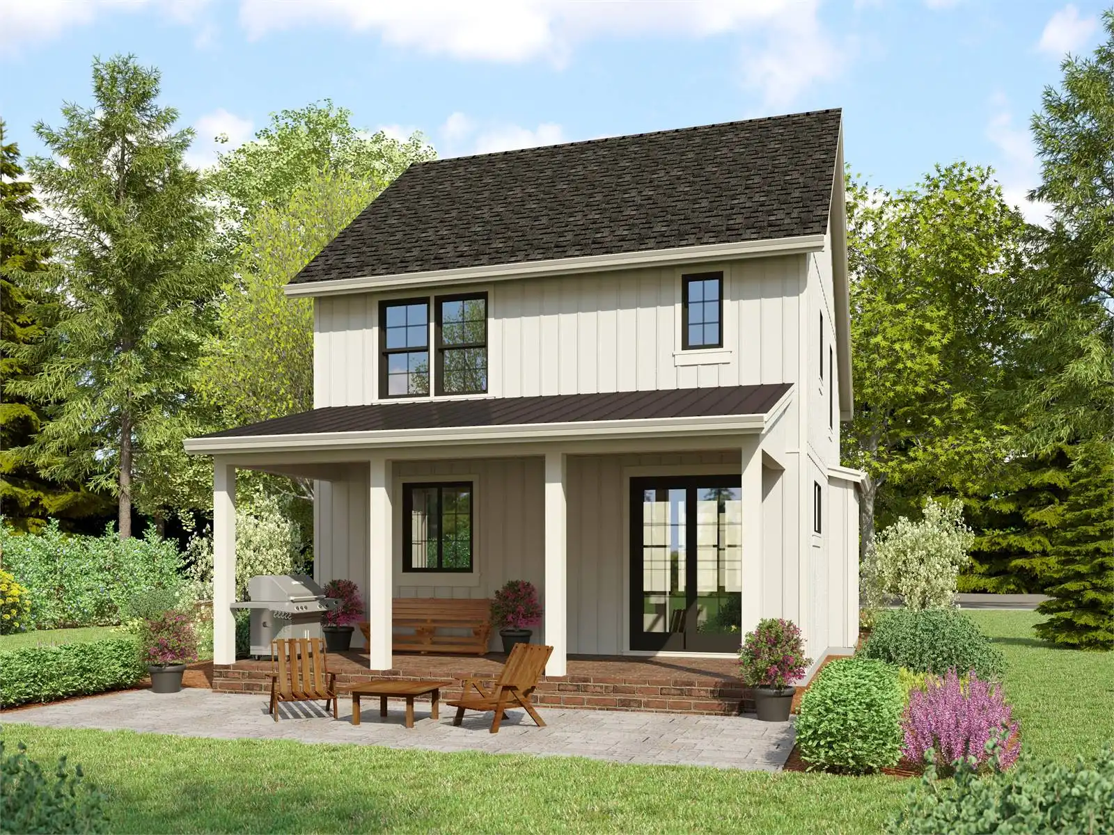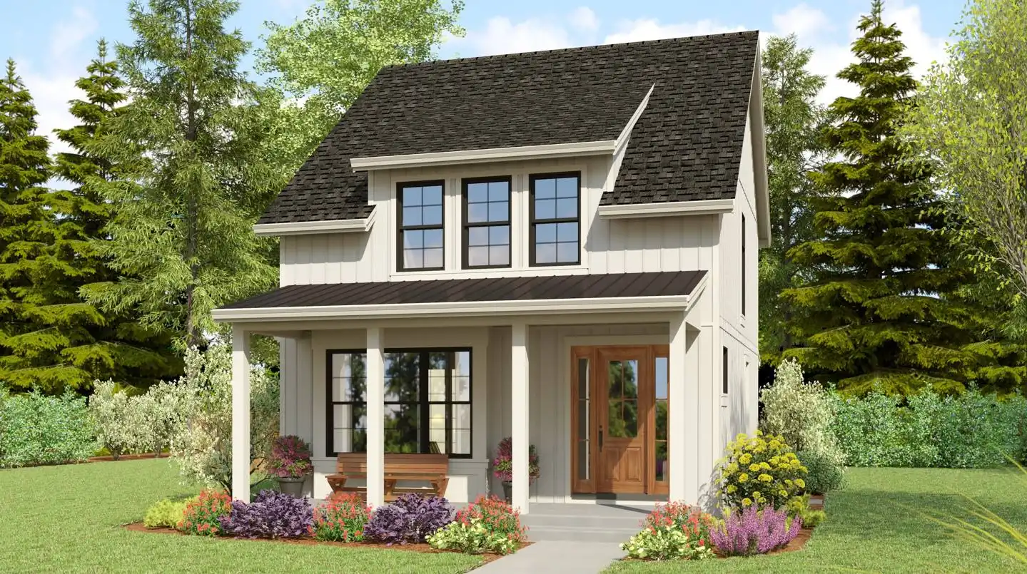 House Plan 1205 is an adaptable home that can fit onto all kinds of lots with its compact 26' by 49' footprint! Inside, you'll find 1,636 square feet spread across two stories, with open living on the main floor and all three bedrooms grouped upstairs. The main floor offers a fireplace in the living area, an island kitchen, and a powder room. Upstairs, the master suite has a vaulted ceiling in the bedroom and a four-piece bath while the other two bedrooms share a hall bath. This nifty little design comes wrapped up in a cute country exterior perfect for all kinds of locales!