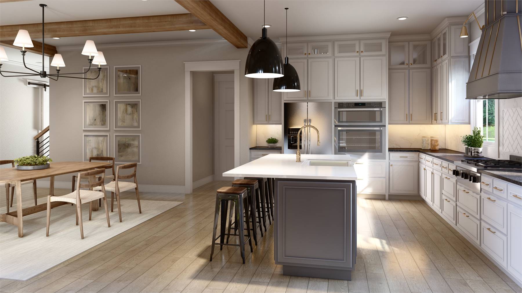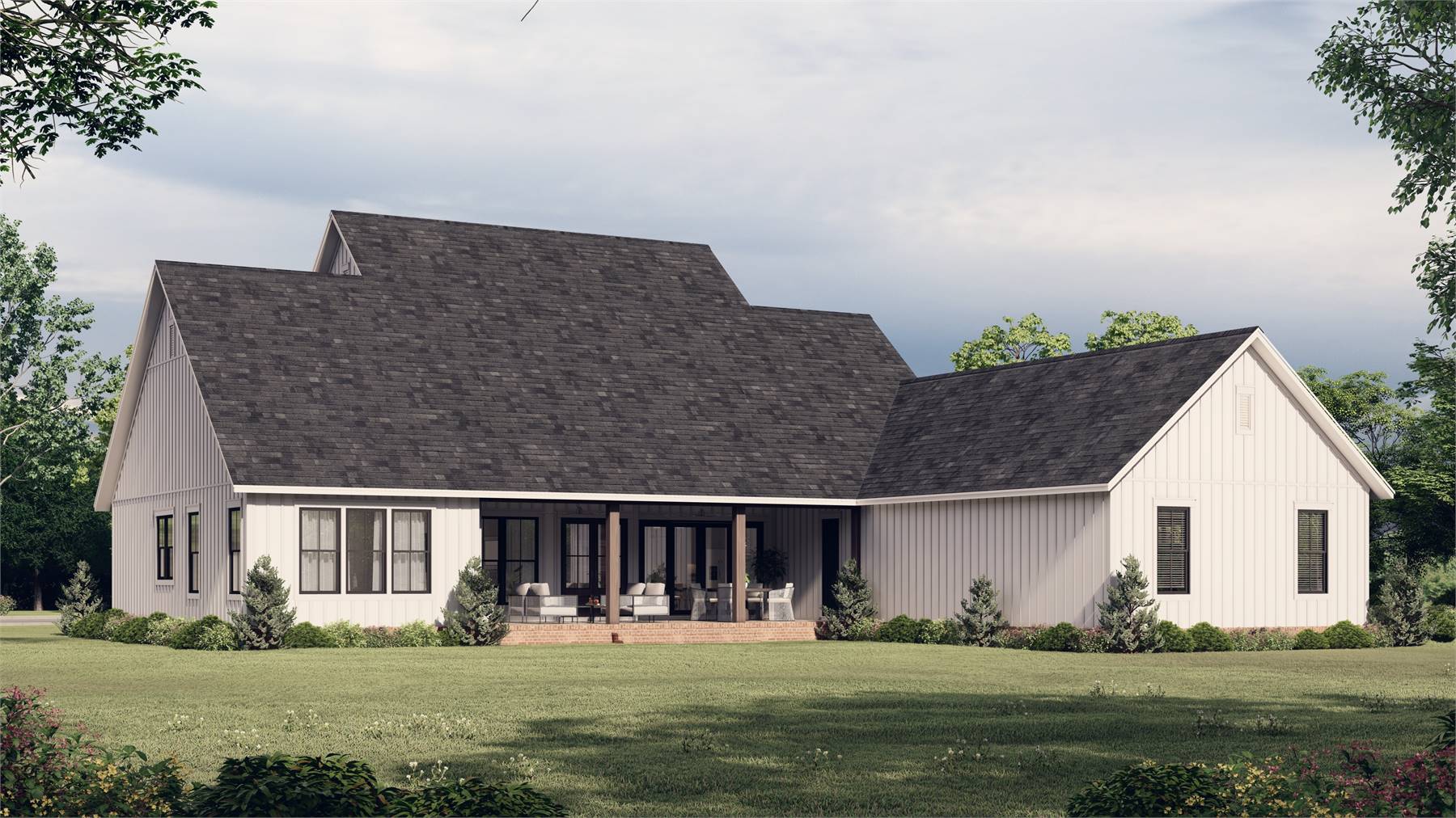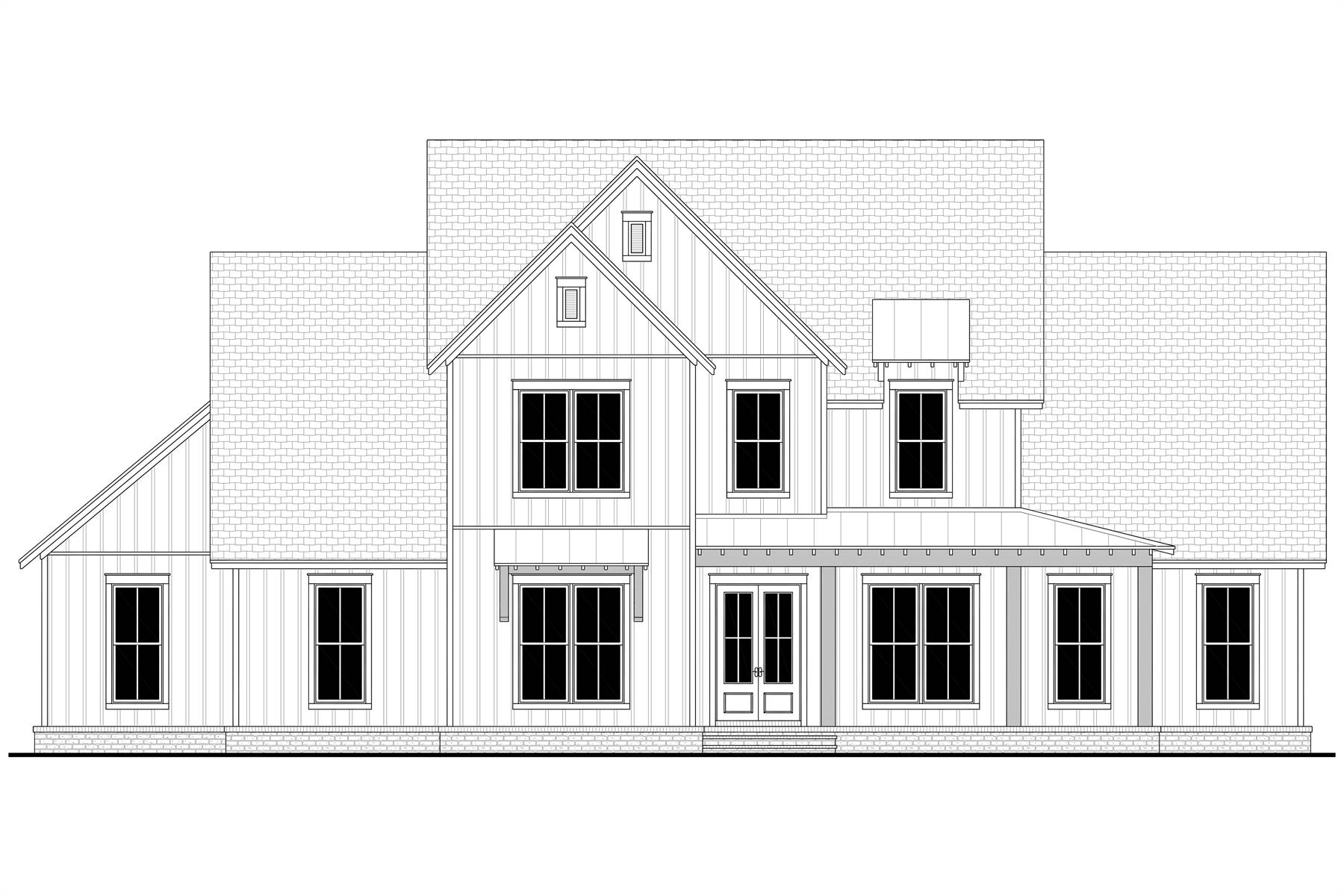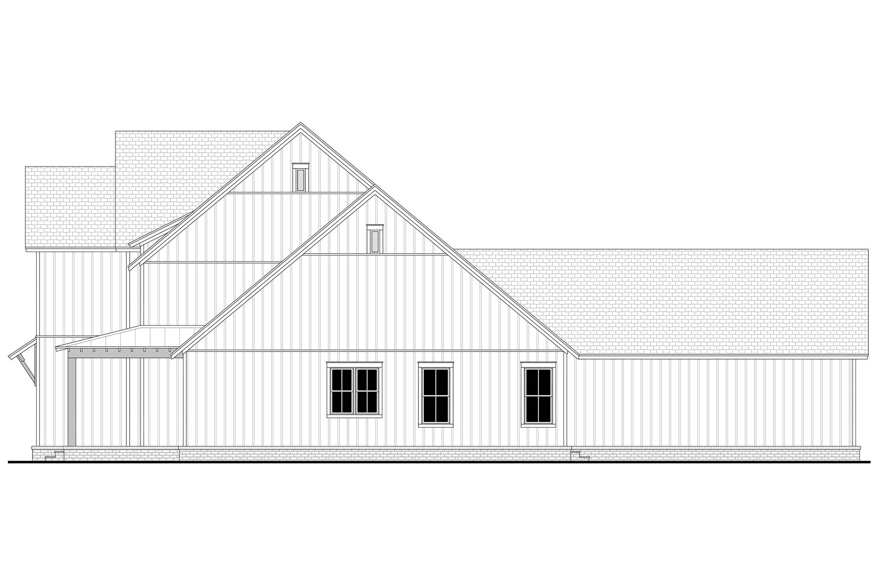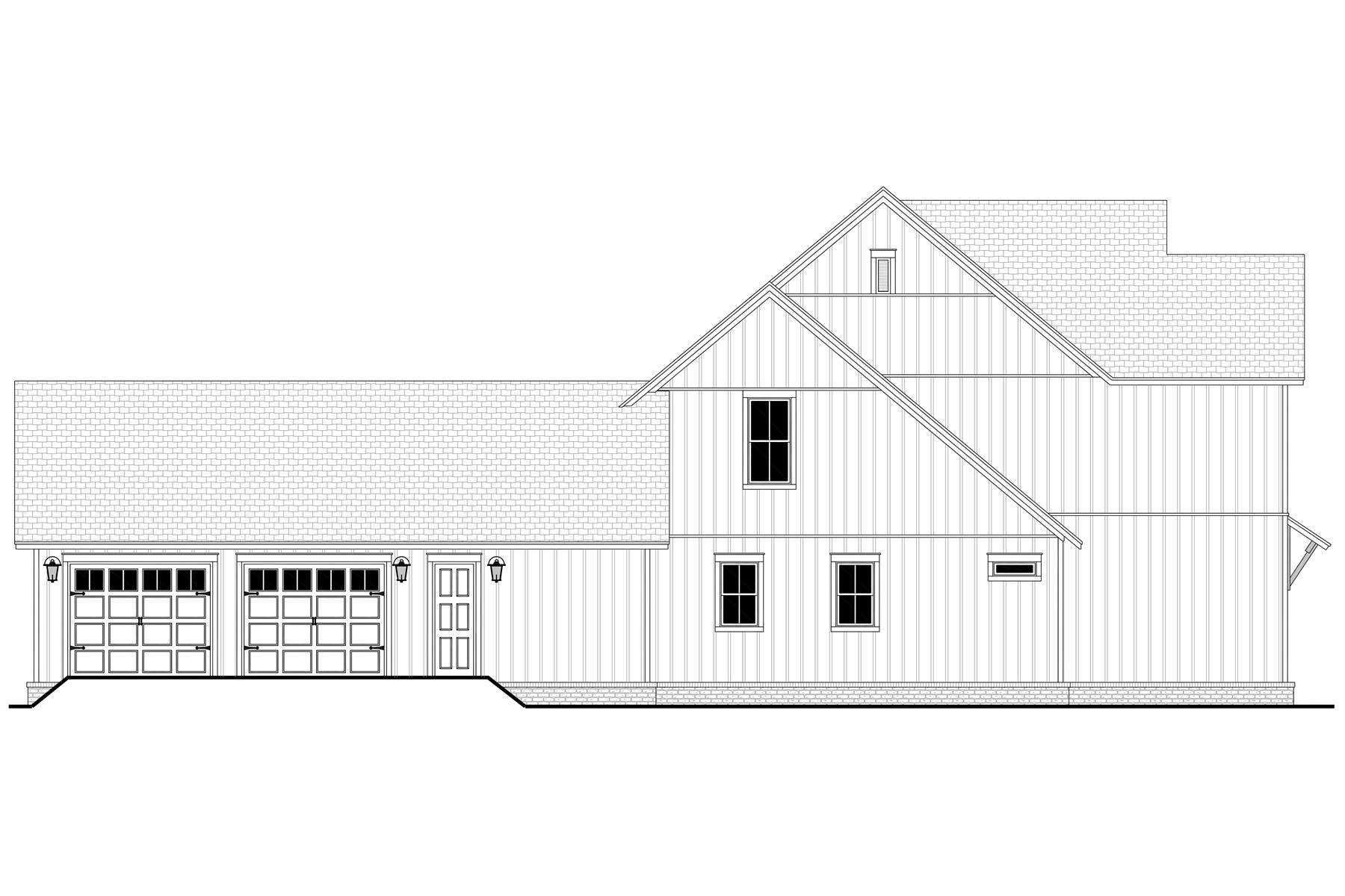 House Plan 12066 showcases a refined modern farmhouse design with a functional two-story layout and timeless curb appeal. The main floor centers around an expansive great room with vaulted details and decorative beams, flowing naturally into the dining area and island kitchen. A first-floor primary suite offers privacy and convenience, while a nearby home office creates an ideal work-from-home setup. The rear porch extends the living space outdoors and includes the option for an outdoor kitchen. Upstairs, three bedrooms are arranged around a central landing, paired with two full bathrooms and a sizable bonus room that can adapt to changing lifestyle needs. An attached rear-entry garage, generous ceiling heights, and smart storage throughout make this plan well-suited for modern family living.