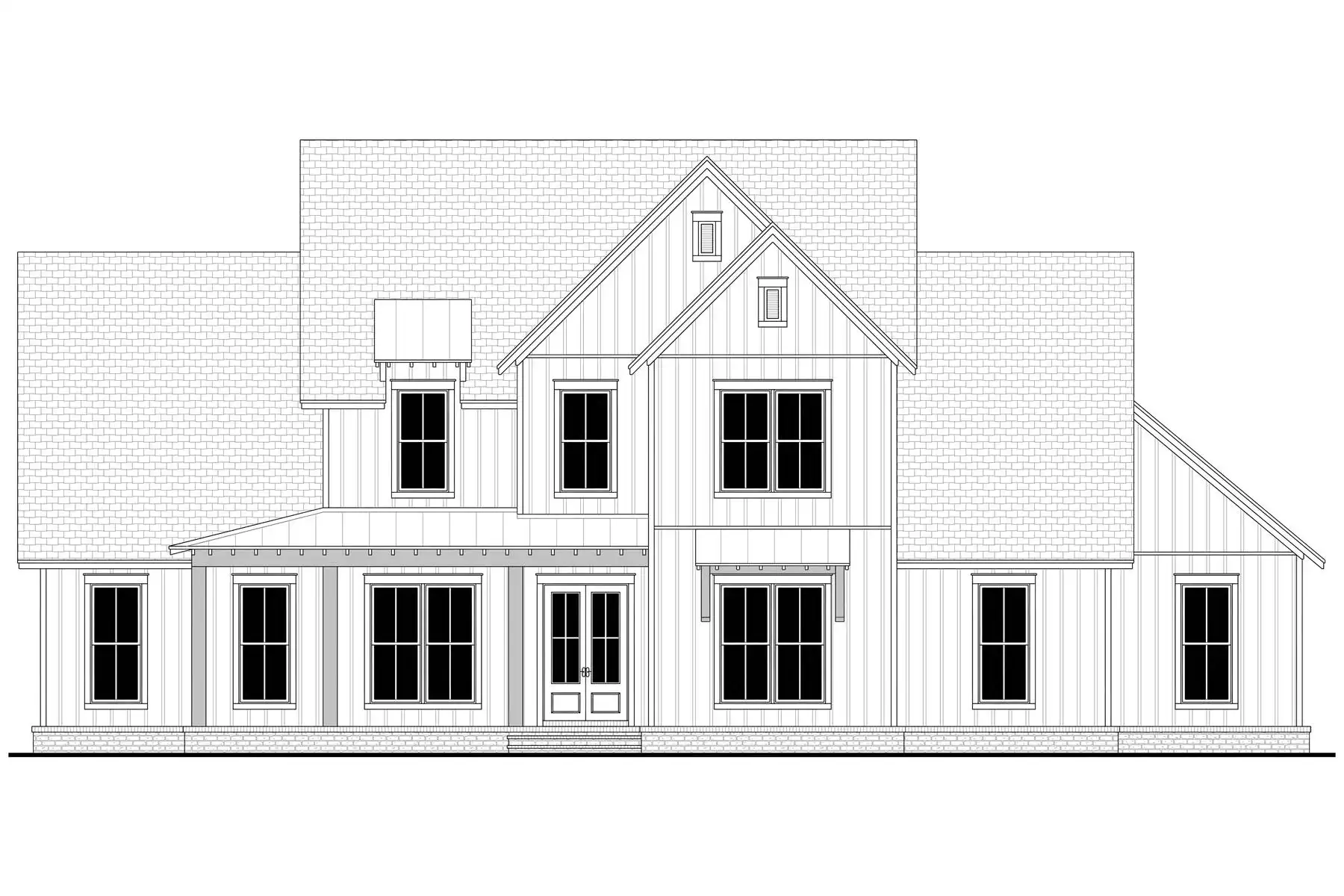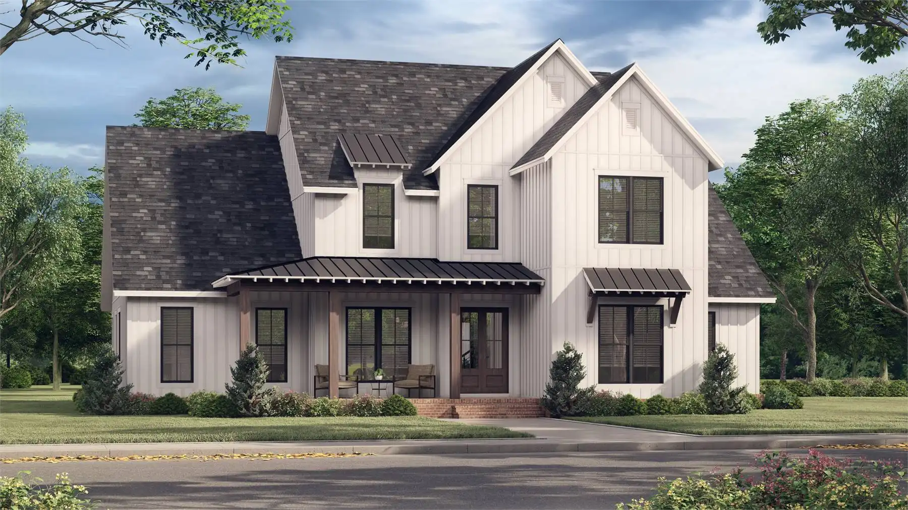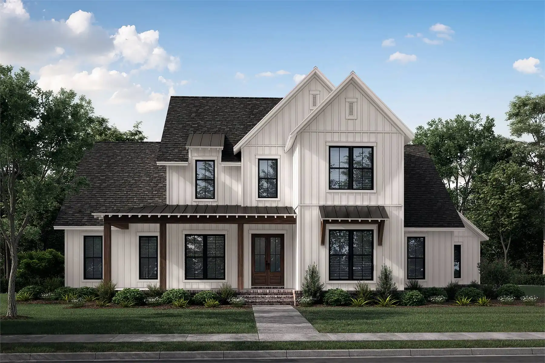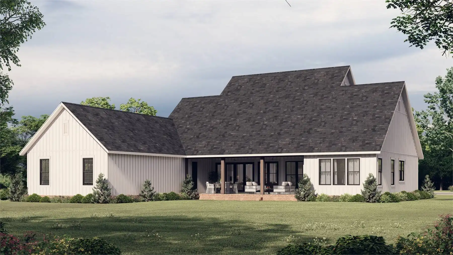 House Plan 12066 showcases a refined modern farmhouse design with a functional two-story layout and timeless curb appeal. The main floor centers around an expansive great room with vaulted details and decorative beams, flowing naturally into the dining area and island kitchen. A first-floor primary suite offers privacy and convenience, while a nearby home office creates an ideal work-from-home setup. The rear porch extends the living space outdoors and includes the option for an outdoor kitchen. Upstairs, three bedrooms are arranged around a central landing, paired with two full bathrooms and a sizable bonus room that can adapt to changing lifestyle needs. An attached rear-entry garage, generous ceiling heights, and smart storage throughout make this plan well-suited for modern family living.
