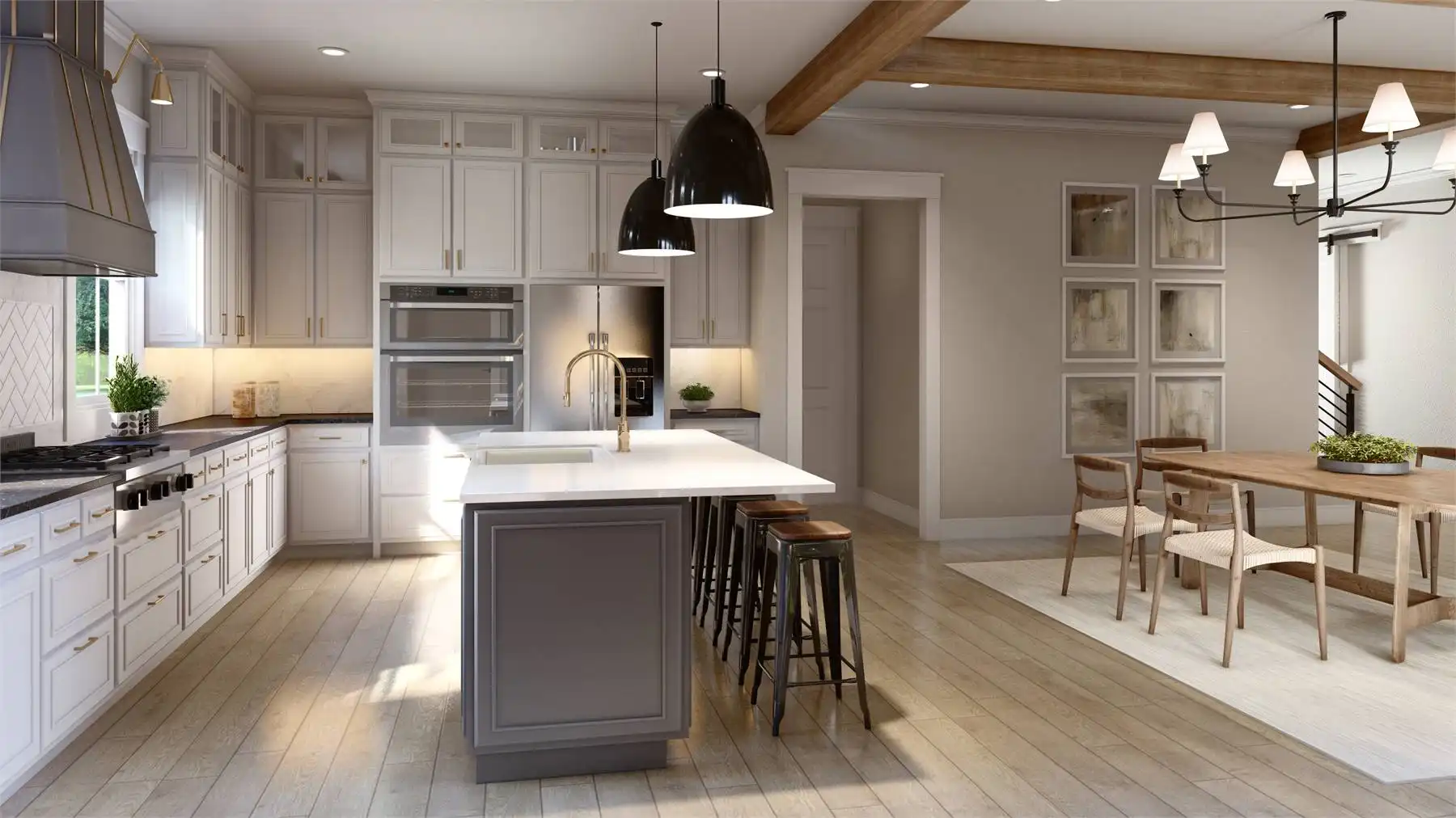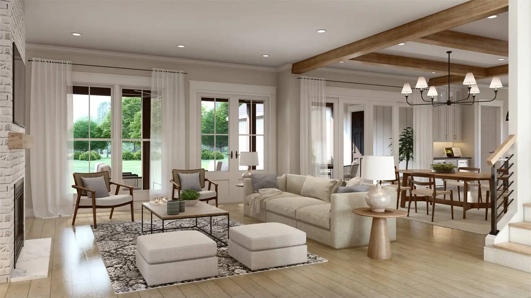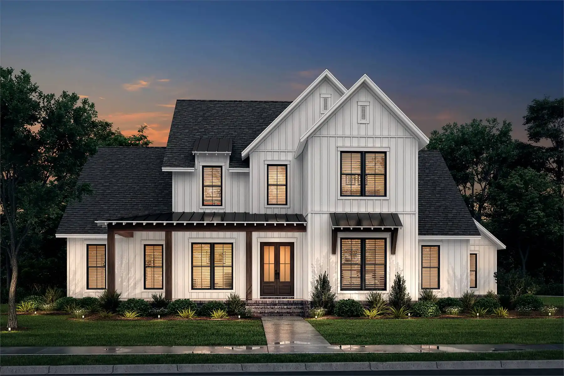 House Plan 12066 showcases a refined modern farmhouse design with a functional two-story layout and timeless curb appeal. The main floor centers around an expansive great room with vaulted details and decorative beams, flowing naturally into the dining area and island kitchen. A first-floor primary suite offers privacy and convenience, while a nearby home office creates an ideal work-from-home setup. The rear porch extends the living space outdoors and includes the option for an outdoor kitchen. Upstairs, three bedrooms are arranged around a central landing, paired with two full bathrooms and a sizable bonus room that can adapt to changing lifestyle needs. An attached rear-entry garage, generous ceiling heights, and smart storage throughout make this plan well-suited for modern family living.