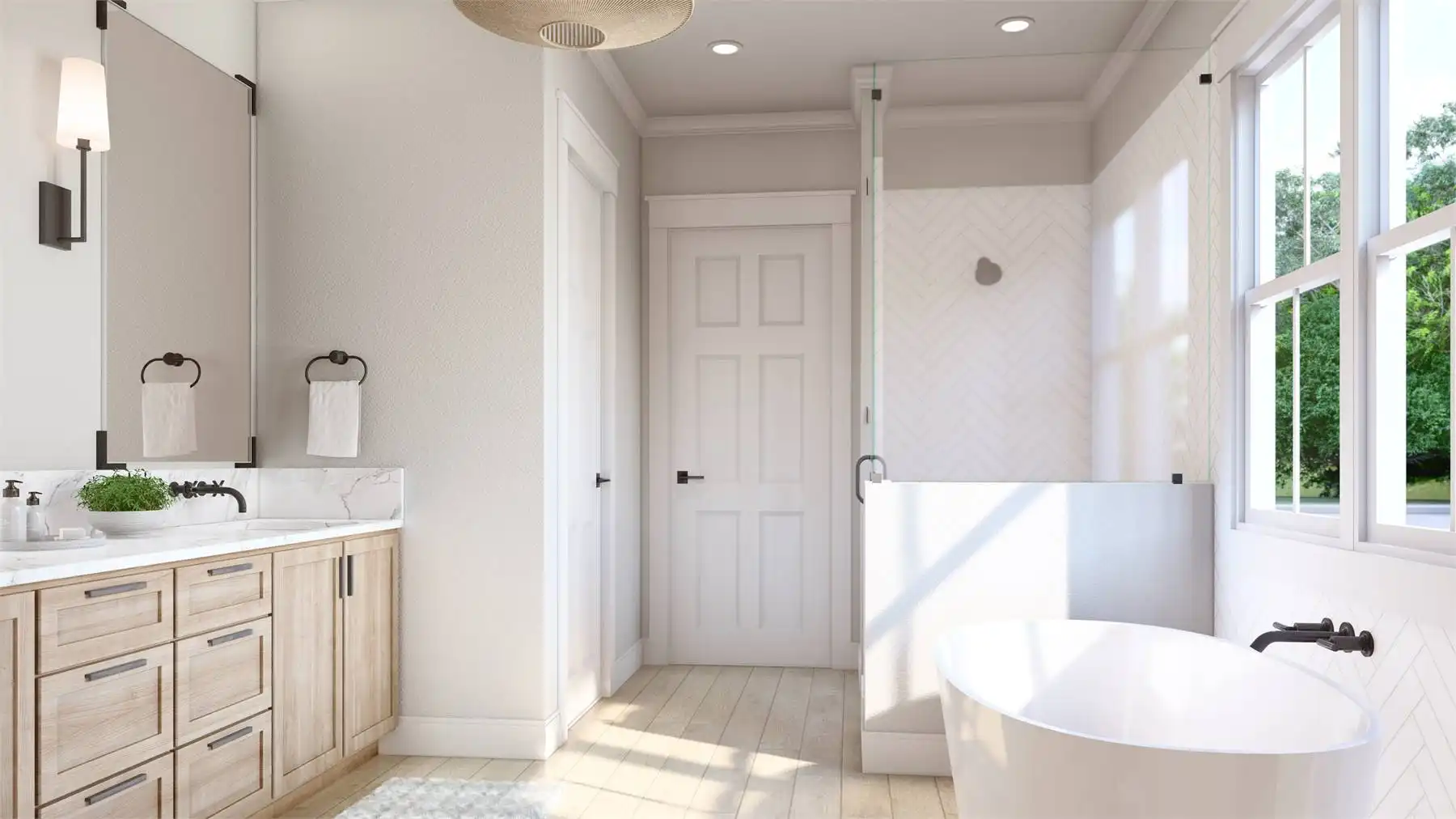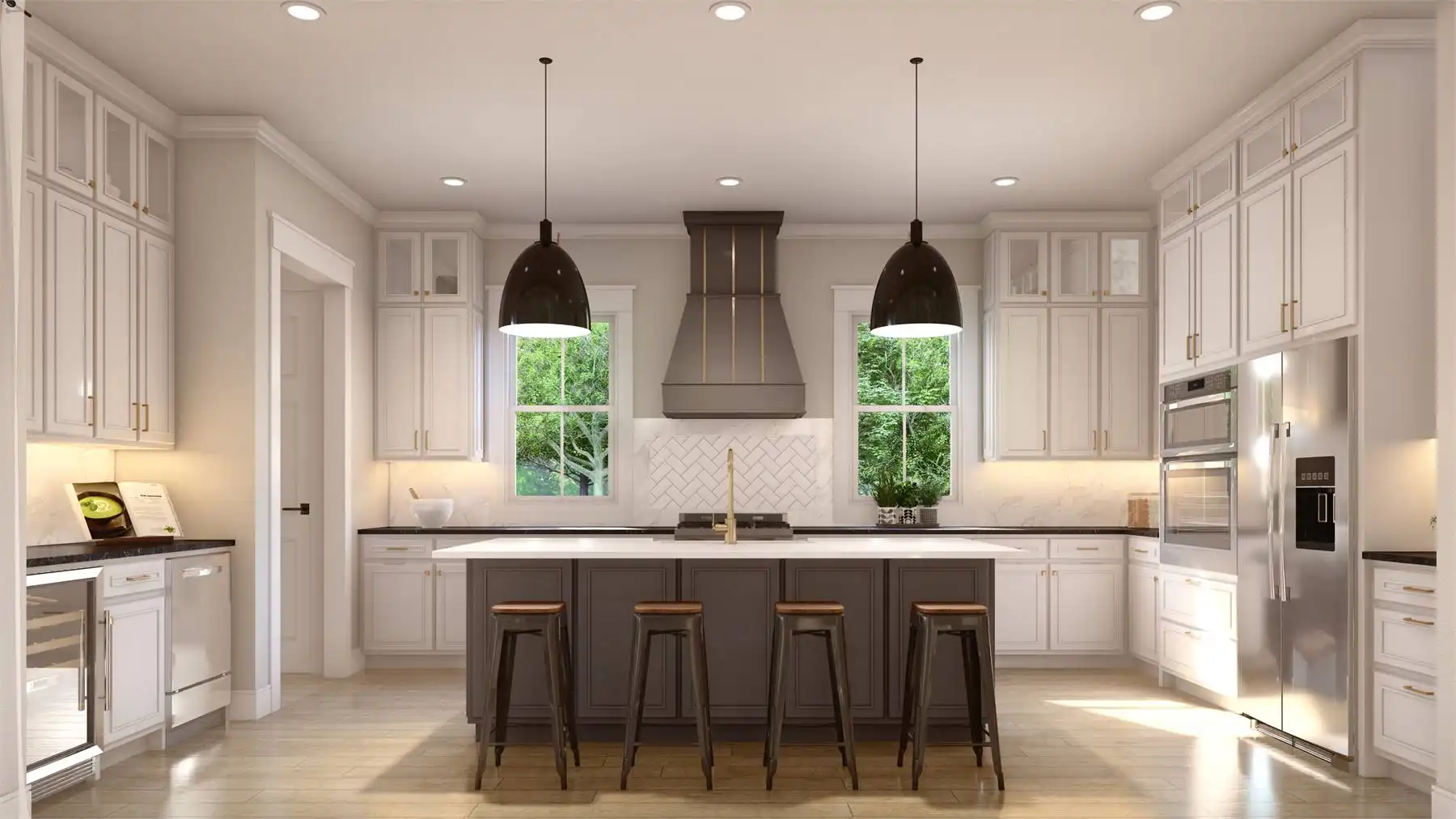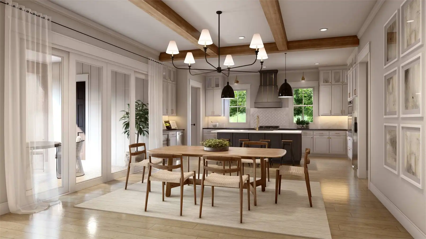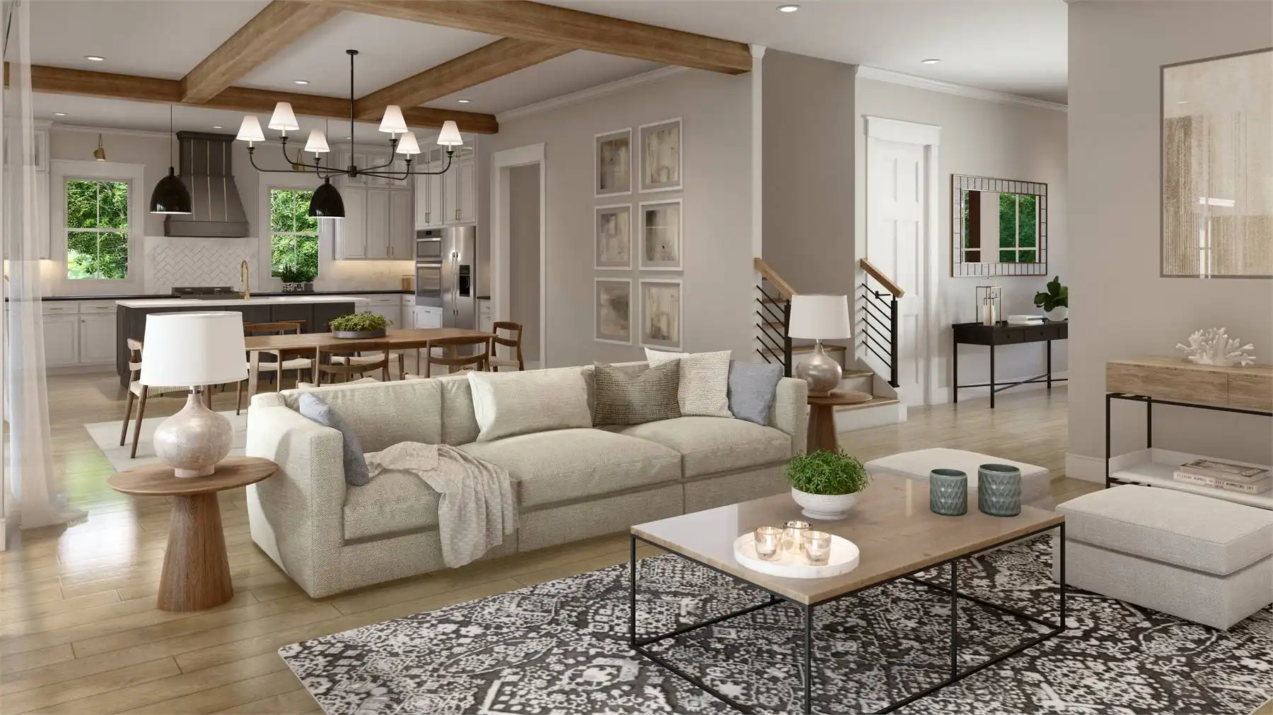 House Plan 12066 showcases a refined modern farmhouse design with a functional two-story layout and timeless curb appeal. The main floor centers around an expansive great room with vaulted details and decorative beams, flowing naturally into the dining area and island kitchen. A first-floor primary suite offers privacy and convenience, while a nearby home office creates an ideal work-from-home setup. The rear porch extends the living space outdoors and includes the option for an outdoor kitchen. Upstairs, three bedrooms are arranged around a central landing, paired with two full bathrooms and a sizable bonus room that can adapt to changing lifestyle needs. An attached rear-entry garage, generous ceiling heights, and smart storage throughout make this plan well-suited for modern family living.