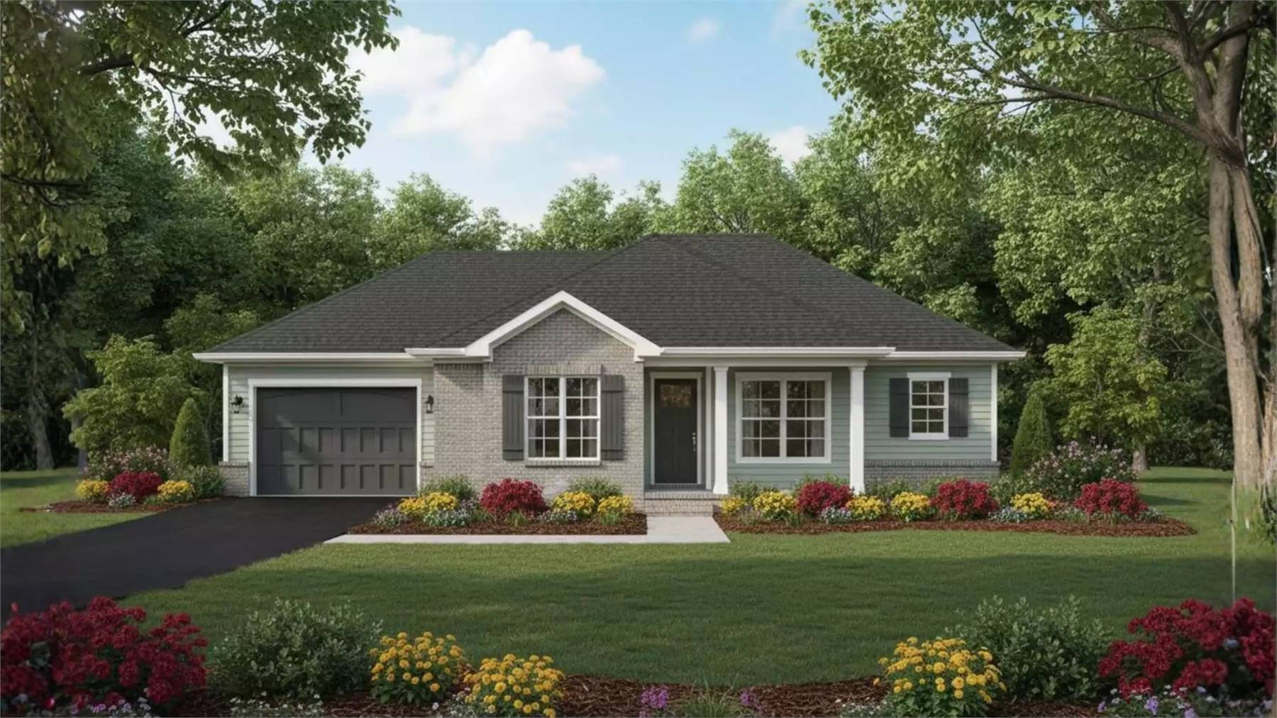 With 1,157 square feet of heated space, this thoughtfully planned home makes the most of every inch. The great room serves as the heart of the home, offering an open layout that flows naturally into the kitchen and breakfast area. The kitchen features an L-shaped design with a pantry, creating a functional setup for daily meals and casual gatherings. The primary bedroom is located on the main floor and includes a walk-in closet and a private bath with double vanities. Two additional bedrooms are positioned separately to provide comfort and flexibility for family or guests. First-floor laundry and a welcoming foyer enhance everyday convenience. Front and rear porches extend the living space outdoors, while the attached garage adds practical storage and easy access.
