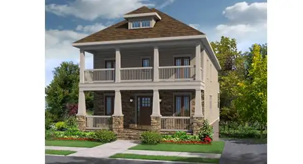 Columns and porches lend a Southern feel to this luxury two-story house plan, with four bedrooms, 3.5 baths and 3,428 square feet of living space. Host any gathering in the spacious family room of this home plan, warmed by a fireplace. A 10-ft. ceiling enhances the entire main floor. The wide-open kitchen boasts a large island and a convenient pantry. Enjoy meals in the dining room or the breakfast nook, or even on the rear deck. Important discussions may be hosted in the quiet living room. Upstairs, the master bedroom showcases a fireplace, a private sundeck and a walk-in closet. A garden tub anchors the posh bath, along with a separate shower and dual vanities. The children will love the walk-in closets in the secondary bedrooms of this home design. The second bedroom could accommodate overnight guests, with its personal bath. With front porch access, the third and fourth bedrooms share a Jack and Jill bath. Our customers love the quiet study or home office. On the lower level, a finished entry area is adjacent to the double garage with storage. Future areas may be finished later, or left unfinished for storage. The narrow width of this home makes it suitable for almost any lot. This home fits both Low Country style with ground level storage or narrow lot