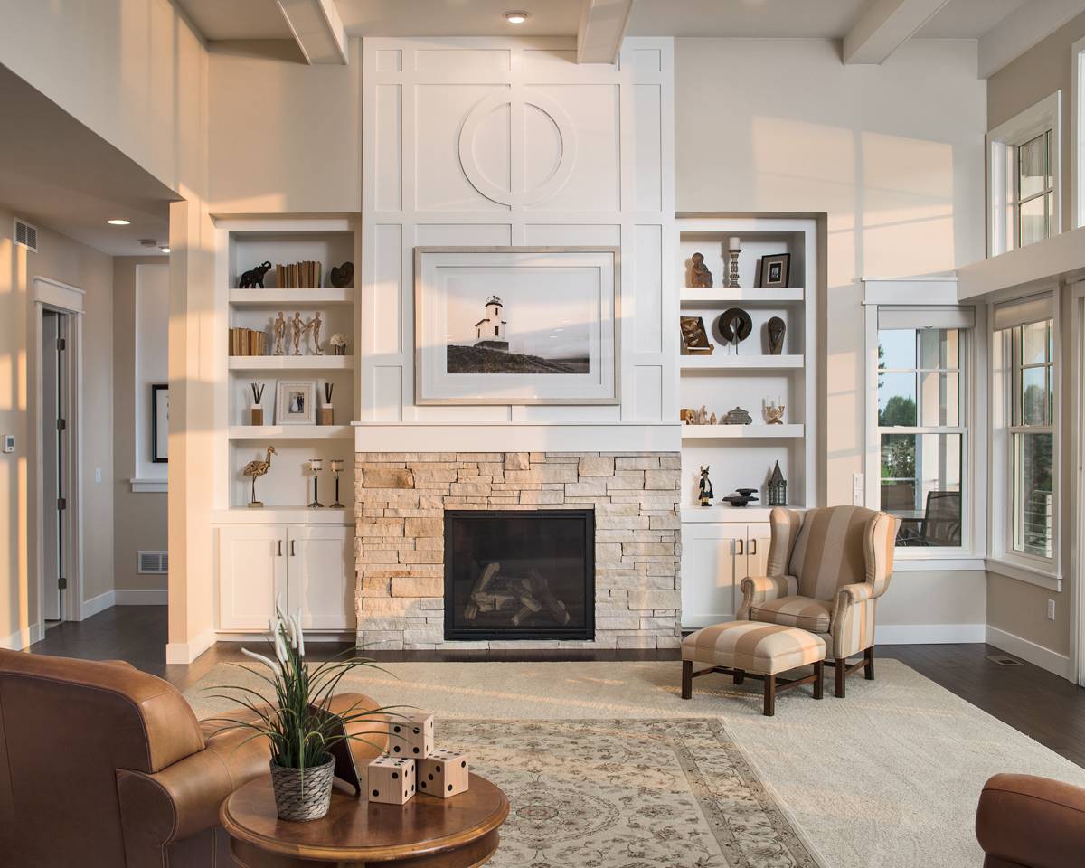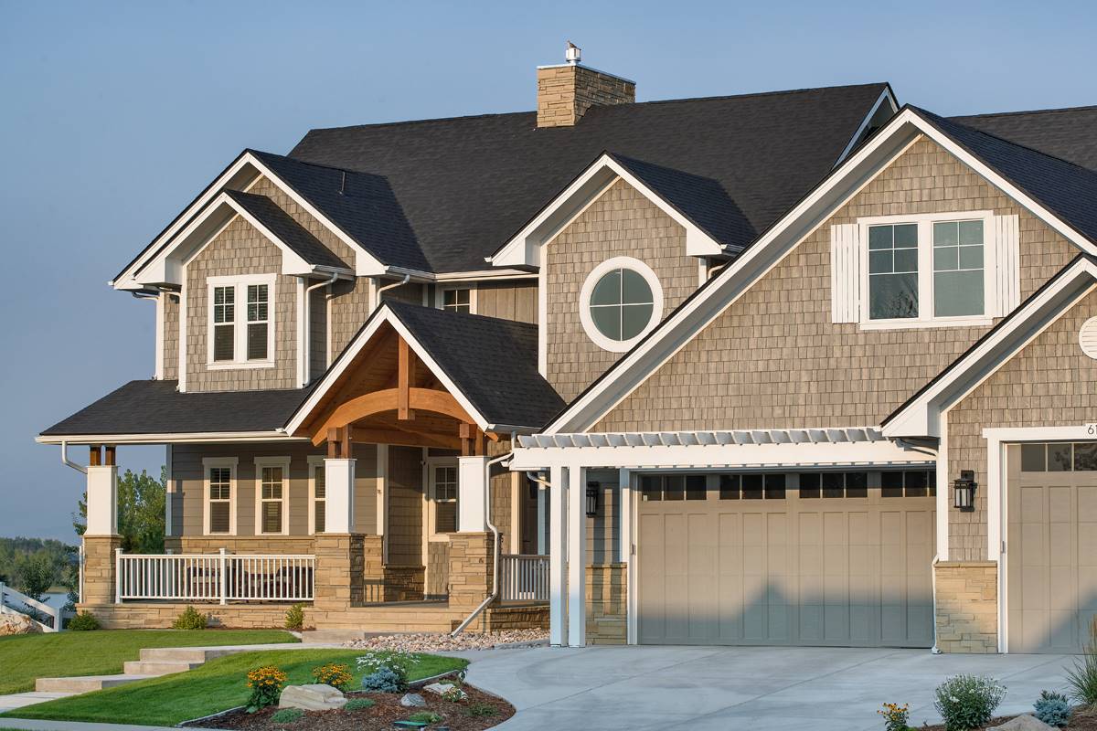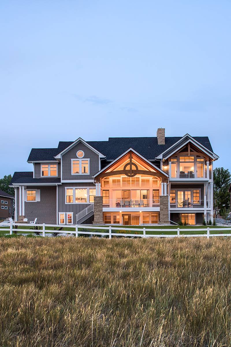 House Plan 12153 offers refined two-story living with standout architectural details and generous space for both entertaining and everyday comfort. The exterior showcases shake shingles, a distinctive circular window, and a welcoming covered porch that hints at the elegant design within. A dramatic two-story living room anchors the main level, where retractable sliding doors invite outdoor living into the heart of the home. The kitchen is centered around an oversized island and opens to a dining area overlooking the rear lawn. A private bedroom suite on the main floor is ideal for guests, offering deck access, a spacious bathroom, and a walk-in closet. Upstairs, the primary suite features its own deck, two walk-in closets, and a well-appointed ensuite with dual vanities and a separate commode room. A third bedroom, full four-fixture bathroom, and study complete the upper level. The optional lower level adds valuable living space with a recreation room, walk-out patio, and two additional bedrooms served by a full bath. With a four-car garage and a practical mudroom and laundry space with built-ins, this plan is designed to support an organized and elevated lifestyle.