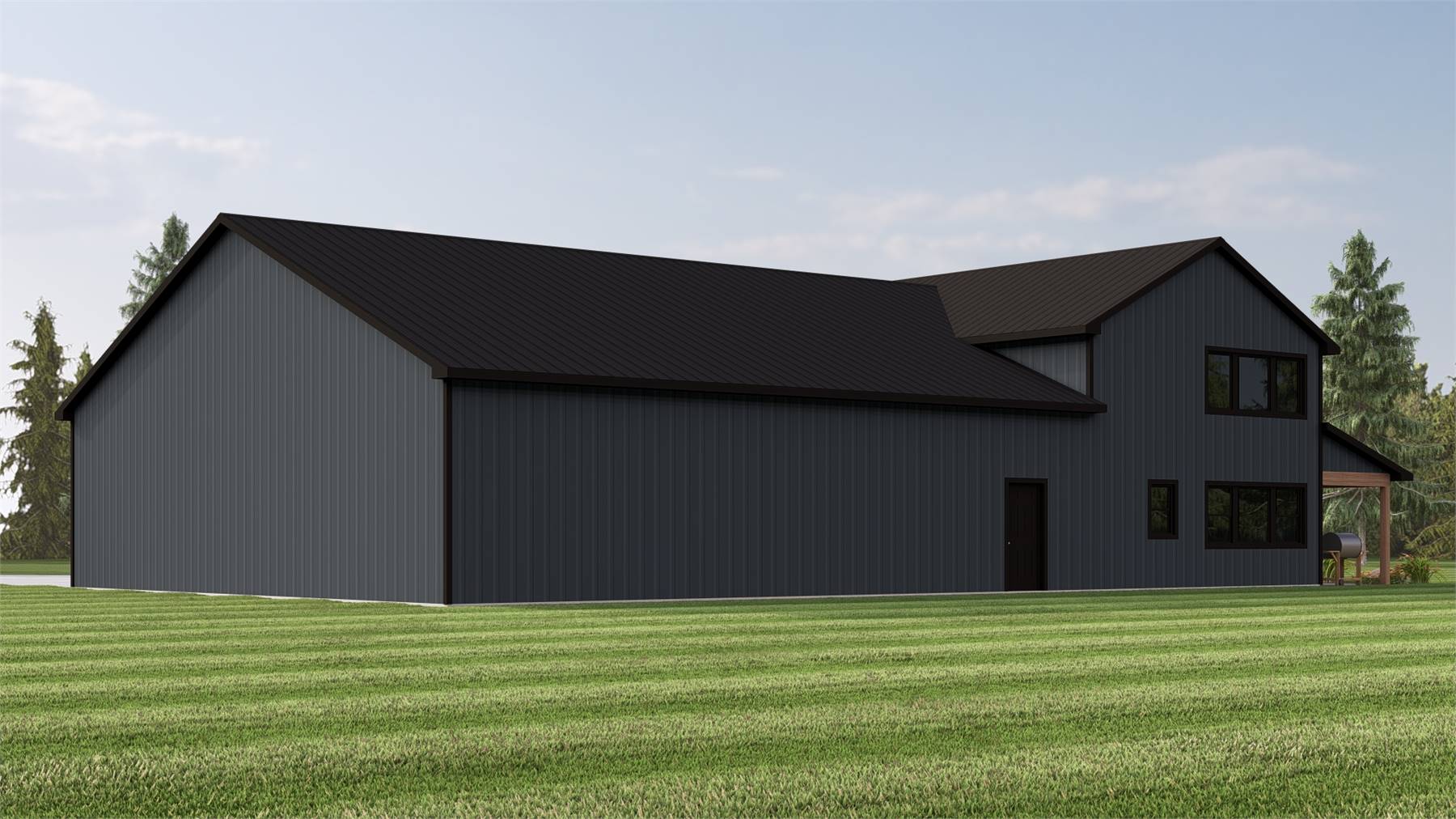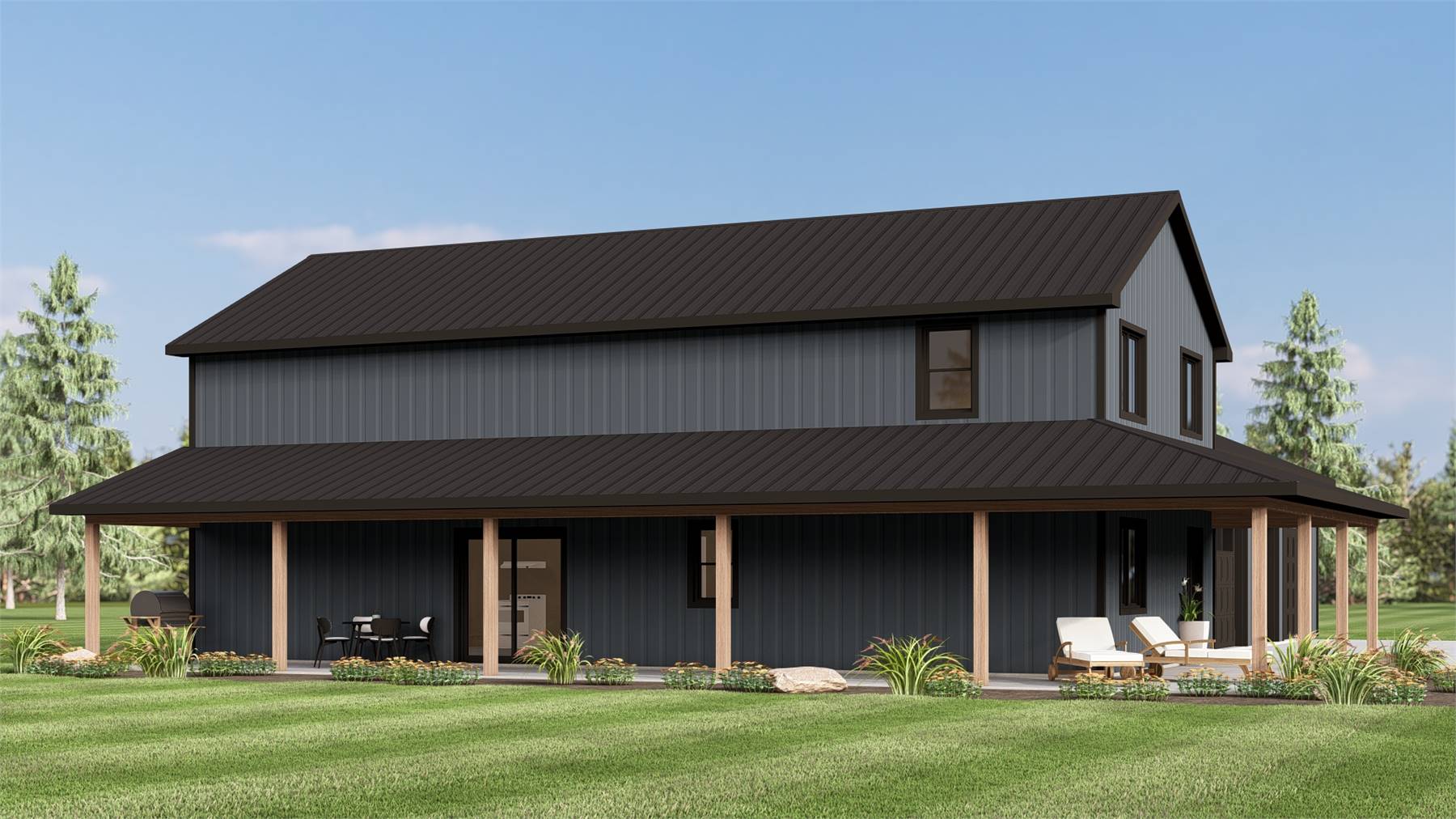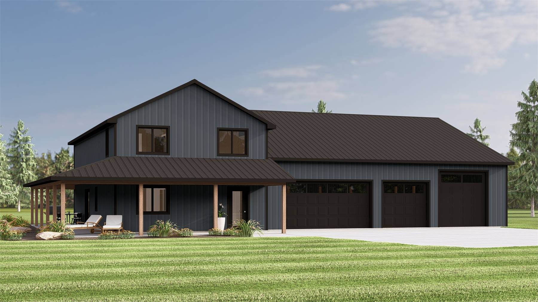 House Plan 12171 is a versatile barndominium-style design that pairs efficient living space with an expansive garage and workshop. The main floor offers an open-concept layout anchored by a kitchen with island seating, walk-in pantry, and easy flow to the living and dining areas. The primary bedroom is located on the main level and includes dual closets and a private bath for everyday comfort. Two additional bedrooms are positioned in a split layout to maintain privacy. A loft level adds flexible square footage that works well as an office, studio, or hobby space. With its oversized attached garage, wraparound porch, and farmhouse-inspired exterior, this plan is well suited for rural properties, workshops, or multi-use living.