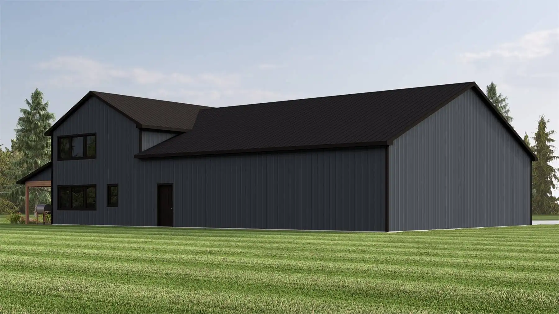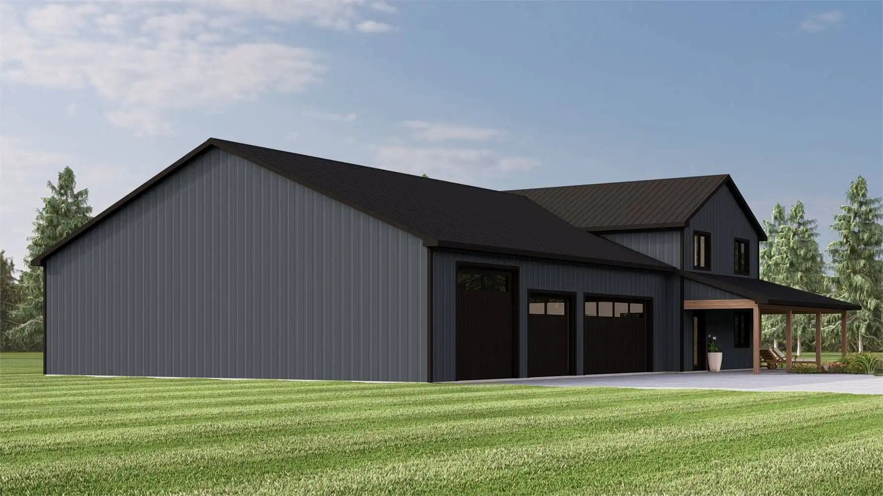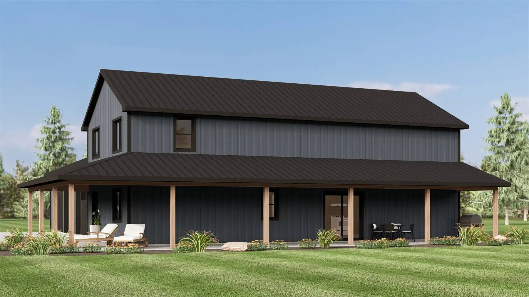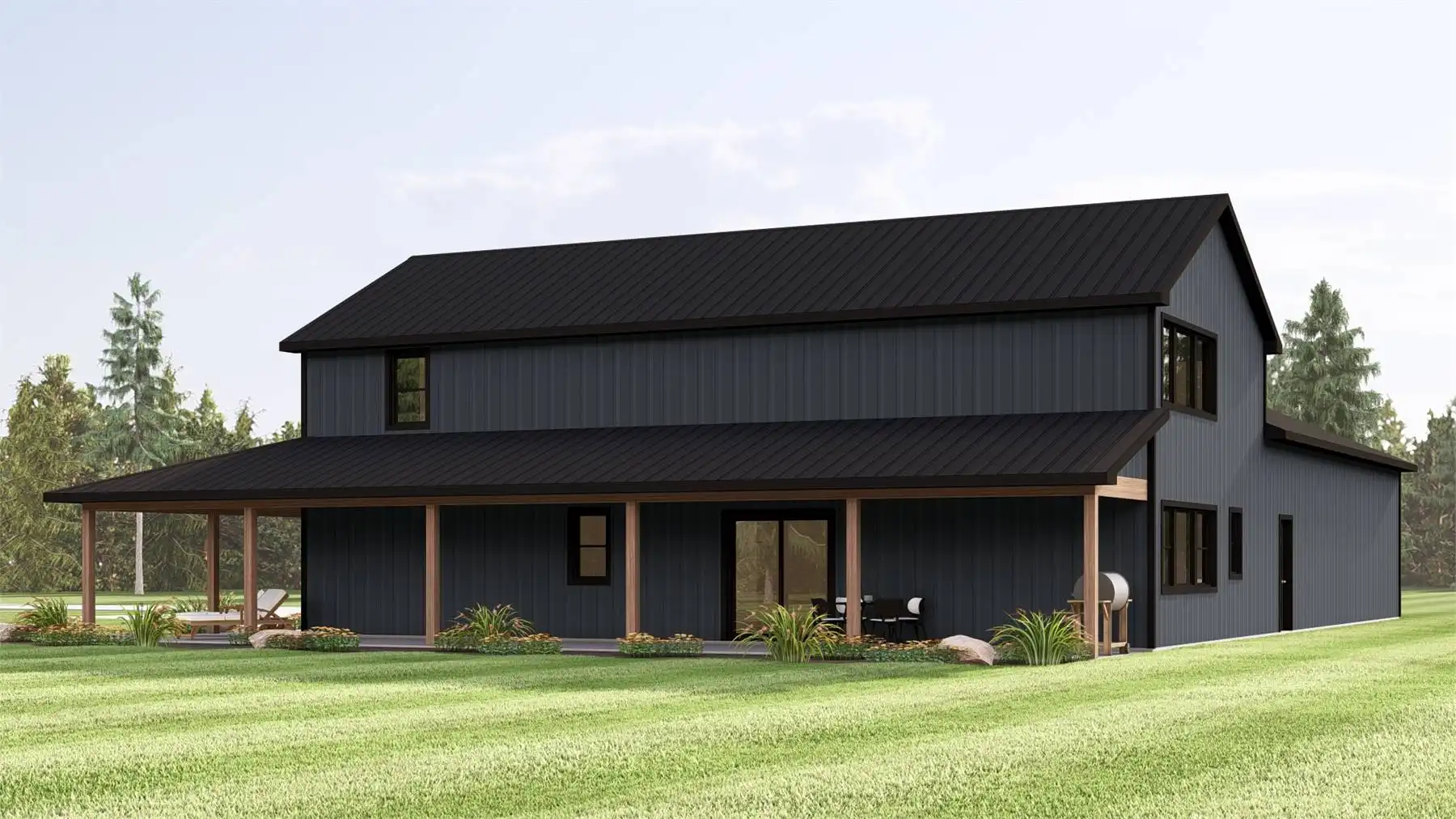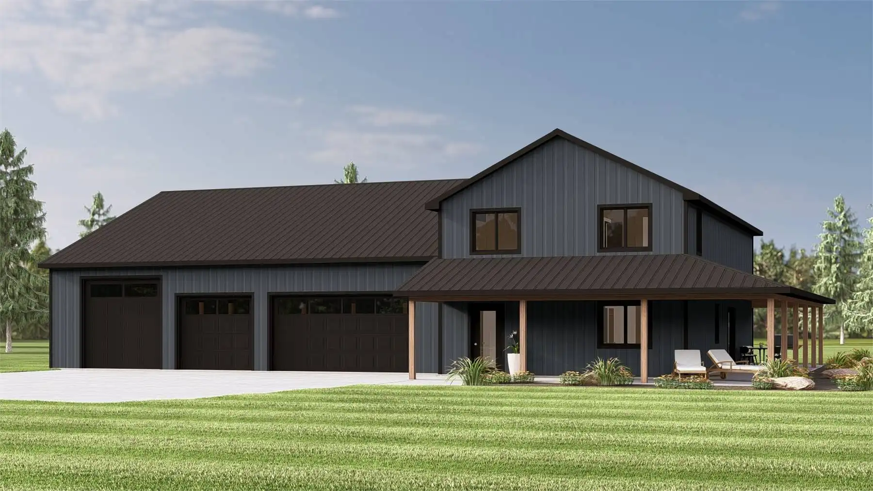 House Plan 12171 is a versatile barndominium-style design that pairs efficient living space with an expansive garage and workshop. The main floor offers an open-concept layout anchored by a kitchen with island seating, walk-in pantry, and easy flow to the living and dining areas. The primary bedroom is located on the main level and includes dual closets and a private bath for everyday comfort. Two additional bedrooms are positioned in a split layout to maintain privacy. A loft level adds flexible square footage that works well as an office, studio, or hobby space. With its oversized attached garage, wraparound porch, and farmhouse-inspired exterior, this plan is well suited for rural properties, workshops, or multi-use living.