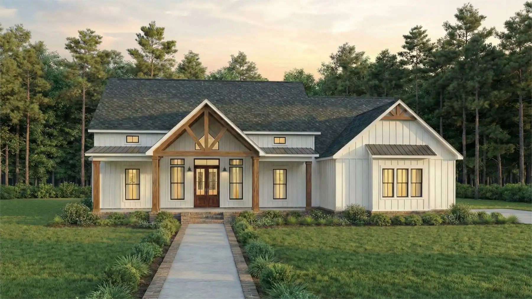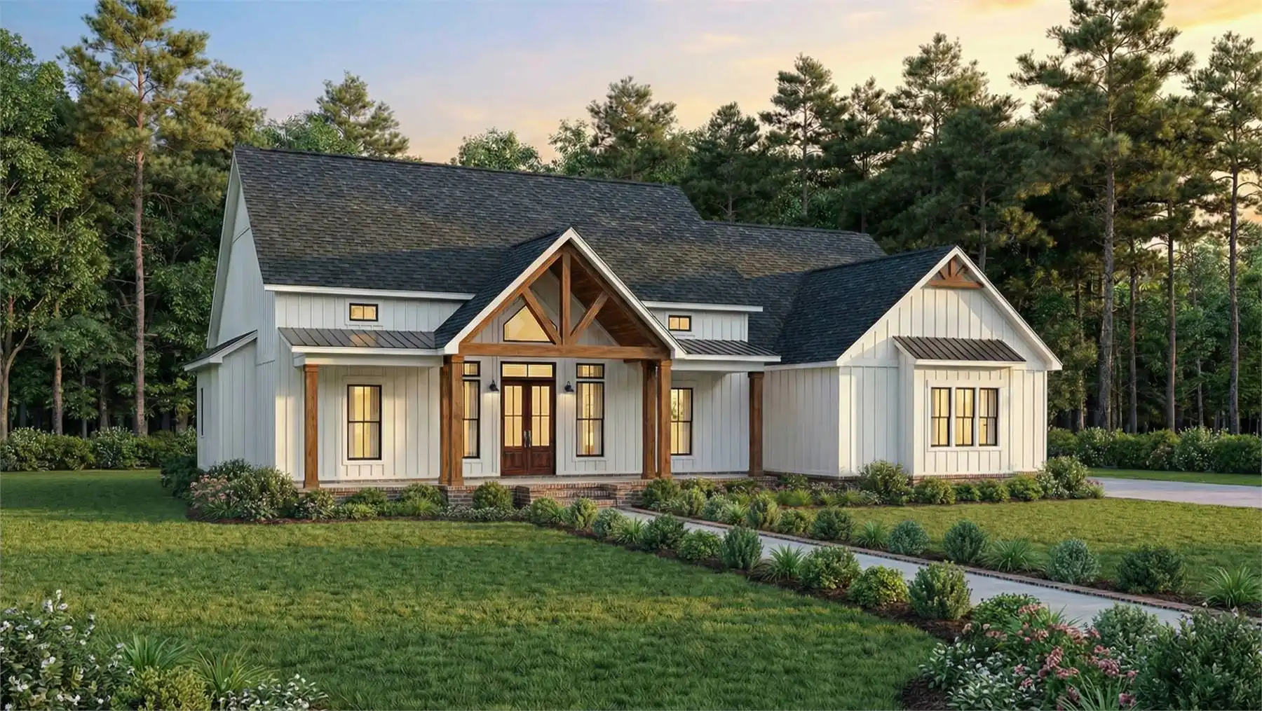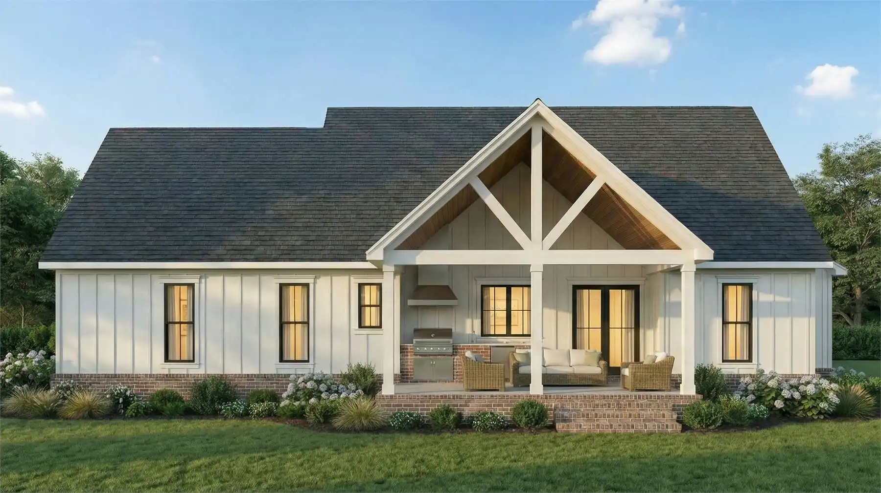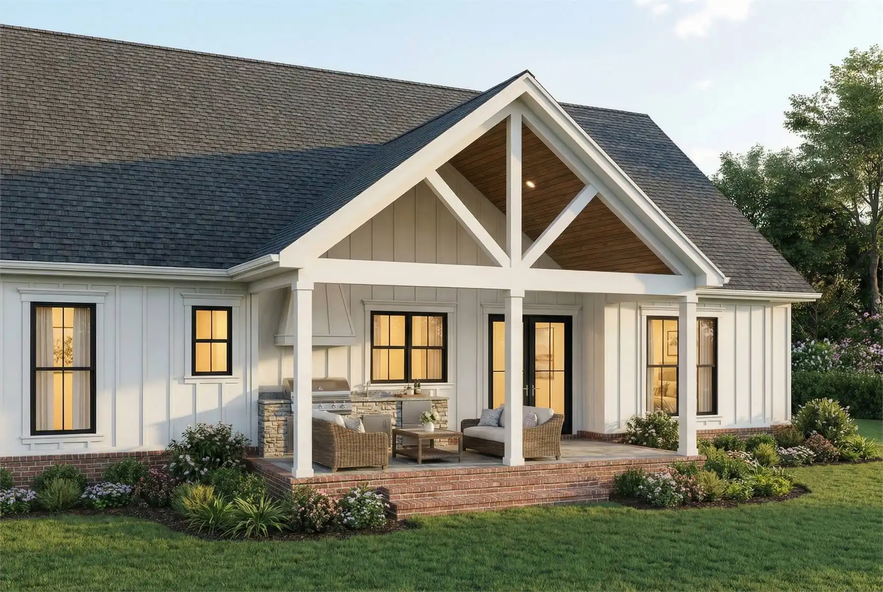 Offering 2,185 square feet of heated space, this home delivers a well-balanced layout designed for both comfort and connection. Vaulted ceilings highlight the great room and kitchen, allowing natural light to fill the open living areas. The kitchen is equipped with an island, peninsula eating bar, and walk-in pantry, making it ideal for family meals and entertaining alike. A centrally located fireplace anchors the great room and adds warmth to the main living space. The primary bedroom is positioned on the main floor and includes a walk-in closet, double vanity, and a separate tub and shower. Three additional bedrooms are thoughtfully placed to provide flexibility for family, guests, or work-from-home needs. Outdoor living is enhanced by covered porches and an outdoor kitchen, creating inviting spaces to relax and gather year-round.