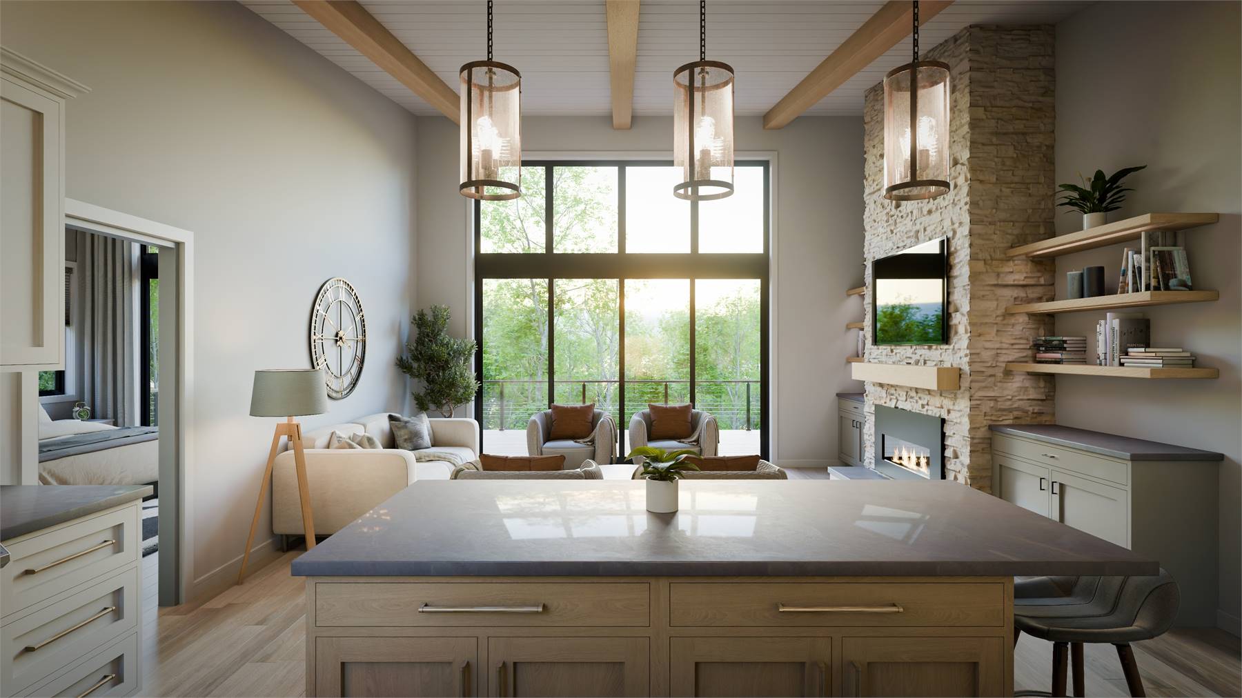 House Plan 12209 offers a modern mountain layout designed for both comfort and entertaining. The open-concept main level features a spacious great room with a mono-slope ceiling, a well-appointed kitchen with island seating, and seamless access to a generous rear deck that stretches the full width of the home. A private primary suite anchors the main floor, paired with a second bedroom ideal for guests or work-from-home needs. The lower level expands living space with a recreation room and wet bar, three additional bedrooms, and a full bath, plus an unfinished area ready for future use. With its strong indoor and outdoor connection and flexible lower level, this plan is well suited for active lifestyles and scenic settings.