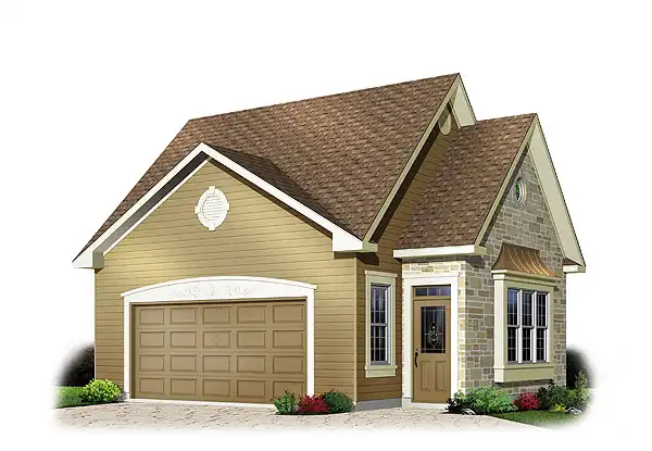 A copper-top window on this garage's left side combines with stone for a European flavor. Upstairs, seasonal items find their place in the spacious storage room.