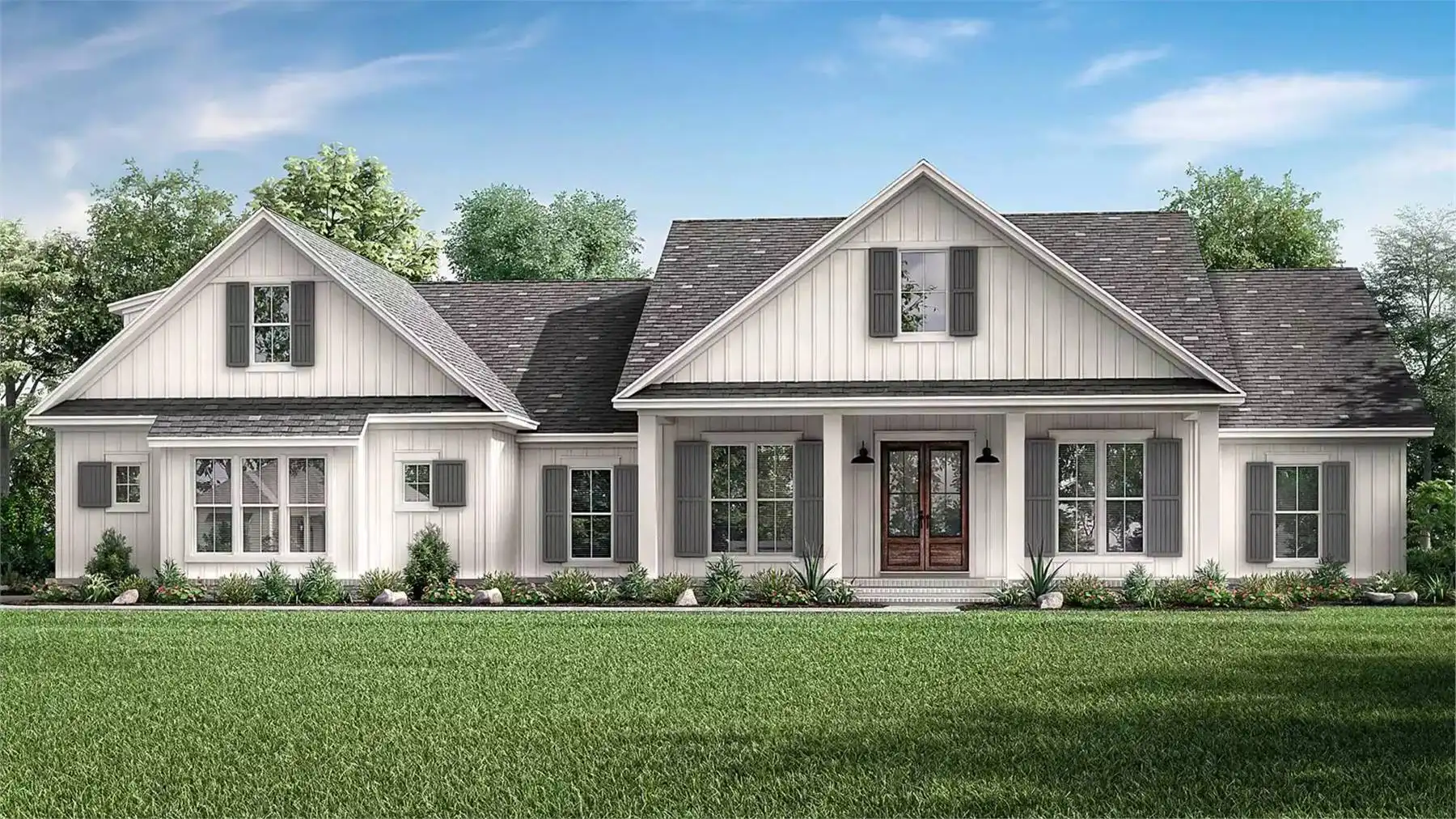 Designed with both function and warmth in mind, this 2832 square feet home plan features 4 bedrooms and 3 baths in a spacious single level layout with an added bonus room above. The open floor plan centers around a comfortable great room with a fireplace that connects naturally to the dining room and kitchen. A well-appointed L-shaped kitchen includes a central island, peninsula eating bar, and walk-in pantry, making meal prep and gatherings effortless. The main level primary suite offers privacy and comfort with a generous walk-in closet, double vanity sink, and separate tub and shower. Secondary bedrooms are thoughtfully arranged in a split layout to ensure quiet and personal space. A private home office provides the flexibility today’s households need, while abundant storage keeps everything organized. First-floor laundry and a mud room add everyday practicality near the attached 2 car front-entry garage with side-entry option. With inviting covered porches and an outdoor kitchen perfect for entertaining, this home blends spacious design with the welcoming feel every family desires.