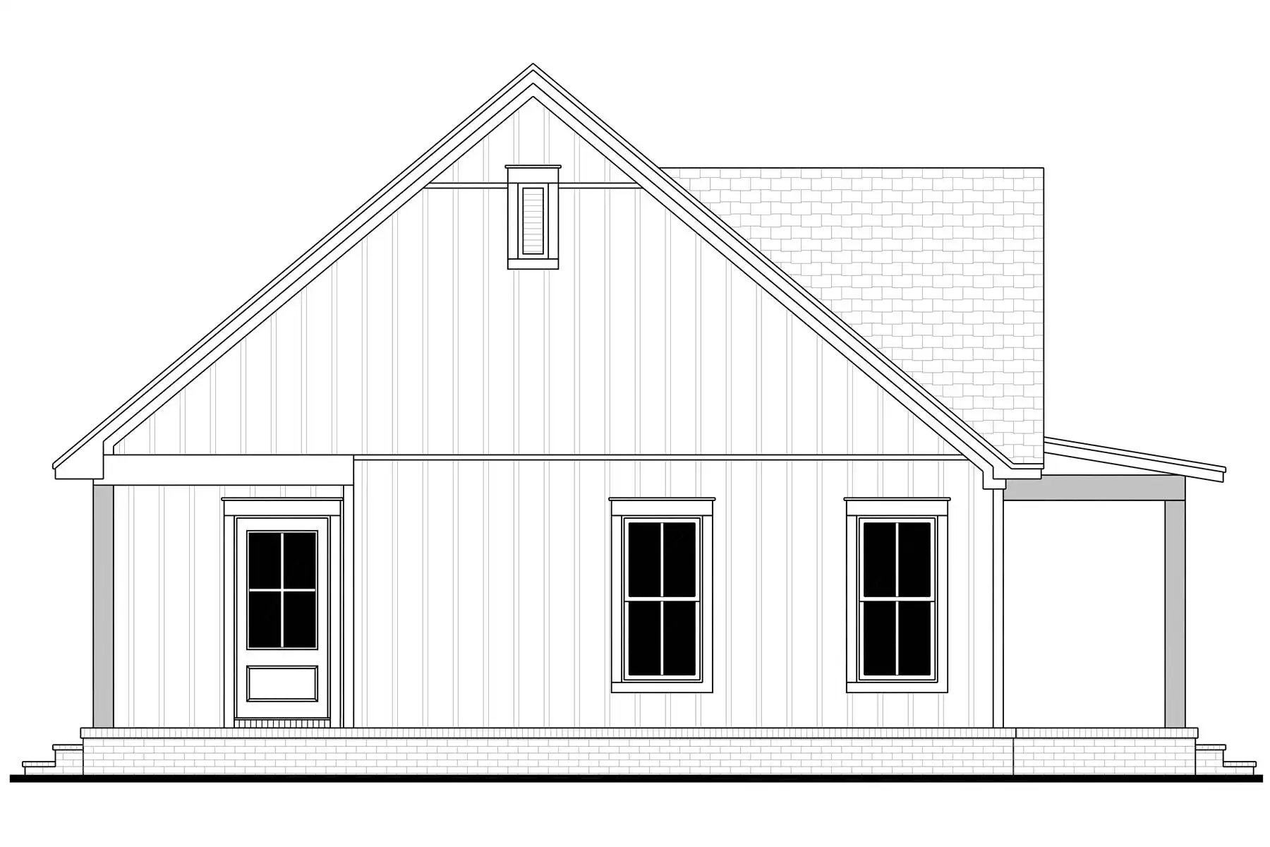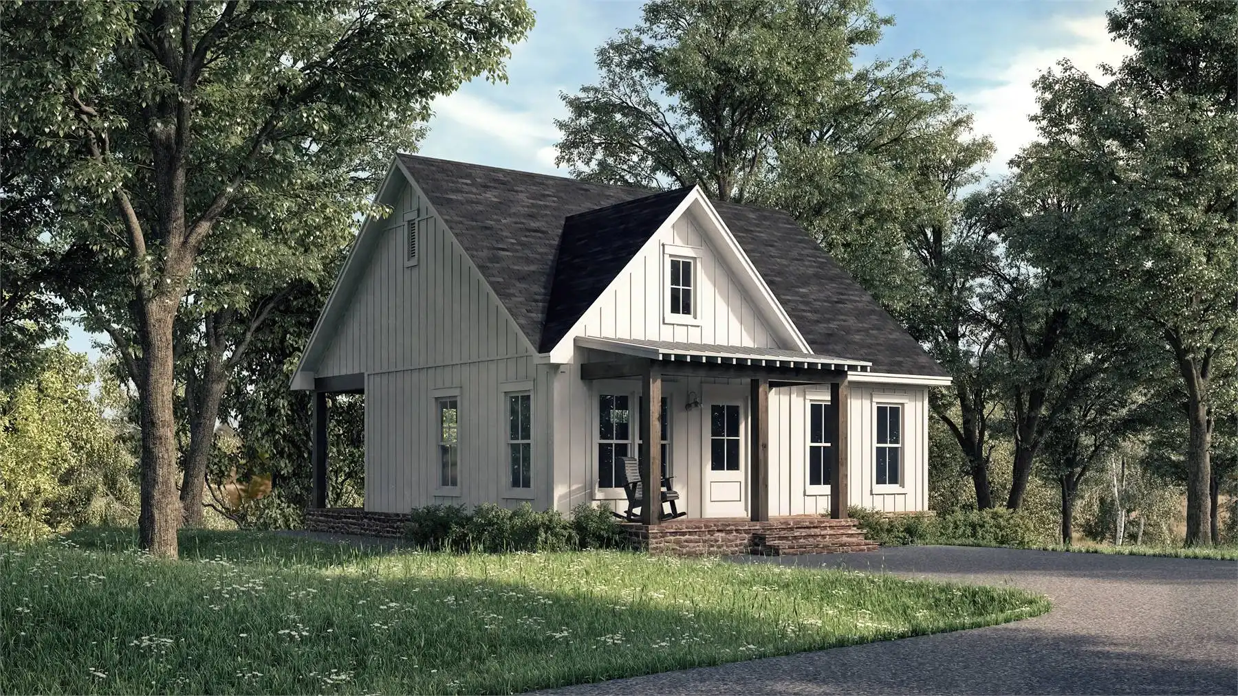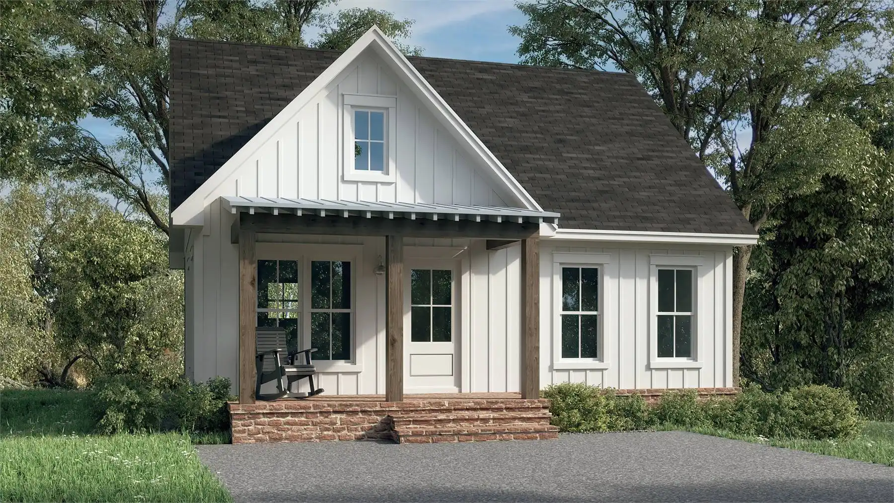 Designed for easy living, this 780 square feet home plan features 1 bedroom and 1 bath in a smart single level design. The open floor plan blends the formal living room with the kitchen, creating a comfortable central gathering space. The L-shaped kitchen offers practical functionality while keeping the layout simple and efficient. A main level primary bedroom provides convenience and privacy in a compact footprint. First-floor laundry ensures daily tasks remain effortless and accessible. Step outside to enjoy both the covered front porch and rear porch, perfect for quiet mornings or relaxing evenings. With its efficient use of space and inviting layout, this home delivers comfort and charm in a beautifully streamlined design that feels welcoming from the moment you arrive.