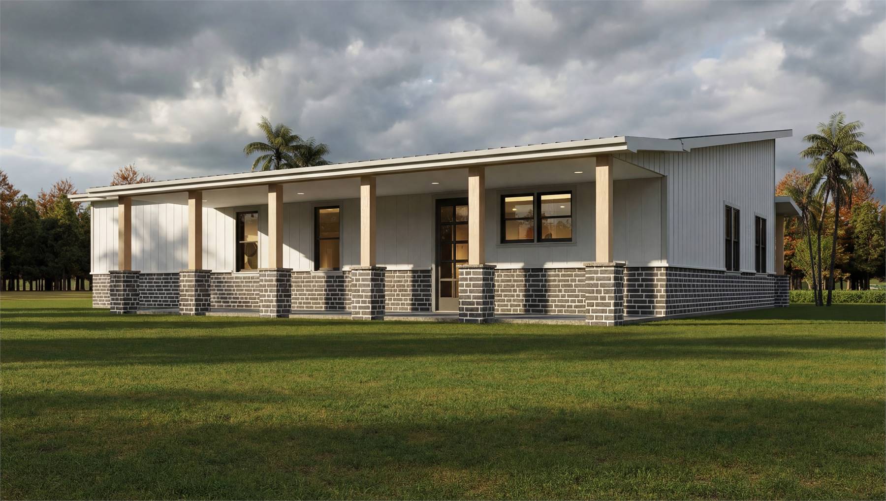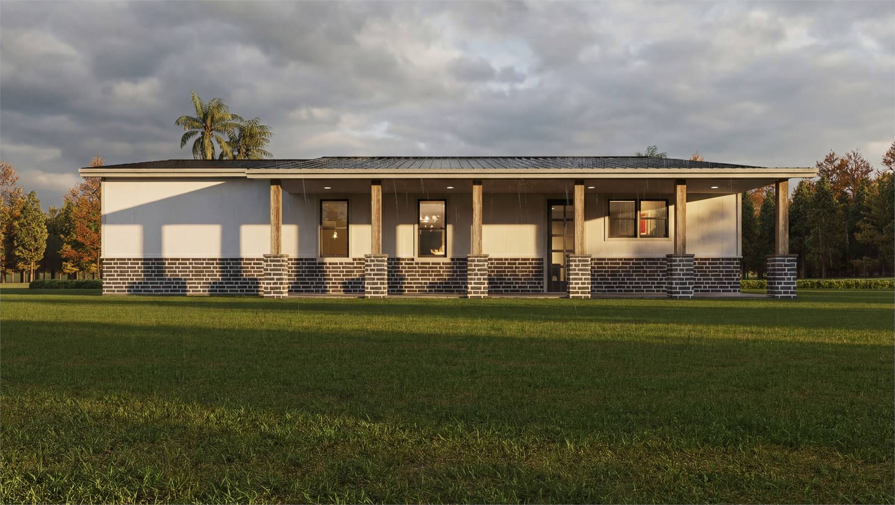 Designed for efficiency and comfort, this 1368 square feet single story home plan includes 2 bedrooms and 2 baths arranged within a smart open layout. The great room connects easily to the dining area and L-shaped kitchen, encouraging natural flow and interaction. The kitchen is equipped with a spacious island, peninsula eating bar, and walk-in pantry to support daily routines and entertaining. The main level primary suite offers privacy with a walk-in closet and dual vanity bath. A second bedroom accommodates guests or family with ease. A mud room and first-floor laundry provide everyday convenience, while covered front and rear porches create inviting outdoor spaces. The attached side-positioned garage with front-entry access completes this thoughtfully designed home.