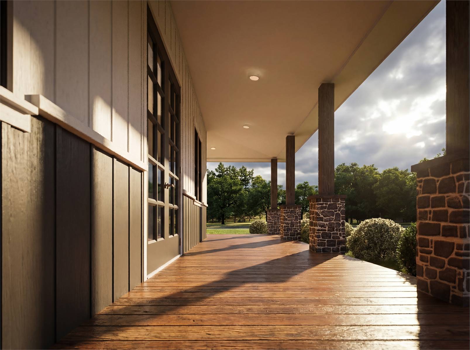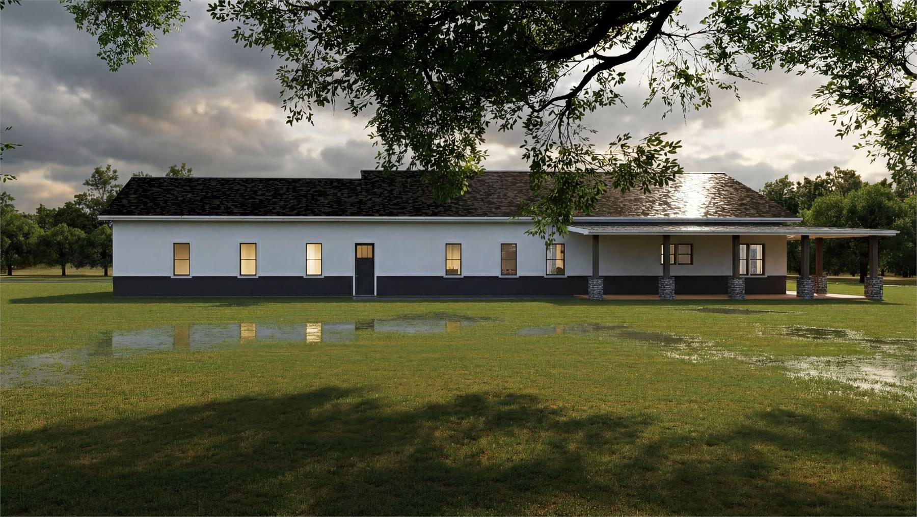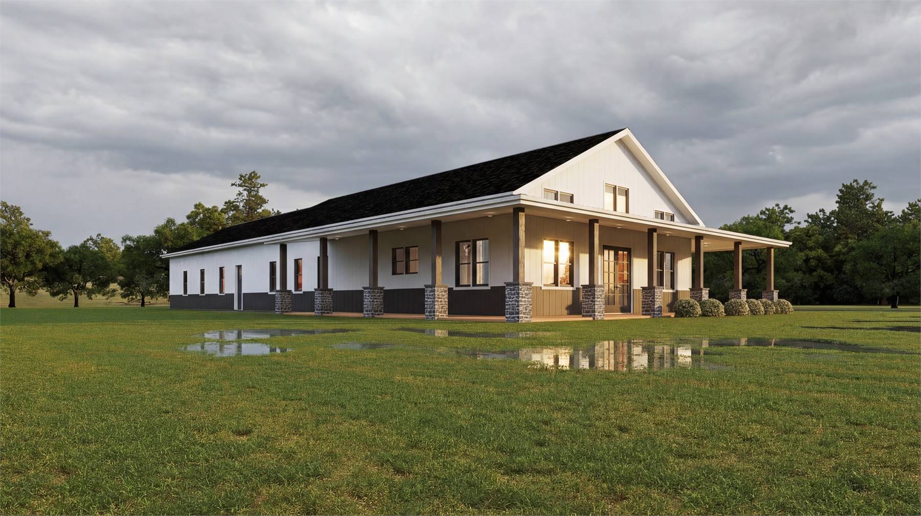 Designed with both style and functionality in mind, this 2322 square feet single story home plan includes 4 bedrooms and 3 baths arranged within a bright, open layout. The vaulted ceiling in the great room enhances the sense of space while maintaining a warm connection to the dining area and kitchen. The L-shaped kitchen is equipped with a central island, peninsula eating bar, and butlers pantry to support daily living and gatherings. The main level primary suite provides privacy and convenience with a walk-in closet and dual vanities. Secondary bedrooms are thoughtfully positioned to accommodate family or guests. A home office, mud room, and first-floor laundry add organization and versatility. Generous covered porches and a wraparound outdoor living area create inviting spaces for relaxation, while the attached side-entry garage completes this well-rounded design.