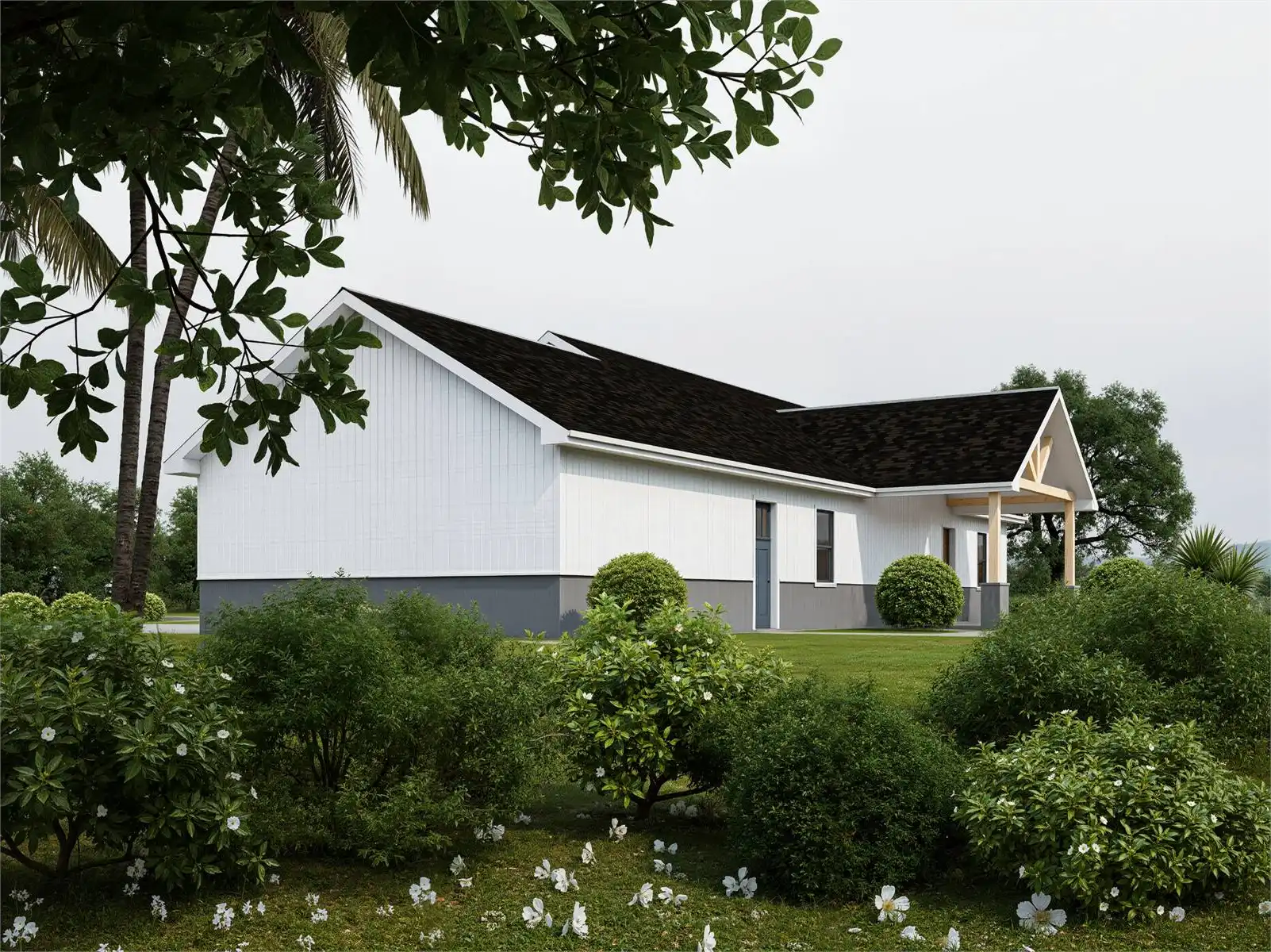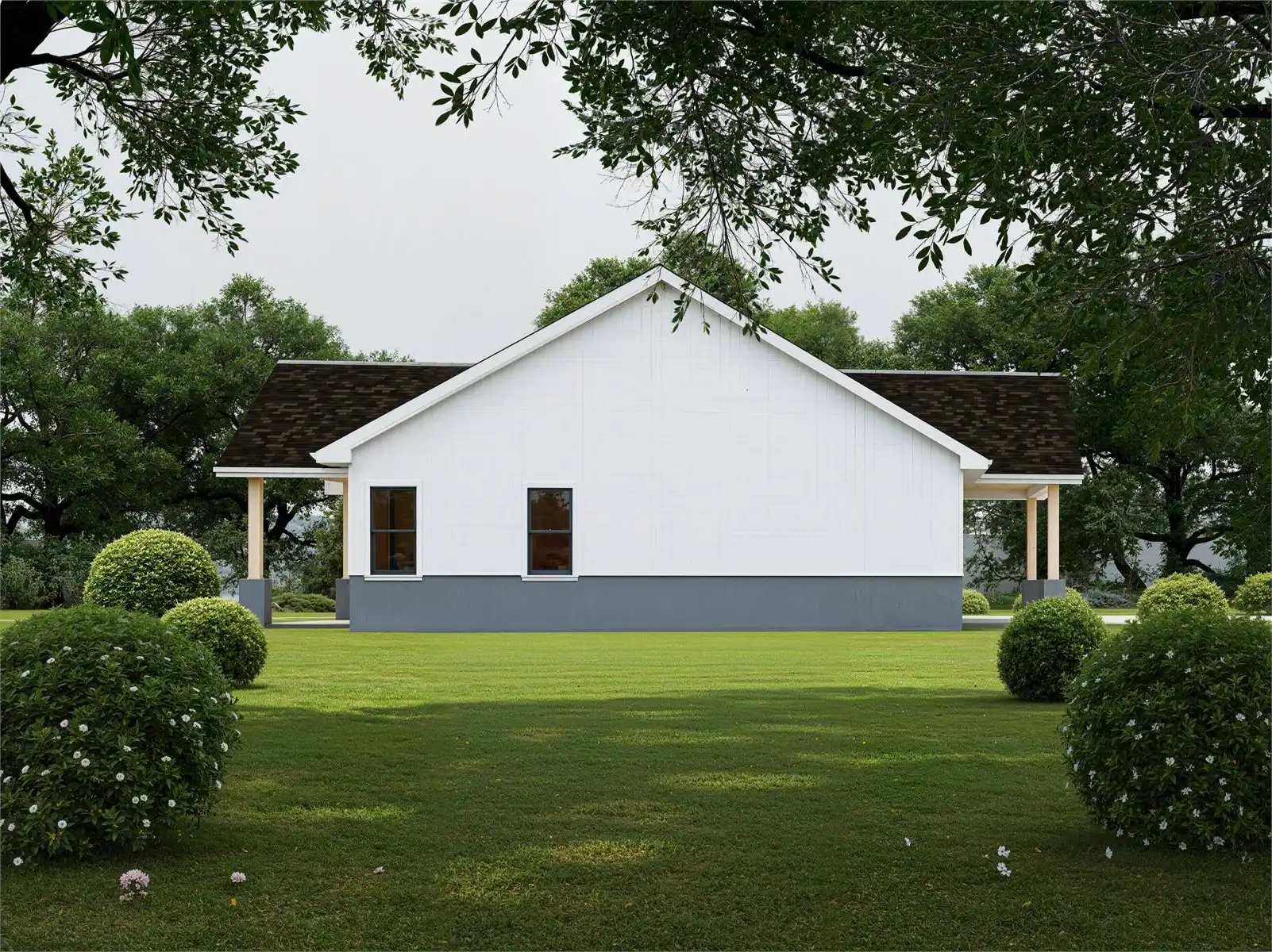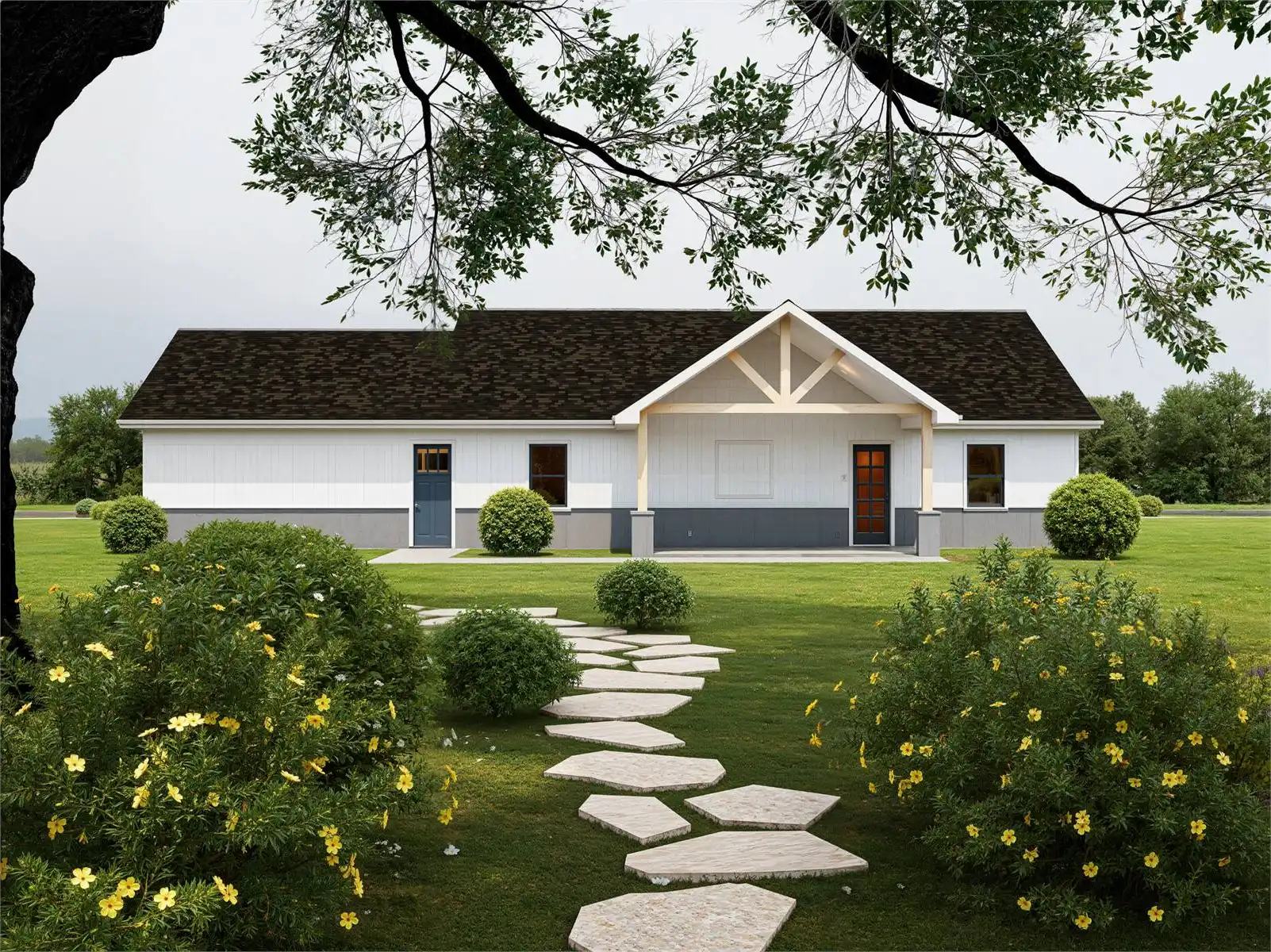 Designed for modern living, this 1660 square feet single story home plan includes 3 bedrooms and 2 baths arranged within a bright and functional layout. The vaulted ceiling in the great room enhances the sense of openness while maintaining easy flow to the dining area and kitchen. The L-shaped kitchen is equipped with an island, peninsula eating bar, and walk-in pantry to support both daily routines and entertaining. The main level primary suite offers privacy with a spacious walk-in closet, dual vanities, and a separate tub and shower. Secondary bedrooms are thoughtfully positioned in a split configuration for added comfort. A home office, mud room, and first-floor laundry provide practical flexibility. Covered porches and dedicated outdoor living space create inviting areas to relax, while the attached side-entry garage offers convenient access and storage.