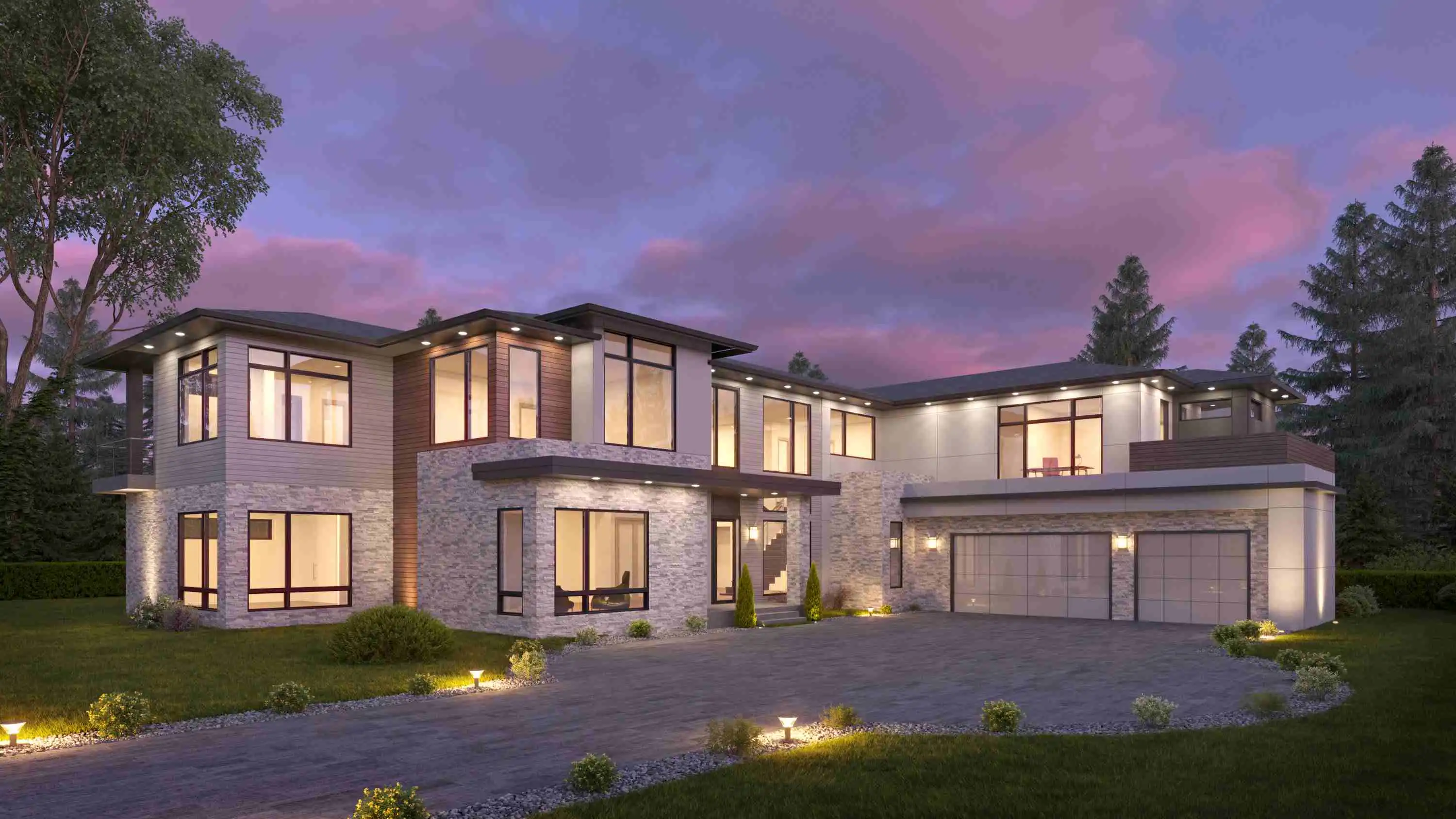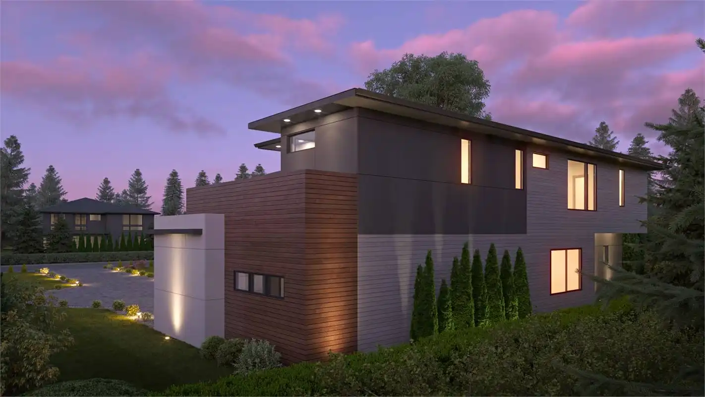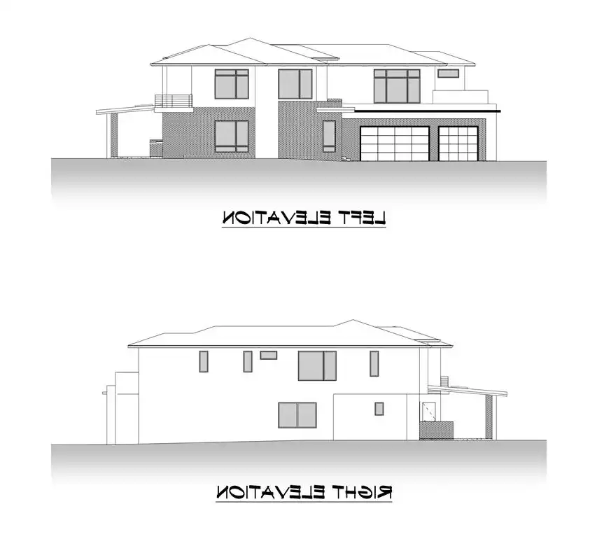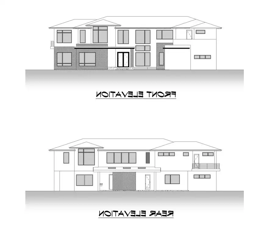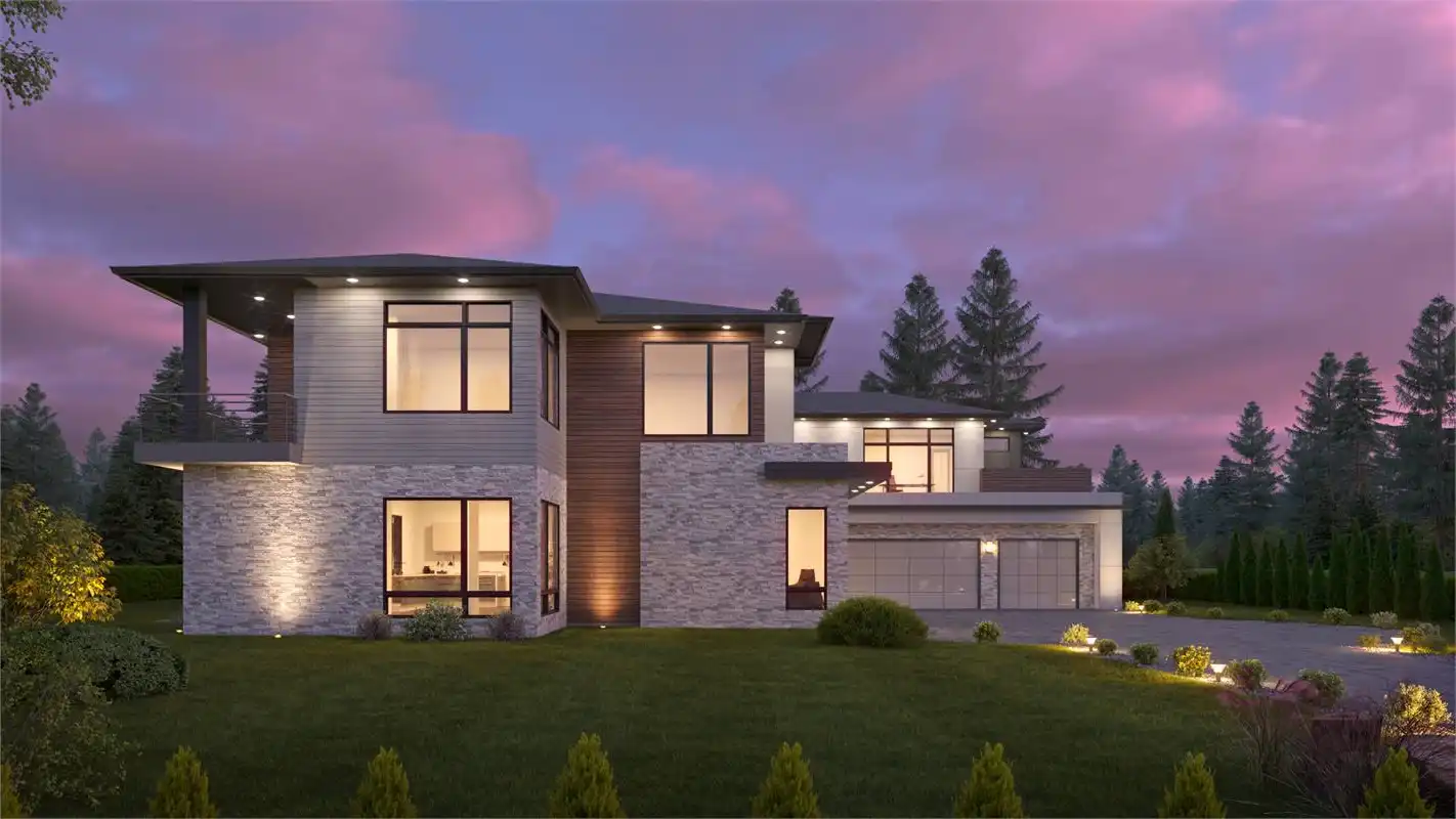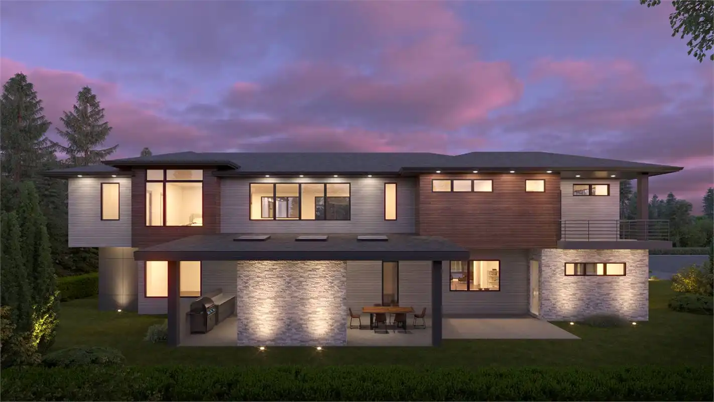 Stunning two story modern house plan features 5,594 square feet with 5 beds and 6.5 baths. The floor plan offers a perfect mix of luxury with functional livability. A two-story family room with a bridge walkway on the 2nd level offers exceptional views and natural light. The kitchen features a large prep island, spice kitchen and large walk-in pantry, perfect for those that love to cook and entertain. A formal dining room opens to a large patio. Upstairs you’ll find 4 bedrooms including a secluded master suite with private balcony. Three large ensuite bedrooms and loft that leads to a large open deck are separated by a walkway that leads to a secluded master suite with balcony.