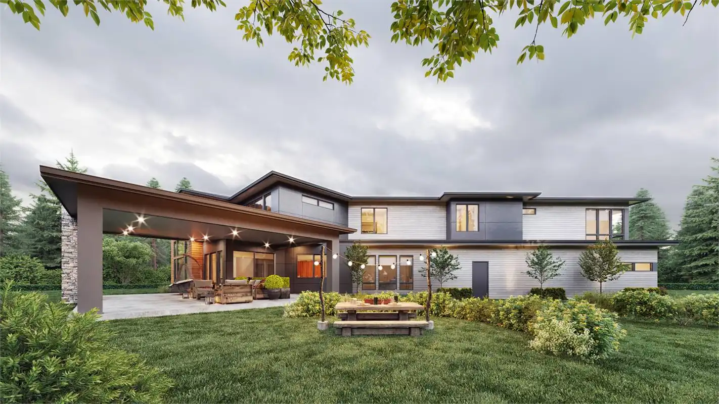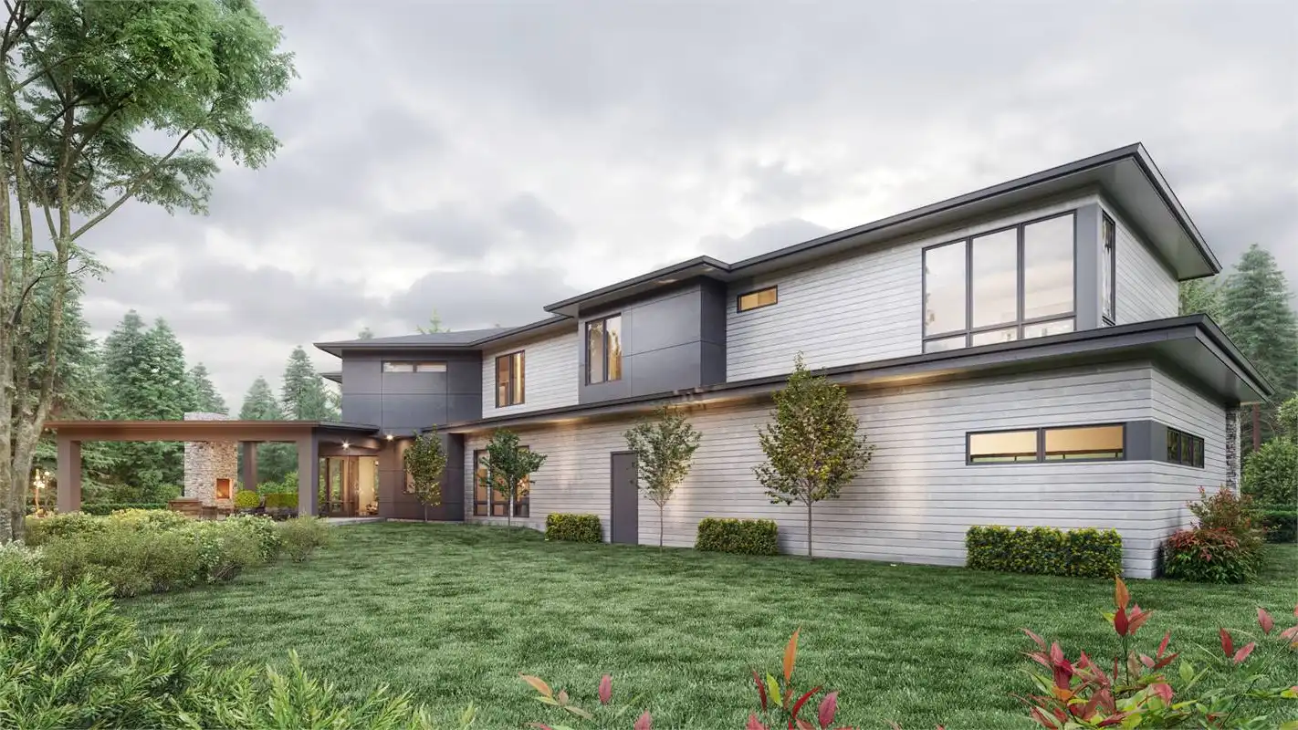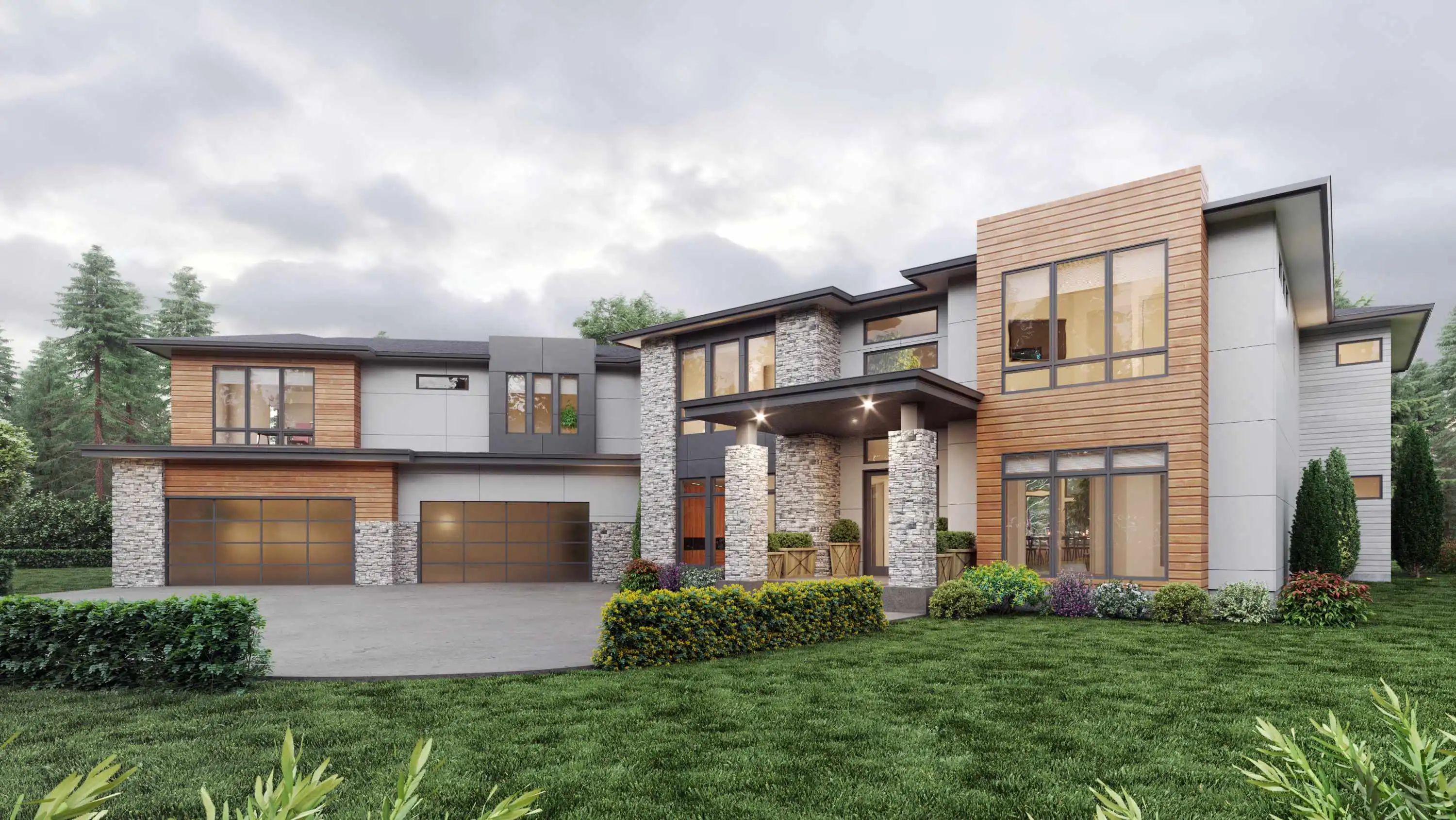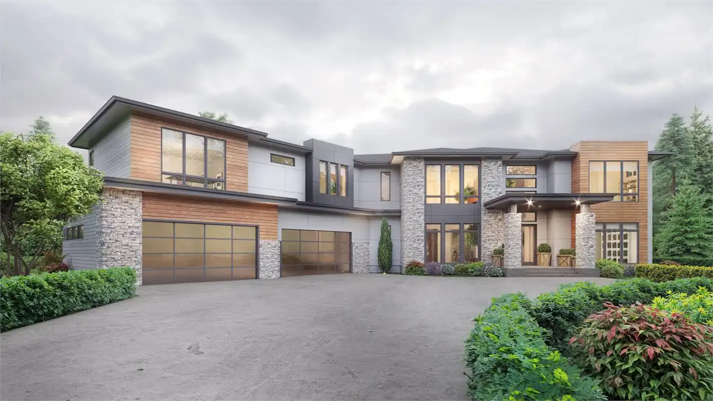 This two-story 5- bedroom luxury house plan with an angled 4-car garage spans 7,061 square feet of living space and expertly combines modern aesthetics with practicality. The main level boasts an open floor plan that seamlessly merges the kitchen and two-story great room and foyer with curved staircase. The kitchen is equipped with high-end appliances, ample counter space, a large island and cozy breakfast nook. Additionally, the main level includes a private studio, home office and guest suite. The second floor features a private master suite with a large walk-in closet and a secret room to store your valuables. A laundry room, rec room and three bedrooms complete the layout of the second floor.