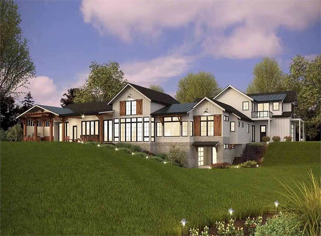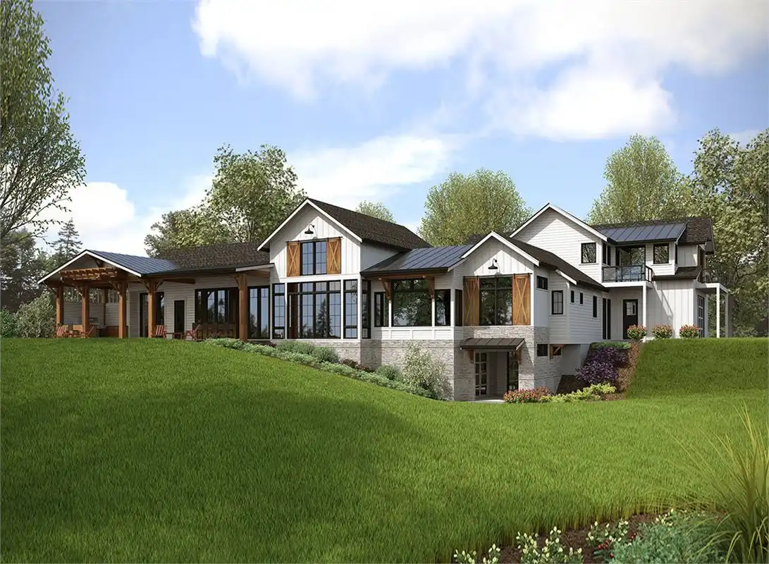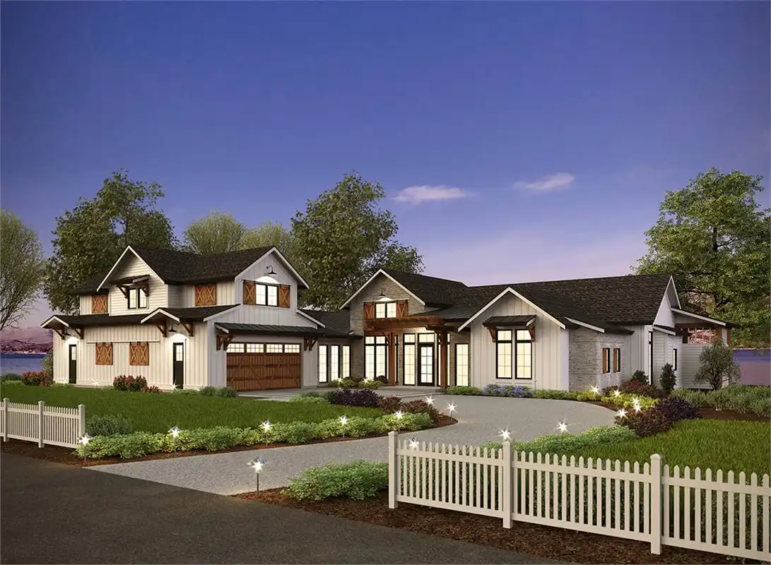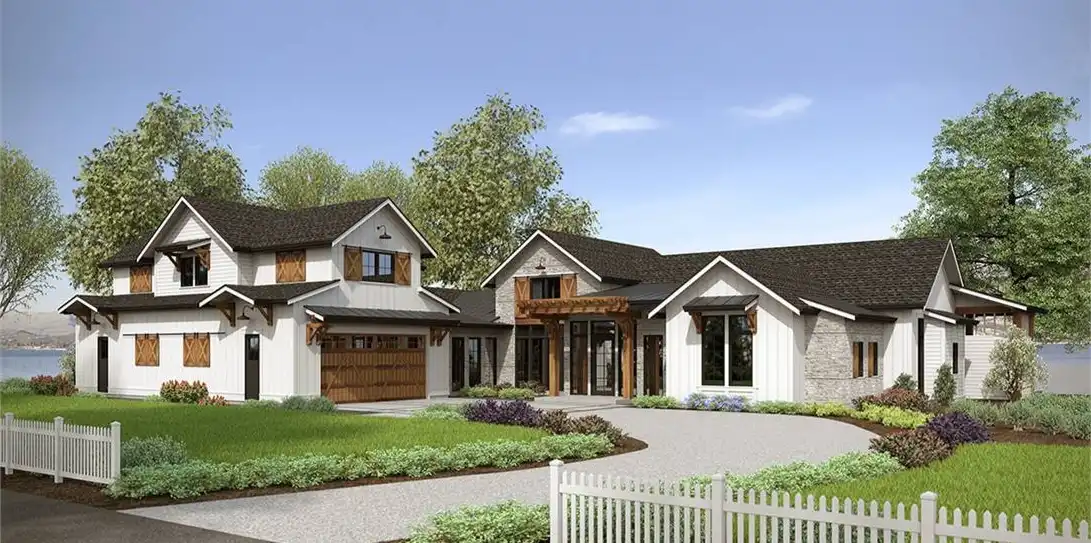 The perfect plan for the family looking to stretch out and grow for years to come, this luxurious rustic farmhouse is packed full of special features. Standing 3-stories tall and boasting an impressive 6,589 square feet of space, the 5 bed 4.5 bath layout has so much to offer. Beginning with the main level you'll find great entertainment capabilities throughout. A massive great room joins seamlessly with the gourmet island kitchen and dining room before opening out to the covered back deck with its grilling station and indoor/outdoor bar top seating. And speaking of bars, check out the all-inclusive bar area which comes standard with the family den towards the rear of the home! Also on the first floor are the guest and master suites along with a 4-car garage. Atop the garage sits a second level featuring two more bedrooms and a bonus room with dual balconies. Finally, the lowest level offers a craft room, bathroom, walkout patio and tons of storage that is readily accessible.