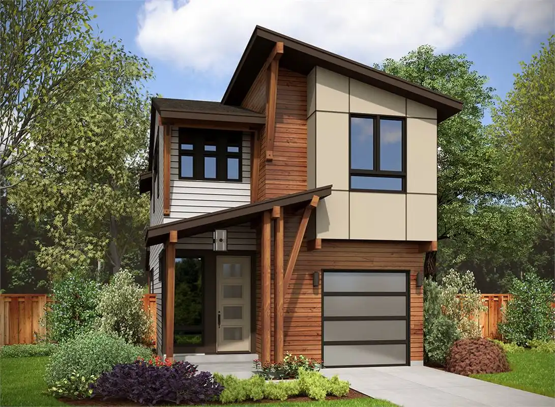 A beautiful medley of sensible spaces, gorgeous modern styles, and total affordability, this contemporary build has it all! Great for an urban or city environment thanks to its narrow footprint, this 1,736 square foot design has a lot of features that are rarities in similar builds. Beginning with the parking situation, this home actually has an attached garage. Something like that is practically unheard of in the city and will make the home's value instantly increase. Inside, the main floor is totally open, finding the living room, island kitchen, and dining rooms all seamlessly joined together. Upstairs houses the 2 bedrooms and 2 full bathrooms. This includes a gorgeous master suite with a lovely spa bath and a private walk-in closet.