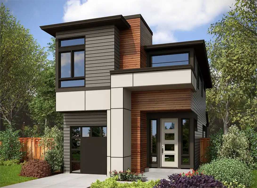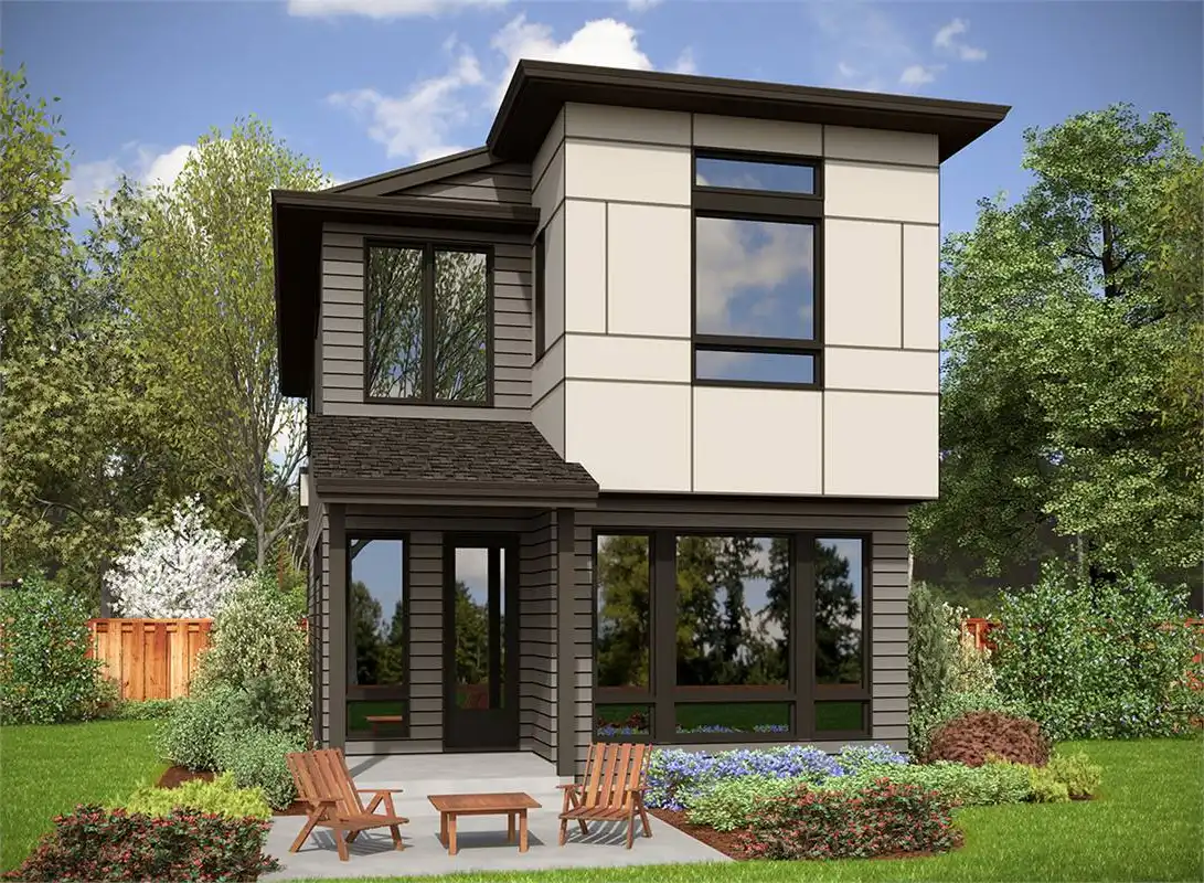 With styles that are often reserved for the finest of modern art museums, this eye-catching family plan is a special find. Standing 2-stories tall and providing 1,736 square feet of living space, the 3 bed 2.5 bath modern home plan is perfect for that new or growing family. Plus, the narrow footprint allows for it to be built on practically any lot, regardless of shape or size. The first level offers an attached garage along with a totally open living room, dining room, and island kitchen combination space. Meanwhile, the upper floor provides all 3 bedrooms, including the master with its fully private spa bath and sizeable walk-in closet, all for your convenience!