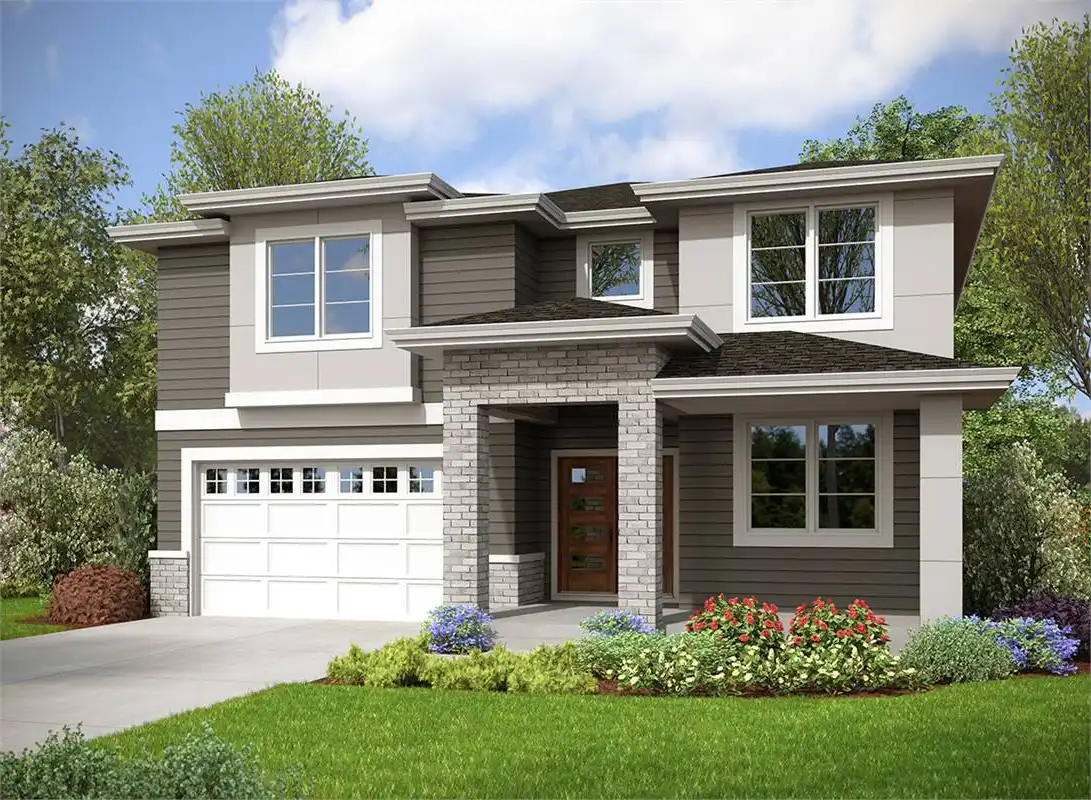 This contemporary house plan is the perfect place to call your own. With 3,301 square feet of living space and a welcoming floor plan with 5 bedrooms and 3.5 bathrooms, this home is sure to accommodate your lifestyle and budget. The spacious kitchen with a large center island flows right into the great room, which is complete with a fireplace. This open-concept area is perfect for gathering family and friends, especially since the great room opens onto a spacious deck that lets you take the celebration outdoors! Overnight visitors will find the main floor guest suite, with a walk-in closet and en suite bath, private and tranquil. Upstairs the master suite area is perfect for two – dual sinks in the en suite bathroom, as well as dual walk-in closets so everyone has plenty of space for storage! The laundry room upstairs was added for your convenience, as well as the bonus room waiting to be used for movie or game nights. Carmichael has 3 additional bedrooms upstairs, two of which have walk-in closets. Out front, you’ll find a two-car garage and a welcoming covered front porch, giving Carmichael ample appeal both inside and out.