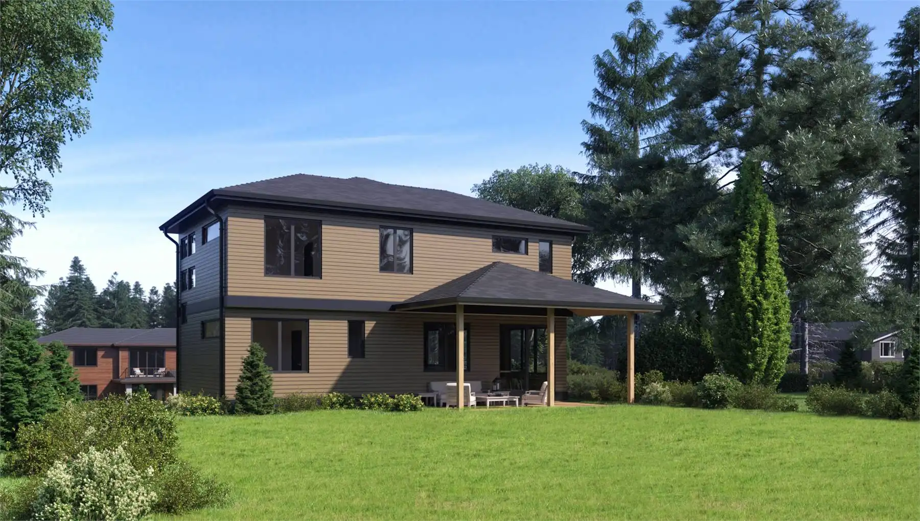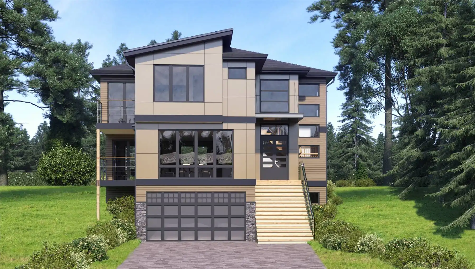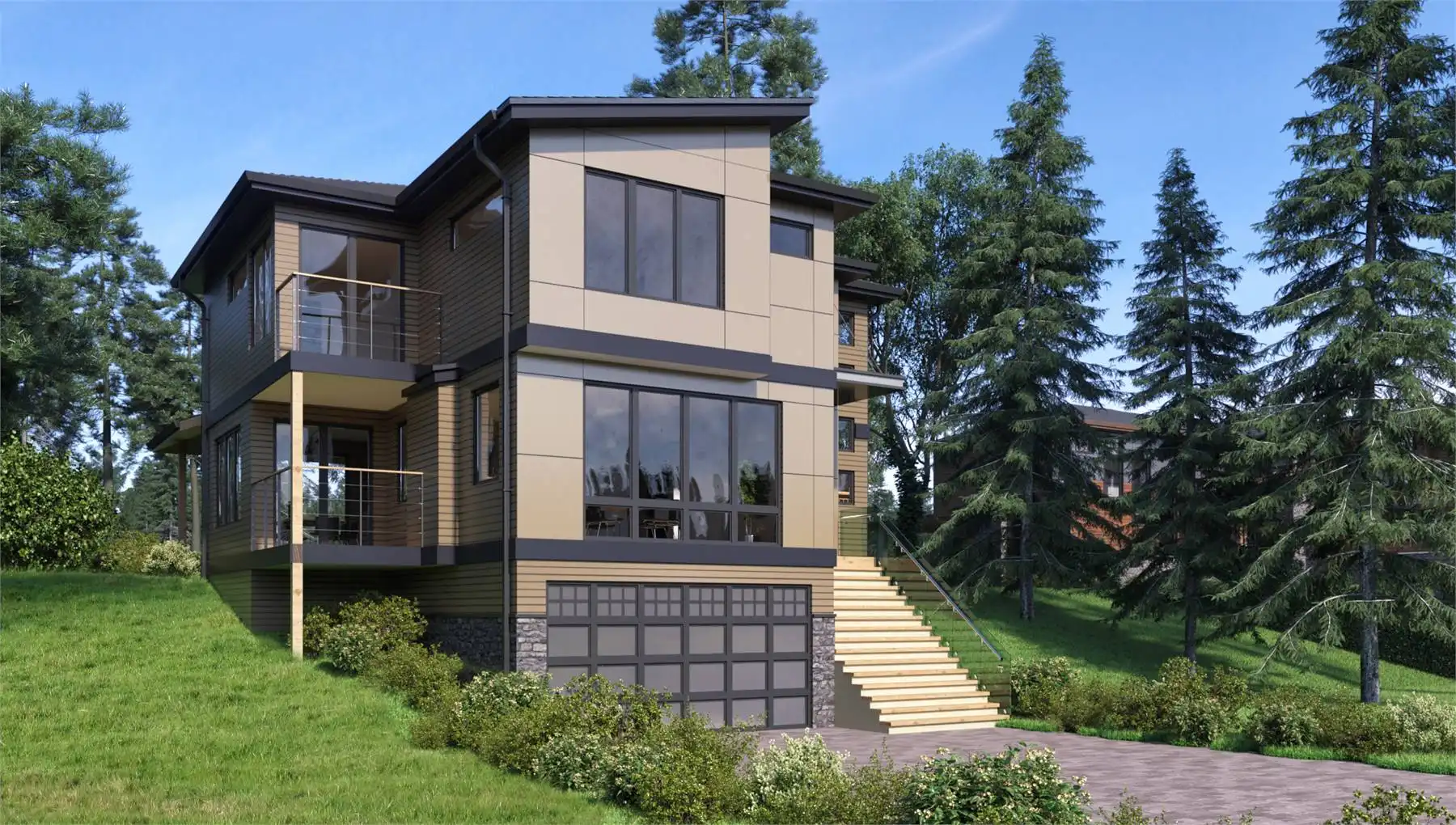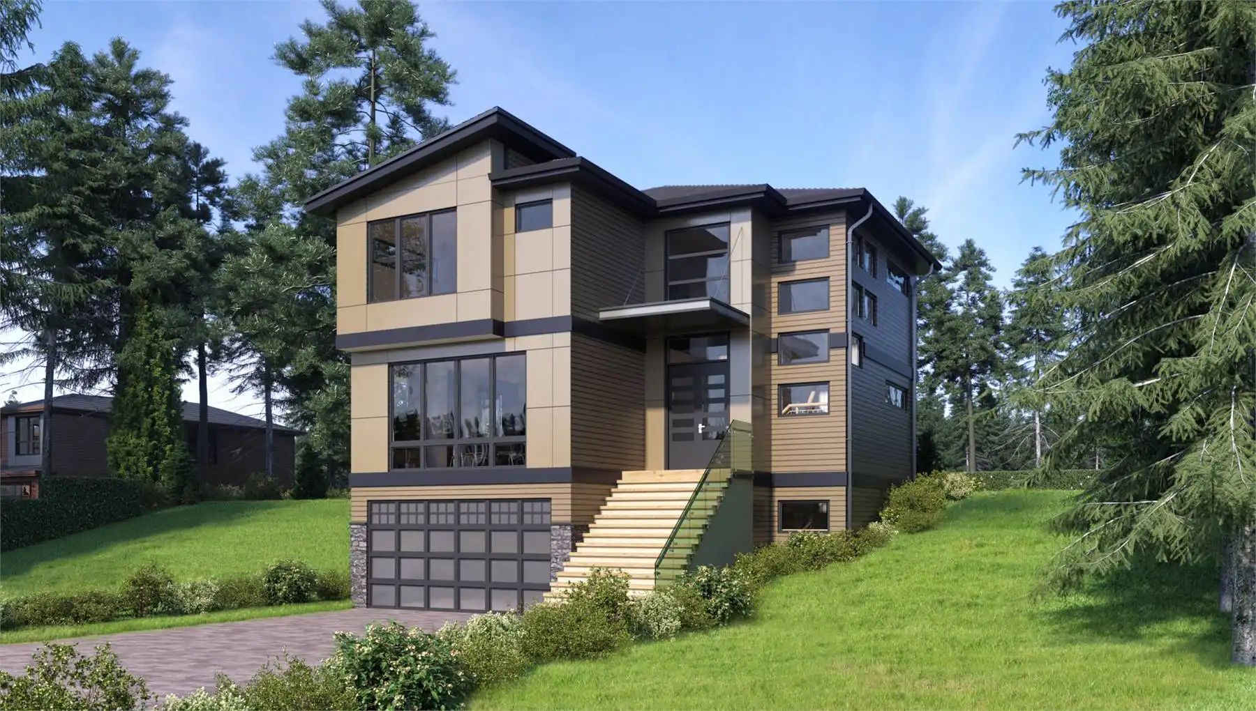 House Plan 1347 makes a wonderful choice if you're looking for a drive-under contemporary home that will adapt to a slope! You'll find a two-car garage and a mudroom at the lowest level, and from there, 2,329 square feet stack up on a compact footprint. The main level includes an office, powder room, and open living that combines the island kitchen, great room, and dining area into one space. All three bedrooms are upstairs and include a five-piece primary suite and two bedrooms that share a hall bath. The laundry is also conveniently placed with the bedrooms. House Plan 1347 has some outdoor space between the two small decks in front and the covered patio in back, too!