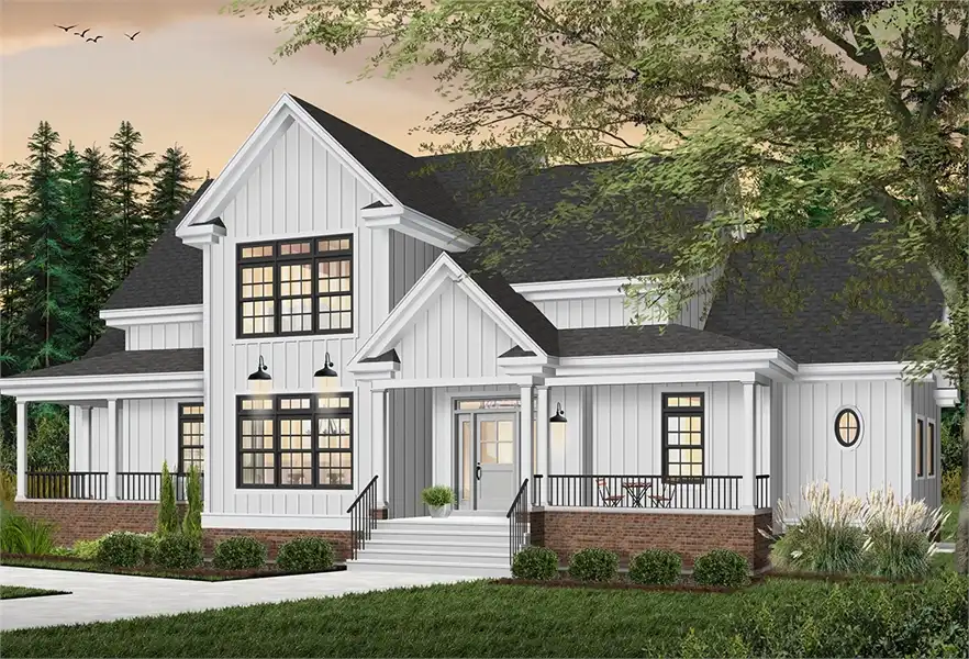 This two-story house plan may be exactly what you think of when you picture a farmhouse. The sidelighted foyer ushers guests into the versatile family room or the formal dining room. A nearby powder room allows them to freshen up after a long drive. The island kitchen includes a handy pantry. The breakfast nook feels like a sunroom, with natural light pouring in. Could the main-floor master suite be more posh? Sliding glass doors grant outdoor access. A quiet study or office could sleep overnight guests. More bedrooms and baths are located on the upper floor, along with a storage room.