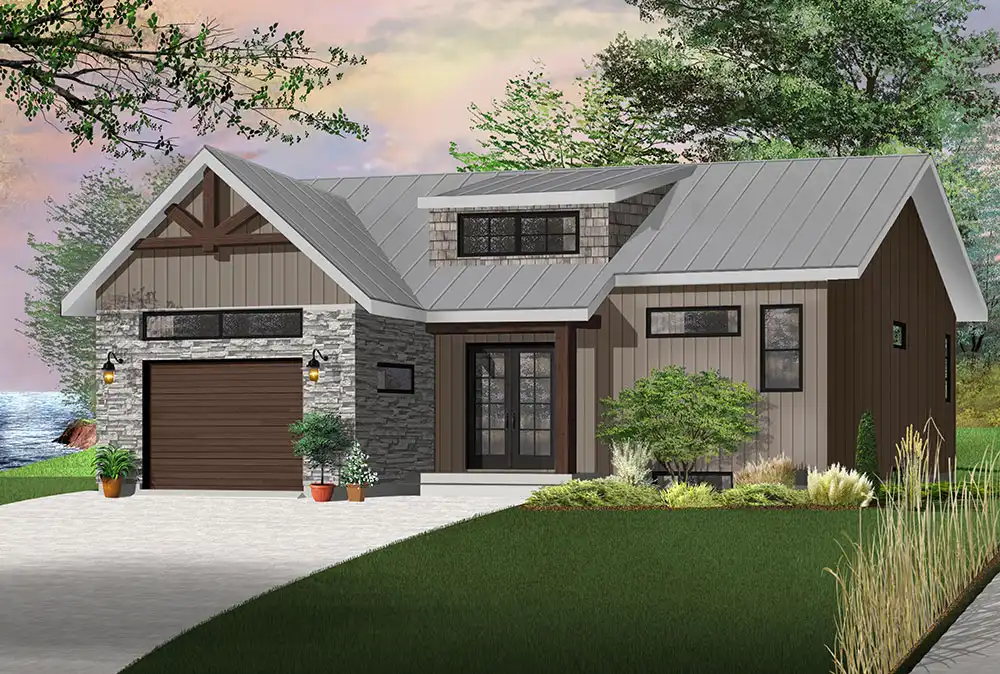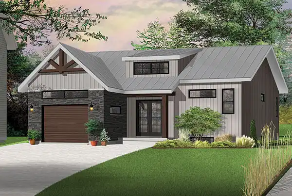 Interesting details give this one-story home design a Craftsman feel. You'll find a split entry, because the foyer lies between the two levels of the home. The daylight basement is downstairs. Go up from the foyer to the main level of the home. The island kitchen serves any meal with style and ease. Relax in the great room when friends drop in to chat. The two bedrooms are separated for privacy. Note that the luxurious bath includes laundry facilities.