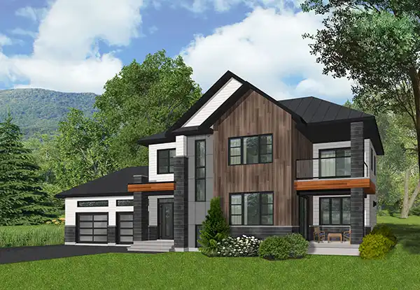 Varied materials give smooth lines to the exterior of this three-bedroom contemporary design. The air-lock entry includes a handy coat closet. A nearby powder room allows guests to freshen up. The central kitchen showcases a large island with snack space for five. The great room enjoys a focal-point fireplace. Sliding glass doors in the dining room allow you to step outside for a breath of fresh air after dinner. Upstairs, the master suite boasts a walk-in closet and a private bath. Two additional bedrooms share a remarkable bath.